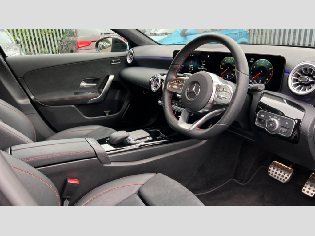 Mercedes-Benz A Class A200 AMG Line Executive 4dr Auto 10.25" Digital instrument cluster display screen, 10.25" media display, 180 degree rear view camera with parking guidelines, Active parking assist with visual and audible warning of detected obstacles, Attention assist, Brake pad wear indicator warning light, Car wash mode, Cruise control + speed limiter, Direct steering, Dual bluetooth interfaces, DYNAMIC SELECT with a choice of driving modes (ECO, Comfort, Sport and Individual), ECO start/stop function, Fluid level warning indicator for fuel, oil, coolant and washer fluid, Hard-disk navigation, Hey Mercedes Voice activation, Lamp failure indicator, Lane keeping system, Mercedes me connect including emergency call system, accident recovery, breakdown and maintenance management, Mercedes me remote services, Outside temperature gauge, Owners manual in English, Pre-installation for private car sharing, Preinstallation for Mercedes Benz link, Service indicator (ASSYST), Smartphone integration with Apple CarPlay and Android auto, Speed limit assist, Speed sensitive power steering, Trip computer, Ultrasonic sensors positioned in the front and rear bumpers, Lowered comfort suspension, Rear axle torsion beam, 2 USB ports (type C) in rear stowage compartment and one in front of center console, 6 speakers, DAB Digital radio, MBUX multimedia system with DAB digital radio and touchpad including satellite navigation, Mercedes-Benz sound system - 100W, 4 Electric Front and Rear windows, Adaptive brake lights, AMG bodystyling - Front apron with splitter in chrome, rear apron with chrome trim and chrome visible trim elements in tailpipe, Automatic headlights, Black weather strip, Body colour bumpers, Body colour door handles with chrome inserts, Body colour side skirt, Electric adjustable and heated door mirrors with integrated LED side indicators, Exclusive diamond radiator grille, Exhaust system - Twin visible tailpipes in polished stainless steel, Headlamp assist automatic headlamp activation, Heated glass rear windscreen + timer control, LED high performance headlamps with integrated LED daytime running lights, LED tail lamp, Privacy glass, Radio aerial, Rain sensing windscreen wipers with two sensitivity settings, Rear boot, Rear fog lights, Rear side wing doors, Third brake light featuring LED technology, 3 seat bench in 2nd row, 3 Spoke flat bottom leather multi function steering wheel with perforated leather in grip area, 40:20:40 split folding rear seats, Artico man-made leather/Microfibre Dinamica upholstery with red contrast stitching, Auto Mercedes-Benz child seat recognition sensor, Black air vents with surround in silver chrome, Black roof lining, Brushed stainless steel sports pedals with rubber studs, Controller on centre console with chrome surround, Floor mats with AMG lettering, Front centre armrest with storage compartment, Front seat backs luggage nets, Front sports seats with adjustable head restraints, Galvanished gear shift paddles on steering wheel, Heated front seats, Height/reach adjustable steering column, Illuminated Mercedes Benz lettering front door sills with changeable cover, Interior lighting - 64 colour Ambient lighting, Interior mirror with reading lamps in black and frameless, Manual height adjustable front seats, Rear head restraints, Seat occupancy sensor for front passenger seat, Single front passenger seat, Stowage compartment in centre console with retractable cover, Sunvisors with illuminated vanity mirrors, Touchpad on center console, Twin front cupholders, Two zone thermotronic luxury automatic climate control, Light and sight pack - A Class, Mirror package - A Class, Night pack - A Class Saloon/Hatchback, Seat comfort pack - A Class, 3 rear 3 point seatbelts, ABS with Brake Assist, Active bonnet, Active brake assist includes forward collision warning system with autonomous braking, Adaptive brake assist with hold function and hill start assist, Black seatbelts, Childproof locks manually operated for rear doors and electrically operated for rear power windows, Crash responsive emergency lighting, Driver and passenger head and side airbags, Drivers knee airbag, Dual stage driver/passenger airbags, Electronic parking brake, ESP curve dynamic assist, ESP with ASR, Front and rear seatbelt reminder, Front brake callipers with Mercedes Benz lettering, ISOFIX and top tether child seat fixing points in two outer rear seats, Tyre pressure monitoring system, Warning triangle and first aid kit, Window airbags, Alarm system/interior protection/immobiliser, Keyless Go, Remote central locking and crash sensor with emergency opening function, Urban guard vehicle protection system with immobiliser and interior protection, Matrix look light longitudinal grain aluminium trim element, 18" AMG 5 twin spoke light alloy wheels aerodynamically optimised painted in black with highsheen finish, Summer tyres, Tirefit sealant kit