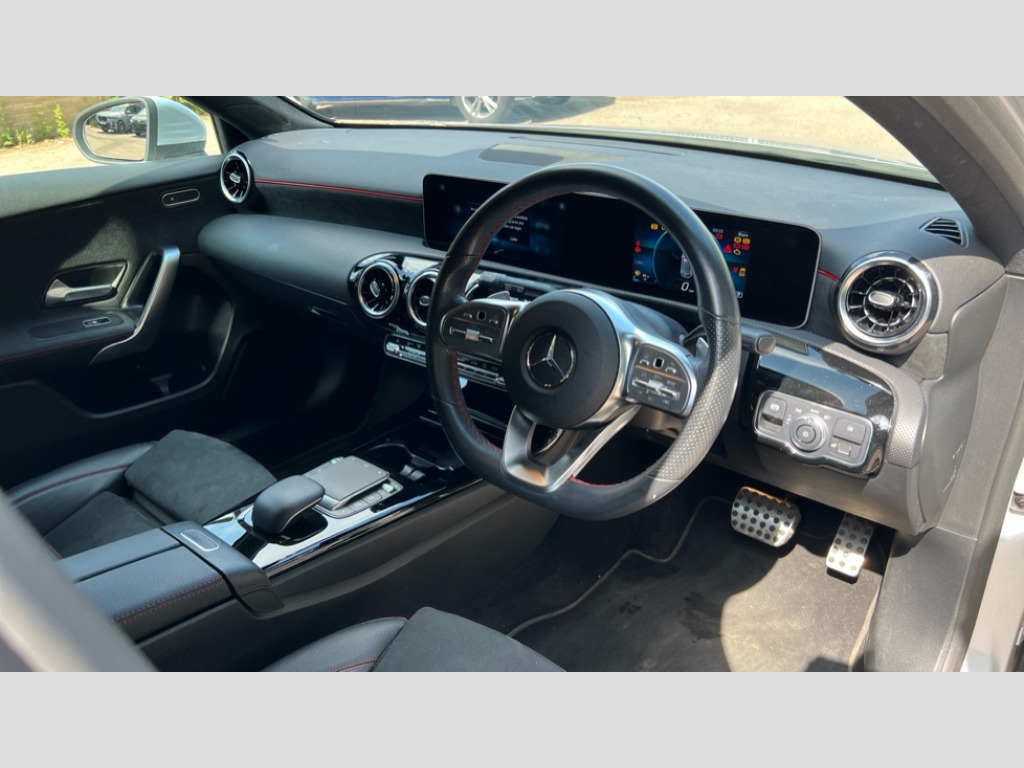 Mercedes-Benz A Class A200 AMG Line Executive 5dr Auto 10.25" media display, 180 degree rear view camera with parking guidelines, 7" colour screen in instrument panel, Active lane keep assist, Active park assist with parktronic system including front and rear parking sensors, Attention assist, Brake pad wear indicator warning light, Cruise control + speed limiter, Direct steering, Dual bluetooth interfaces, DYNAMIC SELECT with a choice of driving modes (ECO, Comfort, Sport and Individual), ECO start/stop function, Fluid level warning indicator for fuel, oil, coolant and washer fluid, Hard-disk navigation, Hey Mercedes Voice activation, Lamp failure indicator, Mercedes me connect including emergency call system, accident recovery, breakdown and maintenance management, Outside temperature gauge, Owners manual in English, Pre-installation for private car sharing, Pre-installation for Vehicle Monitoring, Pre-installation for Vehicle Setup, Preinstallation for Mercedes Benz link, Service indicator (ASSYST), Smartphone integration with Apple CarPlay and Android auto, Speed sensitive power steering, Trip computer, Wireless charging, Lowered comfort suspension, Rear axle multi-link, 2 USB ports (type C) in rear stowage compartment and one in front of center console, 6 speakers, DAB Digital radio, MBUX multimedia system with DAB digital radio and touchpad including satellite navigation, Mercedes-Benz sound system - 100W, 4 Electric Front and Rear windows, Adaptive brake lights, AMG bodystyling - Front apron with splitter in chrome, rear apron with chrome trim and chrome visible trim elements in tailpipe, Black weather strip, Body colour bumpers, Body colour door handles, Body colour side skirt, Body coloured door mirrors, Chrome beltline trim, Diamond radiator grille with chrome pins and silver louvre + chrome insert, Electric adjustable and heated door mirrors with integrated LED side indicators, Exhaust system - Twin visible tailpipes in polished stainless steel, Headlamp assist automatic headlamp activation, Heated glass rear windscreen + timer control, LED high performance headlamps with integrated LED daytime running lights, LED tail lamp, LED third brake light, Privacy glass, Radio aerial, Rain sensing windscreen wipers with two sensitivity settings, Rear fog lights, Rear wiper, Window line trim strip in chrome, 3 Spoke flat bottom leather multi function steering wheel with perforated leather in grip area, 40:20:40 split folding rear seats, Artico man-made leather/Microfibre Dinamica upholstery with red contrast stitching, Auto Mercedes-Benz child seat recognition sensor, Black air vents with surround in silver chrome, Black roof lining, Brushed stainless steel sports pedals with rubber studs, Controller on centre console with chrome surround, Floor mats with stitched edging and AMG lettering, Front centre armrest with storage compartment, Front door sills with Mercedes Benz lettering, Front seat backs luggage nets, Front seat cushion length adjustment, Galvanished gear shift paddles on steering wheel, Heated front seats, Height/reach adjustable steering column, Manual height adjustable front seats, Rear head restraints, Seat occupancy sensor for front passenger seat, Spectacles compartment for driver, Sports seats with integrated headrests, Stowage compartment in centre console with retractable cover, Sunvisors with illuminated vanity mirrors, Touchpad on center console, Twin front cupholders, Two zone thermotronic luxury automatic climate control, Light and sight pack - A Class, Mirror package - A Class, Seat comfort pack - A Class, 3 rear 3 point seatbelts, ABS with Brake Assist, Active bonnet, Active brake assist includes forward collision warning system with autonomous braking, Adaptive brake assist with hold function and hill start assist, Black seatbelts, Childproof locks manually operated for rear doors and electrically operated for rear power windows, Crash responsive emergency lighting, Driver and passenger head and side airbags, Drivers knee airbag, Dual stage driver/passenger airbags, Electronic parking brake, ESP curve dynamic assist, ESP with ASR, Front and rear seatbelt reminder, Front brake callipers with Mercedes Benz lettering, ISOFIX and top tether child seat fixing points in two outer rear seats, Tyre pressure monitoring system, Warning triangle and first aid kit, Window airbags, Alarm system/interior protection/immobiliser, Keyless Go, Remote central locking and crash sensor with emergency opening function, Dinamica microfibre trim in black, 18" AMG 5 twin spoke light alloy wheels in titanium grey with highsheen finish, Summer tyres, Tirefit sealant kit