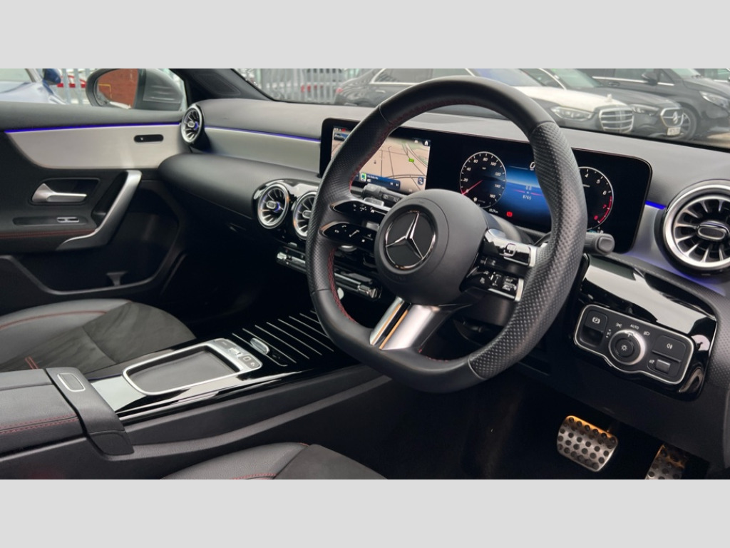 Mercedes-Benz A Class A200 AMG Line Executive 5dr Auto 10.25 inch touchscreen central media display, 10.25" Digital instrument cluster display screen, Attention assist, Blind spot assist, Brake pad wear indicator warning light, Car wash mode, Cruise control + speed limiter, Direct steering, Direction indicators with lane change function, Dual bluetooth interfaces, DYNAMIC SELECT with a choice of driving modes (ECO, Comfort, Sport and Individual), ECO start/stop function, Engine start/stop button, Fingerprint scanner, Fluid level warning indicator for fuel, oil, coolant and washer fluid, Fluorescent jacket for driver, Hard-disk navigation, Hey Mercedes Voice activation, Lamp failure indicator, Lane keeping system, Mercedes me connect including emergency call system, accident recovery, breakdown and maintenance management, Mercedes me remote services, Outside temperature gauge, Owners manual in English, Pre-installation of private car share, Remote boot closing, Service indicator (ASSYST), Smartphone integration with Apple CarPlay and Android auto, Speed limit assist, Speed sensitive power steering, Tailgate, Trip computer in multifunction display with current consumption indicator, Wireless charging, Lowered comfort suspension, DAB Digital radio, MBUX multimedia system, Mercedes Benz sound system (100 W) with 6 speakers, 4 Electric Front and Rear windows, Adaptive brake lights, AMG body styling - AMG front apron with front splitter and AMG rear apron and visible exhaust tailpipe trim elements, Body colour bumpers, Body colour door handles with chrome inserts, Body colour side skirt, Chrome beltline strips, Diamond radiator grille with pins in fine star pattern, Electric adjustable and heated door mirrors with integrated LED side indicators, Exhaust system with 2 visible tailpipe trim elements and rear apron, Headlamp assist automatic headlamp activation, Heated glass rear windscreen + timer control, LED High level third brake light, LED High Performance headlamps including integral LED daytime running lamps and adaptive highbeam assist, LED tail lamp, Privacy glass, Radio aerial, Rain sensing windscreen wipers with two sensitivity settings, Rear fog lights, Rear side wing doors, Rear windscreen wiper, Window line trim strip in chrome, 3 seat bench in 2nd row, 3 Spoke flat bottom leather multi function steering wheel with perforated leather in grip area, 4 way lumbar support, 40:20:40 split folding rear seats, Air conditioning - One zone THERMATIC automatic climate control with automatically controlled air distribution, AMG floor mats, Artico man-made leather/Microcut microfibre upholstery, Automatic child seat recognition sensor, Black air vents with surround in silver chrome, Black roof lining, Brushed stainless steel sports pedals with rubber studs, Front centre armrest with stowage, Front door sills with Mercedes Benz lettering, Front seat backs luggage nets, Galvanished gear shift paddles on steering wheel, Heated front seats, Height/reach adjustable steering column, Interior lighting - 64 colour Ambient lighting, Interior mirror with reading lamps in black and frameless, Rear armrest with 2 cupholders, Rear head restraints, Seat occupancy sensor for front passenger seat, Single front passenger seat, Sports seats with integrated headrests, Stowage compartment in centre console with retractable cover, Sunvisors with illuminated vanity mirrors, Twin front cupholders, Light and sight package - A Class, Mirror package - A Class, Parking pack with 180 degree view - A Class, Seat comfort pack - A Class, USB pack plus - A Class, 3 rear 3 point seatbelts, ABS with Brake Assist, Active bonnet, Active brake assist includes forward collision warning system with autonomous braking, Adaptive brake assist with hold function and hill start assist, Black seatbelts, Bonnet with power domes, Childproof locks manually operated for rear doors and electrically operated for rear power windows, Crash responsive emergency lighting, Driver and passenger head and side airbags, Drivers knee airbag, Dual stage driver/passenger airbags, Electronic parking brake, ESP curve dynamic assist, ESP with ASR, Front and rear seatbelt reminder, ISOFIX and top tether child seat fixing points in two outer rear seats, Tyre pressure monitoring system, Warning triangle and first aid kit, Window airbags, Alarm system/interior protection/immobiliser, Guard 360 degree vehicle protection, Keyless entry lock/unlock, Keyless Go, Remote central locking and crash sensor with emergency opening function, Light longitudinal grain aluminium trim, 18" AMG 5 twin spoke light alloy wheels,aerodynamically optimised, painted in black with high sheen finish, Summer tyres, Tirefit sealant kit