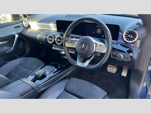Mercedes-Benz A Class A200 AMG Line Premium 5dr Auto 10.25" Digital instrument cluster display screen, 10.25" media display, 180 degree rear view camera with parking guidelines, Active parking assist with visual and audible warning of detected obstacles, Attention assist, Brake pad wear indicator warning light, Car wash mode, Cruise control + speed limiter, Direct steering, Dual bluetooth interfaces, DYNAMIC SELECT with a choice of driving modes (ECO, Comfort, Sport and Individual), ECO start/stop function, Fluid level warning indicator for fuel, oil, coolant and washer fluid, Hard-disk navigation, Hey Mercedes Voice activation, Lamp failure indicator, Lane keeping system, Mercedes me connect including emergency call system, accident recovery, breakdown and maintenance management, Mercedes me remote services, Outside temperature gauge, Owners manual in English, Pre-installation for private car sharing, Preinstallation for Mercedes Benz link, Service indicator (ASSYST), Smartphone integration with Apple CarPlay and Android auto, Speed limit assist, Speed sensitive power steering, Trip computer, Ultrasonic sensors positioned in the front and rear bumpers, Lowered comfort suspension, Rear axle torsion beam, 2 USB ports (type C) in rear stowage compartment and one in front of center console, 6 speakers, DAB Digital radio, MBUX multimedia system with DAB digital radio and touchpad including satellite navigation, Mercedes-Benz sound system - 100W, 4 Electric Front and Rear windows, Adaptive brake lights, AMG bodystyling - Front apron with splitter in chrome, rear apron with chrome trim and chrome visible trim elements in tailpipe, Automatic headlights, Black weather strip, Body colour bumpers, Body colour door handles with chrome inserts, Body colour side skirt, Electric adjustable and heated door mirrors with integrated LED side indicators, Exclusive diamond radiator grille, Exhaust system - Twin visible tailpipes in polished stainless steel, Headlamp assist automatic headlamp activation, Heated glass rear windscreen + timer control, LED High level third brake light, LED high performance headlamps with integrated LED daytime running lights, LED tail lamp, Privacy glass, Radio aerial, Rain sensing windscreen wipers with two sensitivity settings, Rear fog lights, Rear side wing doors, Rear wiper, 3 seat bench in 2nd row, 3 Spoke flat bottom leather multi function steering wheel with perforated leather in grip area, 40:20:40 split folding rear seats, Artico man-made leather/Microfibre Dinamica upholstery with red contrast stitching, Auto Mercedes-Benz child seat recognition sensor, Black air vents with surround in silver chrome, Black roof lining, Brushed stainless steel sports pedals with rubber studs, Controller on centre console with chrome surround, Floor mats with AMG lettering, Front centre armrest with storage compartment, Front seat backs luggage nets, Galvanished gear shift paddles on steering wheel, Heated front seats, Height/reach adjustable steering column, Illuminated Mercedes Benz lettering front door sills with changeable cover, Interior lighting - 64 colour Ambient lighting, Interior mirror with reading lamps in black and frameless, Manual height adjustable front seats, Rear armrest with 2 cupholders, Rear head restraints, Seat occupancy sensor for front passenger seat, Single front passenger seat, Sports seats with integrated headrests, Stowage compartment in centre console with retractable cover, Sunvisors with illuminated vanity mirrors, Touchpad on center console, Twin front cupholders, Two zone thermotronic luxury automatic climate control, Light and sight pack - A Class, Mirror package - A Class, Night pack - A Class Saloon/Hatchback, Seat comfort pack - A Class, 3 rear 3 point seatbelts, ABS with Brake Assist, Active bonnet, Active brake assist includes forward collision warning system with autonomous braking, Adaptive brake assist with hold function and hill start assist, Black seatbelts, Childproof locks manually operated for rear doors and electrically operated for rear power windows, Crash responsive emergency lighting, Driver and passenger head and side airbags, Drivers knee airbag, Dual stage driver/passenger airbags, Electronic parking brake, ESP curve dynamic assist, ESP with ASR, Front and rear seatbelt reminder, Front brake callipers with Mercedes Benz lettering, ISOFIX and top tether child seat fixing points in two outer rear seats, Tyre pressure monitoring system, Warning triangle and first aid kit, Window airbags, Alarm system/interior protection/immobiliser, Keyless entry lock/unlock, Keyless Go, Remote central locking and crash sensor with emergency opening function, Urban guard vehicle protection system with immobiliser and interior protection, Matrix look light longitudinal grain aluminium trim element, 18" AMG 5 twin spoke light alloy wheels aerodynamically optimised painted in black with highsheen finish, Summer tyres, Tirefit sealant kit