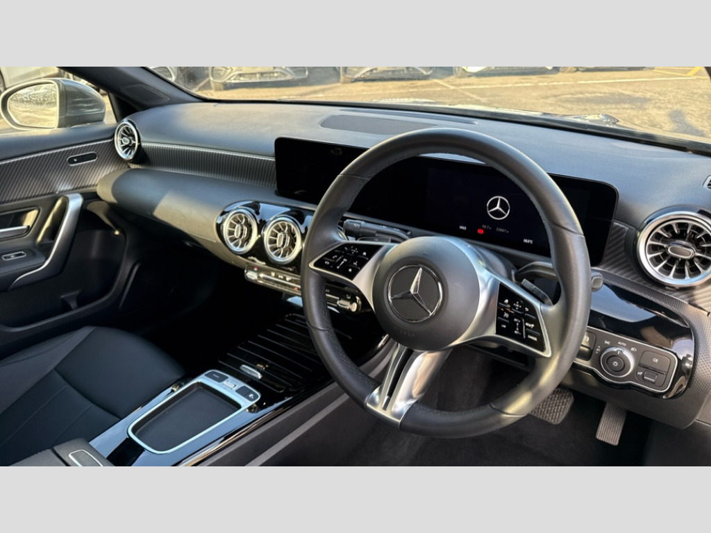 Mercedes-Benz A Class A200 Sport Executive 4dr Auto 10.25 inch touchscreen central media display, 10.25" Digital instrument cluster display screen, Attention assist, Brake pad wear indicator warning light, Car wash mode, Cruise control + speed limiter, Direct steering, Direction indicators with lane change function, Dual bluetooth interfaces, DYNAMIC SELECT with a choice of driving modes (ECO, Comfort, Sport and Individual), ECO start/stop function, Engine start/stop button, Fluid level warning indicator for fuel, oil, coolant and washer fluid, Hard-disk navigation, Hey Mercedes Voice activation, Lamp failure indicator, Lane keeping system, Mercedes me connect including emergency call system, accident recovery, breakdown and maintenance management, Mercedes me remote services, Outside temperature gauge, Owners manual in English, Pre-installation of private car share, Preinstallation for Mercedes Benz link, Remote boot closing, Service indicator (ASSYST), Smartphone integration with Apple CarPlay and Android auto, Speed limit assist, Speed sensitive power steering, Trip computer in multifunction display with current consumption indicator, Wireless charging, Lowered comfort suspension, DAB Digital radio, MBUX multimedia system, Mercedes Benz sound system (100 W) with 6 speakers, 4 Electric Front and Rear windows, Adaptive brake lights, Body colour bumpers, Body colour door handles with chrome inserts, Body colour side skirt, Body coloured door mirrors, Chrome beltline strips, Diamond radiator grille with pins in fine star pattern, Electric adjustable and heated door mirrors with integrated LED side indicators, Exhaust system with 2 visible tailpipe trim elements and rear apron, Headlamp assist automatic headlamp activation, Heat insulating dark tinted rear and rear side windows, Heated glass rear windscreen + timer control, LED High Performance headlamps including integral LED daytime running lamps and adaptive highbeam assist, LED tail lamp, Privacy glass, Radio aerial, Rain sensing windscreen wipers with two sensitivity settings, Rear boot, Rear fog lights, Rear side wing doors, Third brake light featuring LED technology, Window line trim strip in chrome, 3 seat bench in 2nd row, 3 Spoke leather multi function steering wheel, 4 way lumbar support, 40:20:40 split folding rear seats, Air conditioning - One zone THERMATIC automatic climate control with automatically controlled air distribution, Artico man-made leather upholstery, Automatic child seat recognition sensor, Black air vents with surround in silver chrome, Black roof lining, Front centre armrest with stowage, Front comfort seats with adjustable head restraints, Front door sills with Mercedes Benz lettering, Front seat backs luggage nets, Gearshift paddles on steering wheel, Heated front seats, Height/reach adjustable steering column, Interior lighting - 64 colour Ambient lighting, Interior mirror with reading lamps in black and frameless, Rear armrest with 2 cupholders, Rear head restraints, Seat occupancy sensor for front passenger seat, Single front passenger seat, Stowage compartment in centre console with retractable cover, Sunvisors with illuminated vanity mirrors, Twin front cupholders, Velour floor mats, Keyless go comfort pack - A Class, Light and sight pack - A Class, Mirror package - A Class, Parking pack - A Class, Seat comfort pack - A Class, USB pack plus - A Class, 3 rear 3 point seatbelts, ABS with Brake Assist, Active bonnet, Active brake assist includes forward collision warning system with autonomous braking, Adaptive brake assist with hold function and hill start assist, Black seatbelts, Bonnet with power domes, Childproof locks manually operated for rear doors and electrically operated for rear power windows, Crash responsive emergency lighting, Driver and passenger head and side airbags, Drivers knee airbag, Dual stage driver/passenger airbags, Electronic parking brake, ESP curve dynamic assist, ESP with ASR, Front and rear seatbelt reminder, ISOFIX and top tether child seat fixing points in two outer rear seats, Tyre pressure monitoring system, Warning triangle and first aid kit, Window airbags, Alarm system/interior protection/immobiliser, Guard 360 degree vehicle protection, Remote central locking and crash sensor with emergency opening function, Dark carbon fibre interior trim, 17" 5 spoke light alloy wheels, aerodynamically optimised, painted in black with high sheen finish, Summer tyres, Tirefit sealant kit
