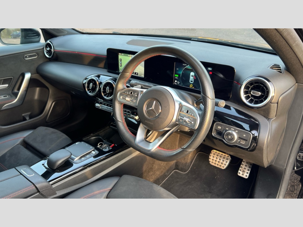 Mercedes-Benz A Class A250e AMG Line 4dr Auto 180 degree rear view camera with parking guidelines, 7" colour screen in instrument panel, 7" touchscreen media display, Acoustic ambient protection, Active lane keep assist, Attention assist, Brake pad wear indicator warning light, Car wash mode, Cruise control + speed limiter, Direct steering, Dual bluetooth interfaces, DYNAMIC SELECT with a choice of driving modes (ECO, Comfort, Sport and Individual), ECO start/stop function, Fluid level warning indicator for fuel, oil, coolant and washer fluid, Hard-disk navigation, Hey Mercedes Voice activation, Lamp failure indicator, Mercedes me connect including emergency call system, accident recovery, breakdown and maintenance management, Outside temperature gauge, Owners manual in English, Pre-installation for private car sharing, Pre-installation for Vehicle Monitoring, Pre-installation for Vehicle Setup, Preinstallation for Mercedes Benz link, Service indicator (ASSYST), Speed sensitive power steering, Trip computer, 7.4 kW monophase on board charger, Comfort suspension, Mode 3 charging cable 11 kW, Rear axle multi-link, 2 USB ports (type C) in rear stowage compartment and one in front of center console, 6 speakers, DAB Digital radio, MBUX multimedia system with DAB digital radio and touchpad including satellite navigation, Mercedes-Benz sound system - 100W, 4 Electric Front and Rear windows, Adaptive brake lights, AMG bodystyling - Front apron with splitter in chrome, rear apron with chrome trim and chrome visible trim elements in tailpipe, Black weather strip, Body colour bumpers, Body colour door handles, Body colour side skirt, Body coloured door mirrors, Chrome beltline trim, Diamond radiator grille with chrome pins and silver louvre + chrome insert, Electric adjustable and heated door mirrors with integrated LED side indicators, EQ badging, Exhaust system - Twin visible tailpipes in polished stainless steel, Headlamp assist automatic headlamp activation, Heated glass rear windscreen + timer control, LED high performance headlamps with integrated LED daytime running lights, LED tail lamp, LED third brake light, Privacy glass, Radio aerial, Rain sensing windscreen wipers with two sensitivity settings, Rear fog lights, Window line trim strip in chrome, 3 pin charging cable plug, 3 Spoke flat bottom leather multi function steering wheel with perforated leather in grip area, 40:20:40 split folding rear seats, Artico man-made leather/Microfibre Dinamica upholstery with red contrast stitching, Auto Mercedes-Benz child seat recognition sensor, Black air vents with surround in silver chrome, Black roof lining, Brushed stainless steel sports pedals with rubber studs, Charging socket, Controller on centre console with chrome surround, Floor mats with stitched edging and AMG lettering, Front centre armrest with storage compartment, Front door sills with Mercedes Benz lettering, Front seat backs luggage nets, Front seat cushion length adjustment, Front sports seats with adjustable head restraints, Galvanished gear shift paddles on steering wheel, Heated front seats, Height/reach adjustable steering column, Interior mirror with reading lamps in black and frameless, Manual height adjustable front seats, Pre-entry climate control, Rear head restraints, Seat occupancy sensor for front passenger seat, Stowage compartment in centre console with retractable cover, Sunvisors with illuminated vanity mirrors, Touchpad on center console, Twin front cupholders, Two zone thermotronic luxury automatic climate control, Light and sight pack - A Class, Seat comfort pack - A Class, 3 rear 3 point seatbelts, ABS with Brake Assist, Active bonnet, Active brake assist includes forward collision warning system with autonomous braking, Adaptive brake assist with hold function and hill start assist, Black seatbelts, Childproof locks manually operated for rear doors and electrically operated for rear power windows, Crash responsive emergency lighting, Driver and passenger head and side airbags, Drivers knee airbag, Dual stage driver/passenger airbags, Electronic parking brake, ESP curve dynamic assist, ESP with ASR, Front and rear seatbelt reminder, Front brake callipers with Mercedes Benz lettering, ISOFIX and top tether child seat fixing points in two outer rear seats, Perforated front brake discs, Radar based regeneration, Tyre pressure monitoring system, Warning triangle and first aid kit, Window airbags, Alarm system/interior protection/immobiliser, Keyless Go, Remote central locking and crash sensor with emergency opening function, Urban guard vehicle protection system with immobiliser and interior protection, Dinamica microfibre trim in black, 18" AMG 5 twin spoke light alloy wheels in titanium grey with highsheen finish, Summer tyres, Tirefit sealant kit