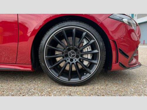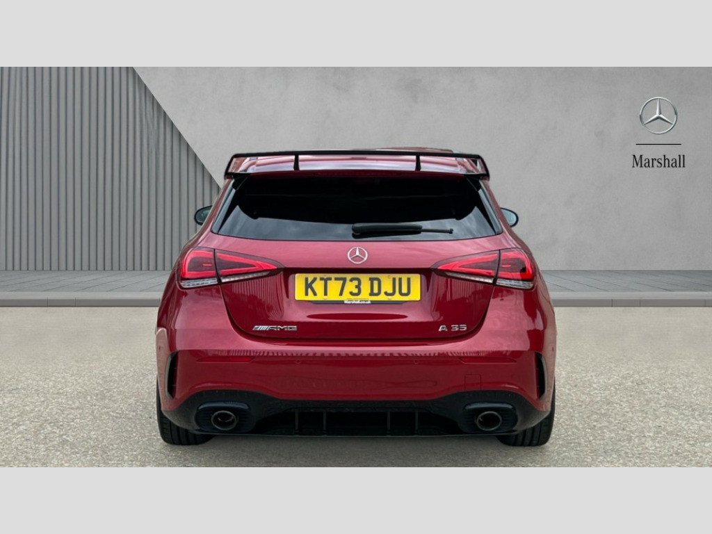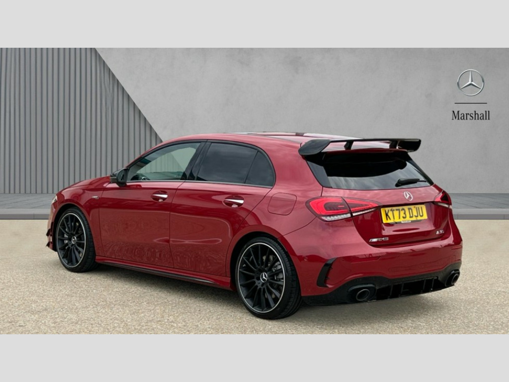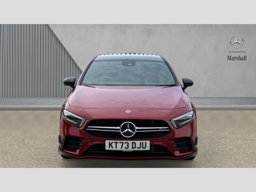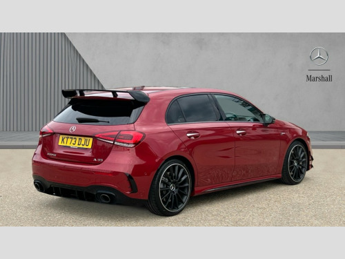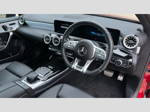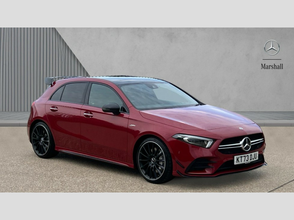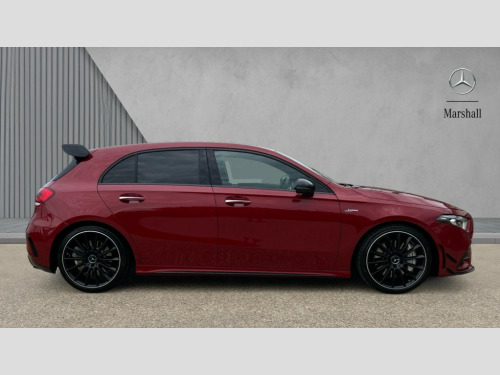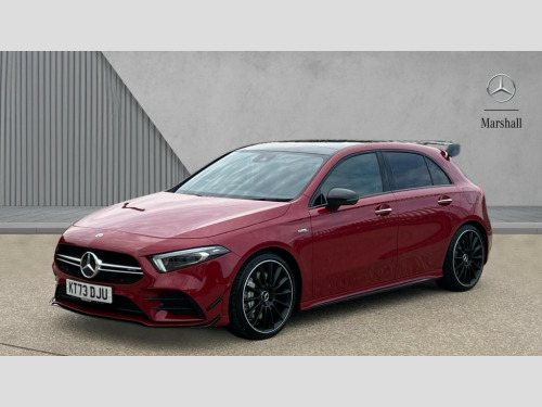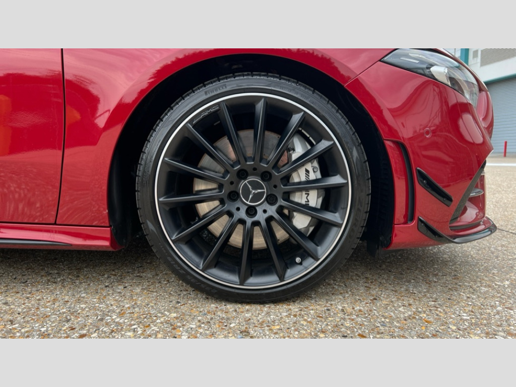 Mercedes-Benz A Class A35 4Matic Premium Plus 5dr Auto 10.25" Digital instrument cluster display screen, 10.25" media display, 180 degree rear view camera with parking guidelines, Active parking assist with visual and audible warning of detected obstacles, Attention assist, Brake pad wear indicator warning light, Car wash mode, Cruise control + speed limiter, Direct steering, Dual bluetooth interfaces, DYNAMIC SELECT with driving programs (Slippery, Comfort, Sport, Sport+ and Individual), ECO start/stop function, Fluid level warning indicator for fuel, oil, coolant and washer fluid, Hard-disk navigation, Hey Mercedes Voice activation, Lamp failure indicator, Lane keeping system, Mercedes me connect including emergency call system, accident recovery, breakdown and maintenance management, Mercedes me remote services, Outside temperature gauge, Owners manual in English, Pre-installation for private car sharing, Preinstallation for Mercedes Benz link, Service indicator (ASSYST), Smartphone integration with Apple CarPlay and Android auto, Speed limit assist, Speed sensitive power steering, Traffic sign assist, Trip computer, Ultrasonic sensors positioned in the front and rear bumpers, AMG performance suspension, Rear axle multi-link, Suspension with adaptive damping system, 2 USB ports (type C) in rear stowage compartment and one in front of center console, 6 speakers, DAB Digital radio, MBUX multimedia system with DAB digital radio and touchpad including satellite navigation, Mercedes-Benz sound system - 100W, 4 Electric Front and Rear windows, Adaptive brake lights, AMG bodystyling - Front apron with splitter in chrome, rear apron with chrome trim and chrome visible trim elements in tailpipe, AMG Front apron with flics as air deflector elements on the outer air intakes, AMG radiator grille with twin blade lamella and AMG Lettering, AMG Rear apron with specific diffuser look with four vertical fins and two round chrome plated tailpipe trim elements with a diameter of 90 mm, AMG spoiler lip on roof, AMG Sports exhaust system with two round tailpipes measuring 90 mm in diameter attached in rear apron, AMG lettering plus ribbing on the inside of the, Automatic headlights, Black weather strip, Body colour bumpers, Body colour door handles with chrome inserts, Body colour side skirt, Electric adjustable and heated door mirrors with integrated LED side indicators, Front wings wheel arches with TURBO 4MATIC lettering, Headlamp assist automatic headlamp activation, Heated glass rear windscreen + timer control, LED daytime running lights, LED High level third brake light, LED tail lamp, Multibeam LED headlights with adaptive highbeam assist plus, Panoramic sliding sunroof, Privacy glass, Radio aerial, Rain sensing windscreen wipers with two sensitivity settings, Rear fog lights, Rear side wing doors, Rear wiper, Trim elements on louvres in outer air inlets in high gloss black, Wider wheel arches for AMG wheels, 3 seat bench in 2nd row, 40:20:40 split folding rear seats, AMG Performance steering wheel in nappa leather, Auto Mercedes-Benz child seat recognition sensor, Black air vents with surround in silver chrome, Black roof lining, Brushed stainless steel sports pedals with rubber studs, Controller on centre console with chrome surround, Electrically adjustable front memory seats including lumbar support, Floor mats with AMG lettering, Front centre armrest with storage compartment, Front seat backs luggage nets, Heated front seats, Height/reach adjustable steering column, Illuminated AMG front door sills with changeable cover, Interior lighting - 64 colour Ambient lighting, Interior mirror with reading lamps in black and frameless, Rear armrest with 2 cupholders, Rear head restraints, Seat occupancy sensor for front passenger seat, Silver coloured aluminium gear shift paddles on steering wheel, Single front passenger seat, Sports seats with integrated headrests, Stowage compartment in centre console with retractable cover, Sunvisors with illuminated vanity mirrors, Touchpad on center console, Twin front cupholders, Two zone thermotronic luxury automatic climate control, Aerodynamic pack - A Class, AMG night pack - A Class, Light and sight pack - A Class, Mirror package - A Class, Seat comfort pack - A Class, 3 rear 3 point seatbelts, ABS with Brake Assist, Active bonnet, Active brake assist includes forward collision warning system with autonomous braking, Adaptive brake assist with hold function and hill start assist, Black seatbelts, Childproof locks manually operated for rear doors and electrically operated for rear power windows, Crash responsive emergency lighting, Driver and passenger head and side airbags, Drivers knee airbag, Dual stage driver/passenger airbags, Electronic parking brake, ESP curve dynamic assist, ESP with ASR, Front and rear seatbelt reminder, Front brake calipers with AMG lettering, ISOFIX and top tether child seat fixing points in two outer rear seats, Perforated front brake discs, Tyre pressure monitoring system, Warning triangle and first aid kit, Window airbags, Alarm system/interior protection/immobiliser, Keyless entry lock/unlock, Keyless Go, Remote central locking and crash sensor with emergency opening function, Urban guard vehicle protection system with immobiliser and interior protection, Light aluminium with longitudinal grain interior trim, 19" AMG multi-spoke matt black painted light alloy wheels with high sheen finish, Summer tyres, Tirefit sealant kit