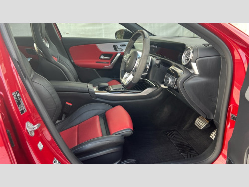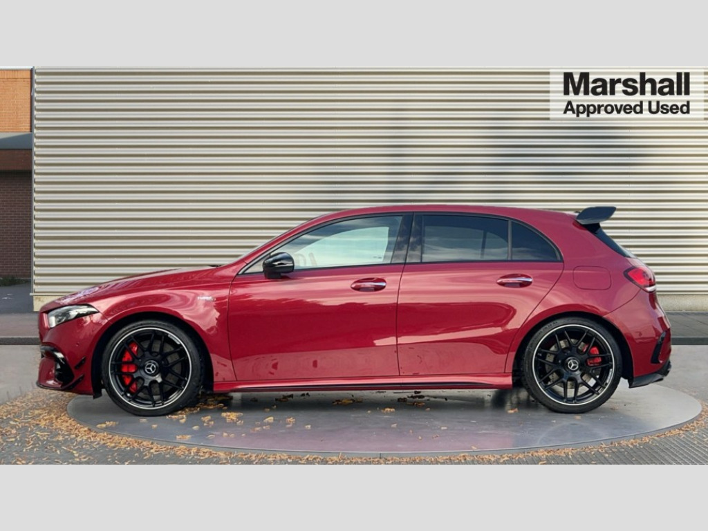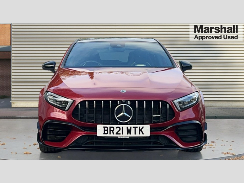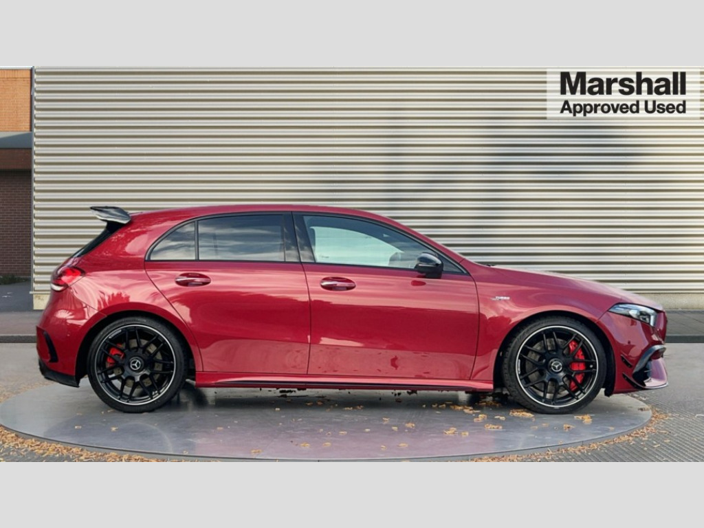 Mercedes-Benz A Class A45 S 4Matic+ Plus 5dr Auto 10.25 inch touchscreen central media display with AMG specific, AMG start up logo, visualisation of the AMG drive programs, vehicle and engine data, 10.25" Digital instrument cluster display screen, 180 degree rear view camera with parking guidelines, Active parking assist with visual and audible warning of detected obstacles, AMG DYNAMIC SELECT with driving programs (Slippery, Comfort, Sport, Sport+, Individual and Race) including drift mode via steering wheel shift paddles, Attention assist, Brake pad wear indicator warning light, Car wash mode, Direct steering, Dual bluetooth interfaces, ECO start/stop function, Fluid level warning indicator for fuel, oil, coolant and washer fluid, Hard-disk navigation, Hey Mercedes Voice activation, Lamp failure indicator, Lane keeping system, Mercedes me connect including emergency call system, accident recovery, breakdown and maintenance management, Mercedes me remote services, Outside temperature gauge, Owners manual in English, Pre-installation for private car sharing, Preinstallation for Mercedes Benz link, Service indicator (ASSYST), Smartphone integration with Apple CarPlay and Android auto, Traffic sign assist, Trip computer, Ultrasonic sensors positioned in the front and rear bumpers, AMG performance 4MATIC+ with torque control, Rear axle multi-link, 2 USB ports (type C) in rear stowage compartment and one in front of center console, DAB Digital radio, MBUX multimedia system with DAB digital radio and touchpad including satellite navigation, Mercedes-Benz sound system - 100W, 4 Electric Front and Rear windows, Adaptive brake lights, AMG A45 S bodystyling -rear apron, four vertical fins, side sill panels, roof spoiler lip, specific front apron, diffuser look and S label on boot lid, AMG bodystyling - Front apron with splitter in chrome, rear apron with chrome trim and chrome visible trim elements in tailpipe, AMG real performance exhaust sound system, AMG specific radiator grille in high gloss chrome with AMG lettering, Black weather strip, Body colour bumpers, Body colour door handles, Body colour side skirt, Electric adjustable and heated door mirrors with integrated LED side indicators, Headlamp assist automatic headlamp activation, Heated glass rear windscreen + timer control, High gloss black beltline, LED High level third brake light, LED tail lamp, Multibeam LED with adaptive highbeam assist plus, Panoramic sliding sunroof, Privacy glass, Radio aerial, Rain sensing windscreen wipers with two sensitivity settings, Rear fog lights, Rear wiper, Two round twin tailpipe trim elements each measuring 90 mm in diameter and AMG lettering plus ribbing on the inside of the pipe, Valve control dependent on drive program, Wider wheel arches for AMG wheels, Window line trim strip in high gloss black, 3 Spoke flattened lower section sporty design AMG Performance steering wheel in nappa leather/Dinamic microfibre, 40:20:40 split folding rear seats, AMG brushed stainless steel sports pedals with rubber studs, AMG centre console finished with trim in silver chrome, AMG floor mats, AMG performance seats, AMG sporty centre console with raised front section and integral control switched for manual transmission mode, AMG Steering wheel touch control buttons, Auto Mercedes-Benz child seat recognition sensor, Black air vents with surround in silver chrome, Black roof lining, Front centre armrest with storage compartment, Front seat cushion length adjustment, Front seat head restraints, Heated front seats, Height/reach adjustable steering column, Illuminated AMG front door sills with changeable cover, Interior lighting - 64 colour Ambient lighting, Interior mirror with reading lamps in black and frameless, Rear armrest with 2 cupholders, Rear head restraints, Seat occupancy sensor for front passenger seat, Silver coloured aluminium gear shift paddles on steering wheel, Stowage compartment in centre console with retractable cover, Sunvisors with illuminated vanity mirrors, Touchpad on center console, Twin front cupholders, Two zone thermotronic luxury automatic climate control, Aerodynamic pack - A Class, AMG Driver's pack - A Class, AMG night pack - A Class, AMG performance high-end seat pack - A Class, Light and sight pack - A Class, Mirror package - A Class, Multi-contour seat pack - A Class, Seat comfort pack - A Class, 3 rear 3 point seatbelts, 3 stage electronic stability programme, ABS with Brake Assist, Active bonnet, Adaptive brake assist with hold function and hill start assist, AMG high performance brake system with red painted brake callipers and black AMG lettering at the front, ventilated and perforated brake discs, Black seatbelts, Bonnet with power domes, Childproof locks manually operated for rear doors and electrically operated for rear power windows, Crash responsive emergency lighting, Driver and passenger head and side airbags, Drivers knee airbag, Dual stage driver/passenger airbags, Electronic parking brake, ESP curve dynamic assist, ESP with ASR, Front and rear seatbelt reminder, ISOFIX and top tether child seat fixing points in two outer rear seats, Tyre pressure monitoring system, Warning triangle and first aid kit, Window airbags, Alarm system/interior protection/immobiliser, Keyless entry lock/unlock, Keyless Go, Remote central locking and crash sensor with emergency opening function, Urban guard vehicle protection system with immobiliser and interior protection, Light aluminium with longitudinal grain interior trim, 19" AMG forged cross spoke design alloy wheels, Summer tyres, Tirefit sealant kit, Wheel arches with flared AMG wings with TURBO 4MATIC+ lettering