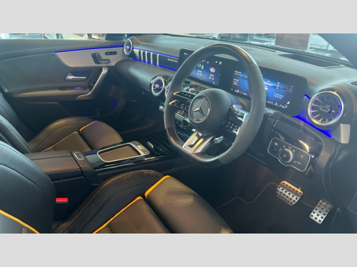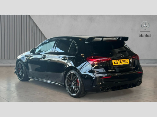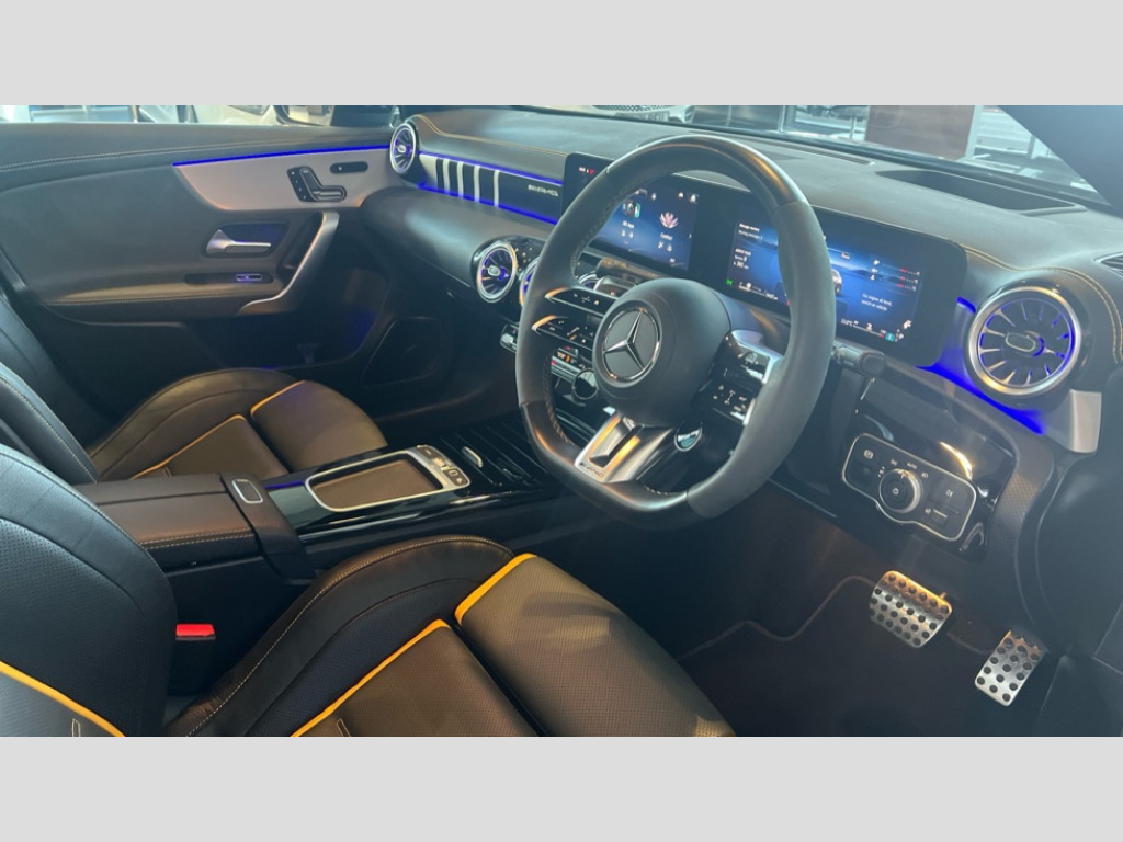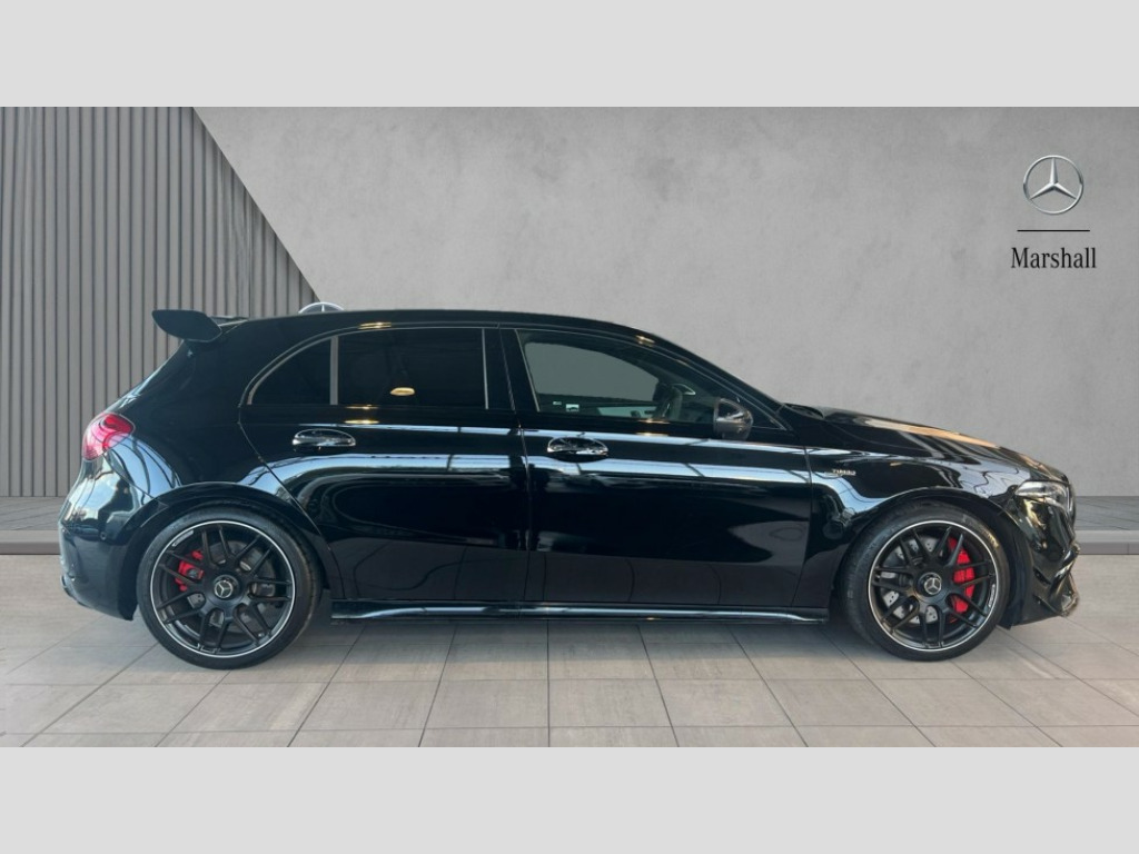Mercedes-Benz A Class A45 S 4Matic+ Plus 5dr Auto 10.25 inch touchscreen central media display with AMG specific, AMG start up logo, visualisation of the AMG drive programs, vehicle and engine data, 10.25" Digital instrument cluster display screen, AMG DYNAMIC SELECT with drive modes(Slippery, Comfort, Sport, Sport+, Individual and Race) incl drift mode via steering wheel shift paddles+Race Start, AMG menu with sporty additional information - Gear indicator with yellow M symbol manual mode, Warm Up menu and Set Up menu, AMG speed sensitive steering with two sets of steering characteristics, Attention assist, Brake pad wear indicator warning light, Car wash mode, Direct steering, Dual bluetooth interfaces, ECO start/stop function, Engine start/stop button, Fingerprint scanner, Fluid level warning indicator for fuel, oil, coolant and washer fluid, Fluorescent jacket for driver, Hard-disk navigation, Head up Display, Hey Mercedes Voice activation, Lamp failure indicator, MBUX augmented reality for navigation, MBUX Interior assistant, Mercedes me connect including emergency call system, accident recovery, breakdown and maintenance management, Mercedes me remote services, Outside temperature gauge, Owners manual in English, Pre-installation of private car share, Preinstallation for Mercedes Benz link, Remote boot closing, Service indicator (ASSYST), Smartphone integration with Apple CarPlay and Android auto, Speed sensitive power steering, Tailgate, Traffic sign assist, Trip computer in multifunction display with current consumption indicator, Wireless charging, AMG performance 4MATIC+ with torque control, AMG suspension including AMG specific axles and sporty spring/damper setup, Suspension with adaptive damping system, Burmester surround sound system (590W) with Dolby atmos, speakers - 1 center+4 doors+2 in C pillars, tweeter, subwoofer, DSP amp, burmester lettering, DAB Digital radio, MBUX multimedia system, 4 Electric Front and Rear windows, Adaptive brake lights, AMG A45 S bodystyling -rear apron, four vertical fins, side sill panels, roof spoiler lip, specific front apron, diffuser look and S label on boot lid, AMG real performance exhaust sound system, AMG specific radiator grille in high gloss chrome with AMG lettering, Beltline strips in High gloss Black, Body colour bumpers, Body colour door handles with chrome inserts, Body colour side skirt, Electric adjustable and heated door mirrors with integrated LED side indicators, Headlamp assist automatic headlamp activation, Heat insulating dark tinted rear and rear side windows, Heated glass rear windscreen + timer control, LED daytime running lights, LED High level third brake light, LED tail lamp, Multibeam LED headlamps with adaptive highbeam assist and cornering function, Panoramic sliding sunroof, Privacy glass, Radio aerial, Rain sensing windscreen wipers with two sensitivity settings, Rear fog lights, Rear side wing doors, Rear windscreen wiper, Surround lighting with logo projection, Two round twin tailpipe trim elements each measuring 90 mm in diameter and AMG lettering plus ribbing on the inside of the pipe, Valve control dependent on drive program, Wider wheel arches for AMG wheels, Window line trim strip in black, 3 seat bench in 2nd row, 3 Spoke flattened lower section sporty design AMG Performance steering wheel in nappa leather/microcut microfibre, 40:20:40 split folding rear seats, Air conditioning - Two zone thermotronic luxury automatic climate control with display, AMG brushed stainless steel sports pedals with rubber studs, AMG centre console finished with trim in silver chrome, AMG floor mats, AMG performance seats, AMG sporty centre console with raised front section and integral control switched for manual transmission mode, AMG steering wheel buttons, Automatic child seat recognition sensor, Black air vents with surround in silver chrome, Black roof lining, Electrically adjustable front memory seats including lumbar support and backrest inclination, Front centre armrest with stowage, Front seat head restraints, Height/reach adjustable steering column, Illuminated AMG front door sills with changeable cover, Interior lighting - 64 colour Ambient lighting, Interior mirror with reading lamps in black and frameless, Rear armrest with 2 cupholders, Rear head restraints, Seat occupancy sensor for front passenger seat, Silver coloured aluminium gear shift paddles on steering wheel, Single front passenger seat, Stowage compartment in centre console with retractable cover, Sunvisors with illuminated vanity mirrors, Twin front cupholders, Aerodynamic pack - A Class, AMG Driver's pack - A Class, AMG night pack - A Class, AMG performance high-end seat pack - A Class, Light and sight package - A Class, Mirror package - A Class, Multi-contour seat pack - A Class, Parking pack with 360 degree camera - A Class, Seat comfort pack - A Class, USB pack plus - A Class, Winter pack - A Class, 3 rear 3 point seatbelts, 3 stage electronic stability programme, ABS with Brake Assist, Active bonnet, Adaptive brake assist with hold function and hill start assist, AMG high performance brake system with red painted brake callipers and black AMG lettering at the front, ventilated and perforated brake discs, Black seatbelts, Bonnet with power domes, Childproof locks manually operated for rear doors and electrically operated for rear power windows, Crash responsive emergency lighting, Driver and passenger head and side airbags, Drivers knee airbag, Dual stage driver/passenger airbags, Electronic parking brake, ESP curve dynamic assist, ESP with ASR, Exit warning, Front and rear seatbelt reminder, ISOFIX and top tether child seat fixing points in two outer rear seats, Tyre pressure monitoring system, Warning triangle and first aid kit, Window airbags, Alarm system/interior protection/immobiliser, Guard 360 degree vehicle protection, Keyless entry lock/unlock, Keyless Go, Remote central locking and crash sensor with emergency opening function, Alumin