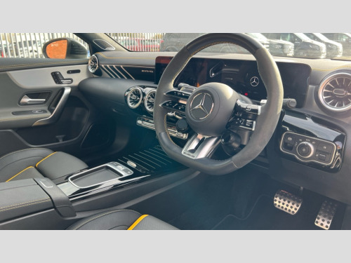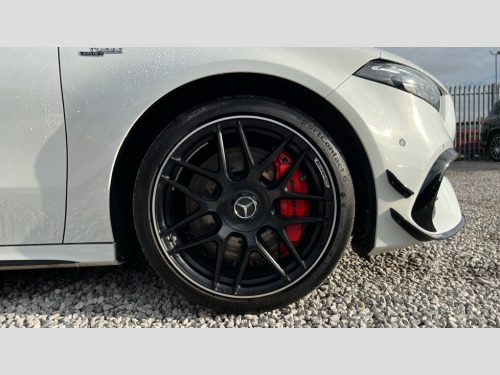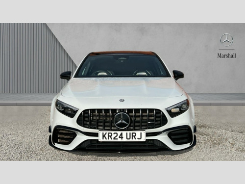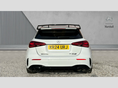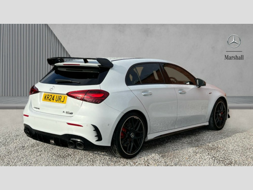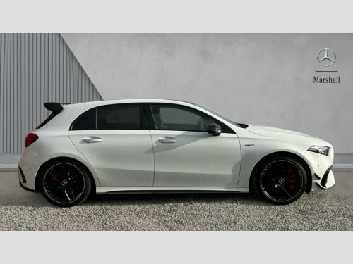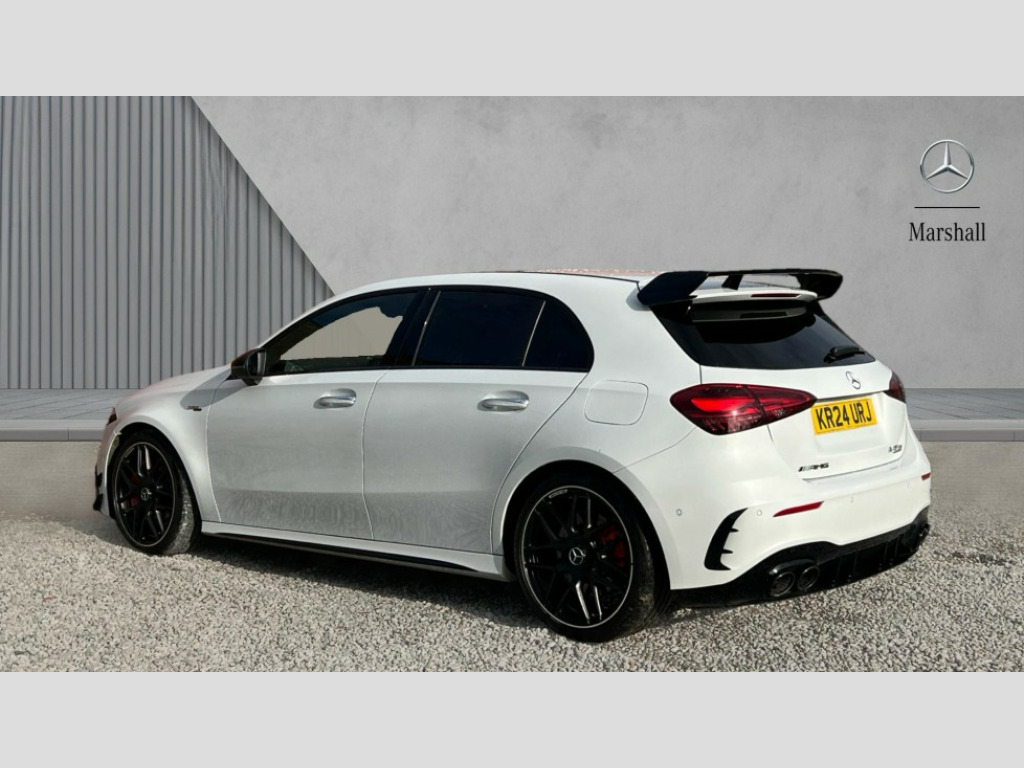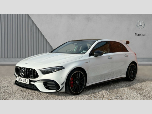 Mercedes-Benz A Class A45 S 4Matic+ Plus 5dr Auto 10.25 inch touchscreen central media display with AMG specific, AMG start up logo, visualisation of the AMG drive programs, vehicle and engine data, 10.25" Digital instrument cluster display screen, AMG DYNAMIC SELECT with drive modes(Slippery, Comfort, Sport, Sport+, Individual and Race) incl drift mode via steering wheel shift paddles+Race Start, AMG menu with sporty additional information - Gear indicator with yellow M symbol manual mode, Warm Up menu and Set Up menu, AMG speed sensitive steering with two sets of steering characteristics, Attention assist, Brake pad wear indicator warning light, Car wash mode, Direct steering, Dual bluetooth interfaces, ECO start/stop function, Engine start/stop button, Fluid level warning indicator for fuel, oil, coolant and washer fluid, Fluorescent jacket for driver, Hard-disk navigation, Head up Display, Hey Mercedes Voice activation, Lamp failure indicator, MBUX augmented reality for navigation, MBUX Interior assistant, Mercedes me connect including emergency call system, accident recovery, breakdown and maintenance management, Mercedes me remote services, Outside temperature gauge, Owners manual in English, Pre-installation of private car share, Preinstallation for Mercedes Benz link, Remote boot closing, Service indicator (ASSYST), Smartphone integration with Apple CarPlay and Android auto, Speed sensitive power steering, Tailgate, Traffic sign assist, Trip computer in multifunction display with current consumption indicator, Wireless charging, AMG performance 4MATIC+ with torque control, AMG suspension including AMG specific axles and sporty spring/damper setup, Suspension with adaptive damping system, Burmester surround sound system (590W) with Dolby atmos, speakers - 1 center+4 doors+2 in C pillars, tweeter, subwoofer, DSP amp, burmester lettering, DAB Digital radio, MBUX multimedia system, 4 Electric Front and Rear windows, Adaptive brake lights, AMG A45 S bodystyling -rear apron, four vertical fins, side sill panels, roof spoiler lip, specific front apron, diffuser look and S label on boot lid, AMG real performance exhaust sound system, AMG specific radiator grille in high gloss chrome with AMG lettering, Beltline strips in High gloss Black, Body colour bumpers, Body colour door handles with chrome inserts, Body colour side skirt, Electric adjustable and heated door mirrors with integrated LED side indicators, Headlamp assist automatic headlamp activation, Heat insulating dark tinted rear and rear side windows, Heated glass rear windscreen + timer control, LED daytime running lights, LED High level third brake light, LED tail lamp, Multibeam LED headlamps with adaptive highbeam assist and cornering function, Panoramic sliding sunroof, Privacy glass, Radio aerial, Rain sensing windscreen wipers with two sensitivity settings, Rear fog lights, Rear side wing doors, Rear windscreen wiper, Surround lighting with logo projection, Two round twin tailpipe trim elements each measuring 90 mm in diameter and AMG lettering plus ribbing on the inside of the pipe, Valve control dependent on drive program, Wider wheel arches for AMG wheels, Window line trim strip in black, 3 seat bench in 2nd row, 3 Spoke flattened lower section sporty design AMG Performance steering wheel in nappa leather/microcut microfibre, 40:20:40 split folding rear seats, Air conditioning - Two zone thermotronic luxury automatic climate control with display, AMG brushed stainless steel sports pedals with rubber studs, AMG centre console finished with trim in silver chrome, AMG floor mats, AMG performance seats, AMG sporty centre console with raised front section and integral control switched for manual transmission mode, AMG steering wheel buttons, Automatic child seat recognition sensor, Black air vents with surround in silver chrome, Black roof lining, Electrically adjustable front memory seats including lumbar support and backrest inclination, Front centre armrest with stowage, Front seat head restraints, Heated front seats, Height/reach adjustable steering column, Illuminated AMG front door sills with changeable cover, Interior lighting - 64 colour Ambient lighting, Interior mirror with reading lamps in black and frameless, Rear armrest with 2 cupholders, Rear head restraints, Seat occupancy sensor for front passenger seat, Silver coloured aluminium gear shift paddles on steering wheel, Single front passenger seat, Stowage compartment in centre console with retractable cover, Sunvisors with illuminated vanity mirrors, Twin front cupholders, Aerodynamic pack - A Class, AMG Driver's pack - A Class, AMG night pack - A Class, AMG performance high-end seat pack - A Class, Light and sight pack - A Class, Mirror package - A Class, Multi-contour seat pack - A Class, Parking pack with 360 degree camera - A Class, Seat comfort pack - A Class, USB pack plus - A Class, 3 rear 3 point seatbelts, 3 stage electronic stability programme, ABS with Brake Assist, Active bonnet, Adaptive brake assist with hold function and hill start assist, AMG high performance brake system with red painted brake callipers and black AMG lettering at the front, ventilated and perforated brake discs, Black seatbelts, Bonnet with power domes, Childproof locks manually operated for rear doors and electrically operated for rear power windows, Crash responsive emergency lighting, Driver and passenger head and side airbags, Drivers knee airbag, Dual stage driver/passenger airbags, Electronic parking brake, ESP curve dynamic assist, ESP with ASR, Exit warning, Front and rear seatbelt reminder, ISOFIX and top tether child seat fixing points in two outer rear seats, Tyre pressure monitoring system, Warning triangle and first aid kit, Window airbags, Alarm system/interior protection/immobiliser, Guard 360 degree vehicle protection, Keyless entry lock/unlock, Keyless Go, Remote central locking and crash sensor with emergency opening function, Aluminium AMG design black/silver