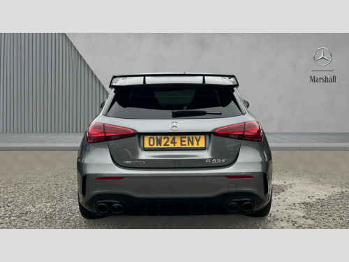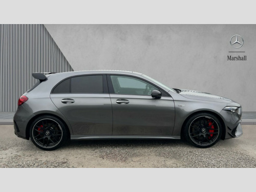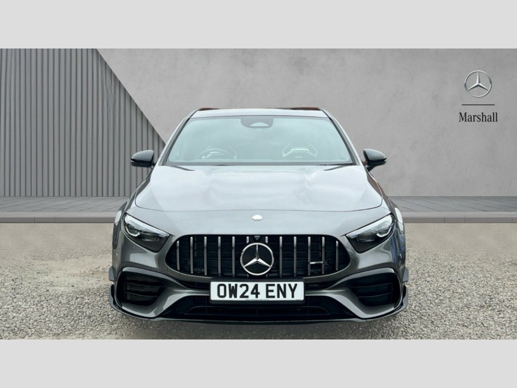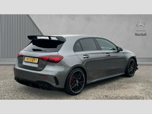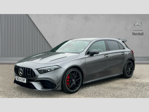 Mercedes-Benz A Class A45 S 4Matic+ Plus 5dr Auto 10.25 inch touchscreen central media display with AMG specific, AMG start up logo, visualisation of the AMG drive programs, vehicle and engine data, 10.25" Digital instrument cluster display screen, AMG DYNAMIC SELECT with drive modes(Slippery, Comfort, Sport, Sport+, Individual and Race) incl drift mode via steering wheel shift paddles+Race Start, AMG menu with sporty additional information - Gear indicator with yellow M symbol manual mode, Warm Up menu and Set Up menu, AMG speed sensitive steering with two sets of steering characteristics, Attention assist, Brake pad wear indicator warning light, Car wash mode, Direct steering, Dual bluetooth interfaces, ECO start/stop function, Engine start/stop button, Fingerprint scanner, Fluid level warning indicator for fuel, oil, coolant and washer fluid, Fluorescent jacket for driver, Hard-disk navigation, Head up Display, Hey Mercedes Voice activation, Lamp failure indicator, MBUX augmented reality for navigation, MBUX Interior assistant, Mercedes me connect including emergency call system, accident recovery, breakdown and maintenance management, Mercedes me remote services, Outside temperature gauge, Owners manual in English, Pre-installation of private car share, Preinstallation for Mercedes Benz link, Remote boot closing, Service indicator (ASSYST), Smartphone integration with Apple CarPlay and Android auto, Speed sensitive power steering, Tailgate, Traffic sign assist, Trip computer in multifunction display with current consumption indicator, Wireless charging, AMG performance 4MATIC+ with torque control, AMG suspension including AMG specific axles and sporty spring/damper setup, Suspension with adaptive damping system, Burmester surround sound system (590W) with Dolby atmos, speakers - 1 center+4 doors+2 in C pillars, tweeter, subwoofer, DSP amp, burmester lettering, DAB Digital radio, MBUX multimedia system, 4 Electric Front and Rear windows, Adaptive brake lights, AMG A45 S bodystyling -rear apron, four vertical fins, side sill panels, roof spoiler lip, specific front apron, diffuser look and S label on boot lid, AMG real performance exhaust sound system, AMG specific radiator grille in high gloss chrome with AMG lettering, Beltline strips in High gloss Black, Body colour bumpers, Body colour door handles with chrome inserts, Body colour side skirt, Electric adjustable and heated door mirrors with integrated LED side indicators, Headlamp assist automatic headlamp activation, Heat insulating dark tinted rear and rear side windows, Heated glass rear windscreen + timer control, LED daytime running lights, LED High level third brake light, LED tail lamp, Multibeam LED headlamps with adaptive highbeam assist and cornering function, Panoramic sliding sunroof, Privacy glass, Radio aerial, Rain sensing windscreen wipers with two sensitivity settings, Rear fog lights, Rear side wing doors, Rear windscreen wiper, Surround lighting with logo projection, Two round twin tailpipe trim elements each measuring 90 mm in diameter and AMG lettering plus ribbing on the inside of the pipe, Valve control dependent on drive program, Wider wheel arches for AMG wheels, Window line trim strip in black, 3 seat bench in 2nd row, 3 Spoke flattened lower section sporty design AMG Performance steering wheel in nappa leather/microcut microfibre, 40:20:40 split folding rear seats, Air conditioning - Two zone thermotronic luxury automatic climate control with display, AMG brushed stainless steel sports pedals with rubber studs, AMG centre console finished with trim in silver chrome, AMG floor mats, AMG performance seats, AMG sporty centre console with raised front section and integral control switched for manual transmission mode, AMG steering wheel buttons, Automatic child seat recognition sensor, Black air vents with surround in silver chrome, Black roof lining, Electrically adjustable front memory seats including lumbar support and backrest inclination, Front centre armrest with stowage, Front seat head restraints, Height/reach adjustable steering column, Illuminated AMG front door sills with changeable cover, Interior lighting - 64 colour Ambient lighting, Interior mirror with reading lamps in black and frameless, Rear armrest with 2 cupholders, Rear head restraints, Seat occupancy sensor for front passenger seat, Silver coloured aluminium gear shift paddles on steering wheel, Single front passenger seat, Stowage compartment in centre console with retractable cover, Sunvisors with illuminated vanity mirrors, Twin front cupholders, Aerodynamic pack - A Class, AMG Driver's pack - A Class, AMG night pack - A Class, AMG performance high-end seat pack - A Class, Light and sight package - A Class, Mirror package - A Class, Multi-contour seat pack - A Class, Parking pack with 360 degree camera - A Class, Seat comfort pack - A Class, USB pack plus - A Class, Winter pack - A Class, 3 rear 3 point seatbelts, 3 stage electronic stability programme, ABS with Brake Assist, Active bonnet, Adaptive brake assist with hold function and hill start assist, AMG high performance brake system with red painted brake callipers and black AMG lettering at the front, ventilated and perforated brake discs, Black seatbelts, Bonnet with power domes, Childproof locks manually operated for rear doors and electrically operated for rear power windows, Crash responsive emergency lighting, Driver and passenger head and side airbags, Drivers knee airbag, Dual stage driver/passenger airbags, Electronic parking brake, ESP curve dynamic assist, ESP with ASR, Exit warning, Front and rear seatbelt reminder, ISOFIX and top tether child seat fixing points in two outer rear seats, Tyre pressure monitoring system, Warning triangle and first aid kit, Window airbags, Alarm system/interior protection/immobiliser, Guard 360 degree vehicle protection, Keyless entry lock/unlock, Keyless Go, Remote central locking and crash sensor with emergency opening function, Alumin