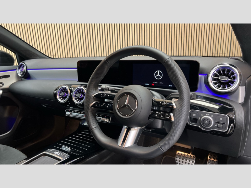 Mercedes-Benz A Class A180 AMG Line Premium Plus 5dr Auto 10.25 inch touchscreen central media display, 10.25" Digital instrument cluster display screen, Attention assist, Brake pad wear indicator warning light, Car wash mode, Direct steering, Direction indicators with lane change function, Dual bluetooth interfaces, DYNAMIC SELECT with a choice of driving modes (ECO, Comfort, Sport and Individual), ECO start/stop function, Engine start/stop button, Fluid level warning indicator for fuel, oil, coolant and washer fluid, Fluorescent jacket for driver, Hard-disk navigation, Head up Display, Hey Mercedes Voice activation, Lamp failure indicator, Mercedes me connect including emergency call system, accident recovery, breakdown and maintenance management, Mercedes me remote services, Outside temperature gauge, Owners manual in English, Pre-installation of private car share, Remote boot closing, Service indicator (ASSYST), Smartphone integration with Apple CarPlay and Android auto, Speed sensitive power steering, Tailgate, Traffic sign assist, Trip computer in multifunction display with current consumption indicator, Wireless charging, Lowered comfort suspension, DAB Digital radio, MBUX multimedia system, Mercedes Benz advanced sound system (225 W) with 10 speakers, 1 central speaker, speakers on doors, a tweeter on door,one sub woofer + boost amplifier, 4 Electric Front and Rear windows, Adaptive brake lights, AMG body styling - AMG front apron with front splitter and AMG rear apron and visible exhaust tailpipe trim elements, Body colour bumpers, Body colour door handles with chrome inserts, Body colour side skirt, Chrome beltline strips, Diamond radiator grille with pins in fine star pattern, Electric adjustable and heated door mirrors with integrated LED side indicators, Exhaust system with 2 visible tailpipe trim elements and rear apron, Headlamp assist automatic headlamp activation, Heated glass rear windscreen + timer control, LED daytime running lights, LED High level third brake light, LED tail lamp, Multibeam LED headlamps with adaptive highbeam assist and cornering function, Panoramic sliding sunroof, Privacy glass, Radio aerial, Rain sensing windscreen wipers with two sensitivity settings, Rear fog lights, Rear side wing doors, Rear windscreen wiper, 3 seat bench in 2nd row, 3 Spoke flat bottom leather multi function steering wheel with perforated leather in grip area, 40:20:40 split folding rear seats, Air conditioning - Two zone thermotronic luxury automatic climate control with display, AMG floor mats, Artico man-made leather/Microcut microfibre upholstery, Automatic child seat recognition sensor, Black air vents with surround in silver chrome, Black roof lining, Brushed stainless steel sports pedals with rubber studs, Electrically adjustable front memory seats including lumbar support and backrest inclination, Front centre armrest with stowage, Front seat backs luggage nets, Galvanished gear shift paddles on steering wheel, Height/reach adjustable steering column, Illuminated Mercedes Benz lettering front door sills with changeable cover, Interior lighting - 64 colour Ambient lighting, Interior mirror with reading lamps in black and frameless, Rear armrest with 2 cupholders, Rear head restraints, Seat occupancy sensor for front passenger seat, Single front passenger seat, Sports seats with integrated headrests, Stowage compartment in centre console with retractable cover, Sunvisors with illuminated vanity mirrors, Twin front cupholders, Light and sight package - A Class, Mirror package - A Class, Night pack - A Class, Parking pack with 360 degree camera - A Class, Seat comfort pack - A Class, USB pack plus - A Class, Winter pack - A Class, 3 rear 3 point seatbelts, ABS with Brake Assist, Active bonnet, Adaptive brake assist with hold function and hill start assist, Bonnet with power domes, Childproof locks manually operated for rear doors and electrically operated for rear power windows, Crash responsive emergency lighting, Driver and passenger head and side airbags, Drivers knee airbag, Dual stage driver/passenger airbags, Electronic parking brake, ESP curve dynamic assist, ESP with ASR, Exit warning, Front and rear seatbelt reminder, Grey seatbelts, ISOFIX and top tether child seat fixing points in two outer rear seats, Tyre pressure monitoring system, Warning triangle and first aid kit, Window airbags, Alarm system/interior protection/immobiliser, Guard 360 degree vehicle protection, Keyless entry lock/unlock, Keyless Go, Remote central locking and crash sensor with emergency opening function, Light longitudinal grain aluminium trim, 19" AMG multi-spoke light alloy wheels,aerodynamically optimised, painted in black with high sheen rim flange, Summer tyres, Tirefit sealant kit