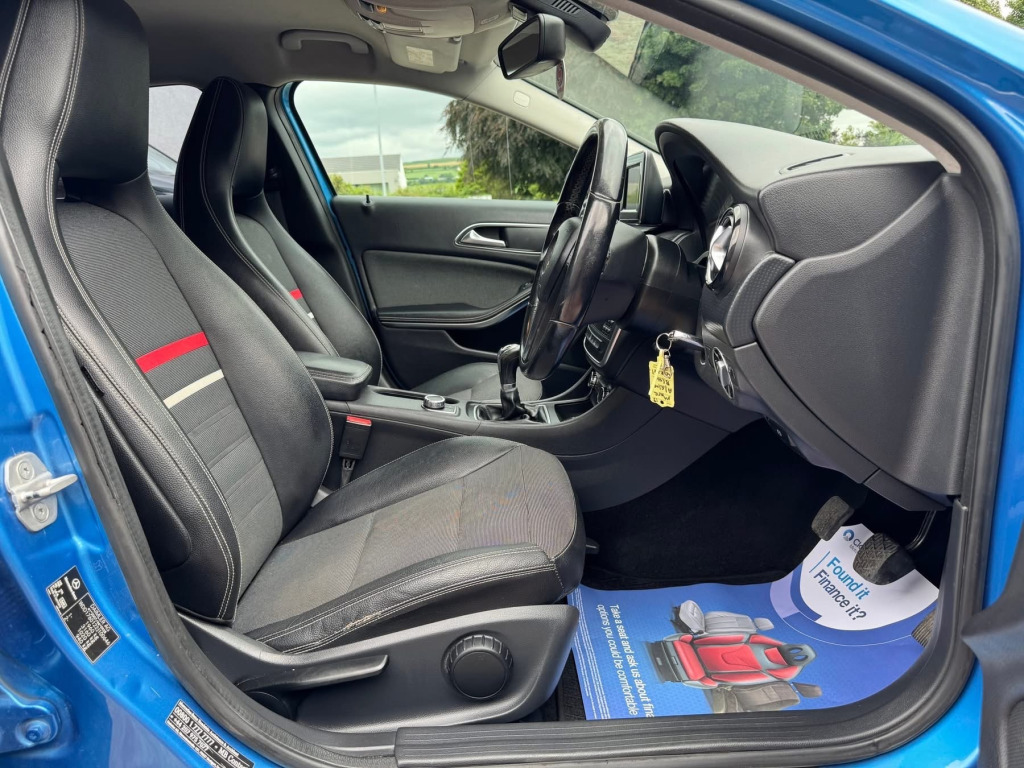 tention assist, bluetooth interface for hands free telephone, bulb failure indicator, external temperature gauge, low fluid warning light, service indicator (assyst plus), speed sensitive parameter assisted steering, trip computer, comfort suspension, aux-in socket, pre-wiring for becker map pilot, usb port, adaptive brake lights, body colour bumpers, body colour door handles, body colour side skirt, body coloured door mirrors, chrome beltline trim, electric heated + adjustable door mirrors, electric rear windows, headlamp assist, heated rear windscreen, radiator grille with 2 louvres in body colour, rear wiper, 1/3 to 2/3 split folding rear seats, 3 spoke leather multifunction sports steering wheel, auto mercedes-benz child seat recognition sensor, centre console with cupholders, cloth/artico man-made leather upholstery, footwell lights, front centre armrest with storage compartment, front head restraints, front sport seats, illuminated glovebox, isofix rear child seat preparation, leather gearshift, load securing rings in luggage compartment, luggage compartment cover, luggage compartment lighting, seat comfort pack - a class, 3 rear 3 point seatbelts, abs with brake assist, active bonnet, adaptive brake system, child proof door locks, drivers knee airbag, dual stage driver/passenger airbags, electronic parking brake, esp with asr, front and rear seatbelt reminder, front passenger seat occupancy sensor, front side airbags, hill start assist, tyre pressure warning, warning triangle and first aid kit, window airbags, alarm system/interior protection/immobiliser, remote central locking, chrome air vent surrounds, matrix effect trim, 16'' 10 spoke alloy wheels, 16'' Alloys