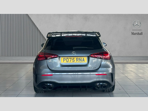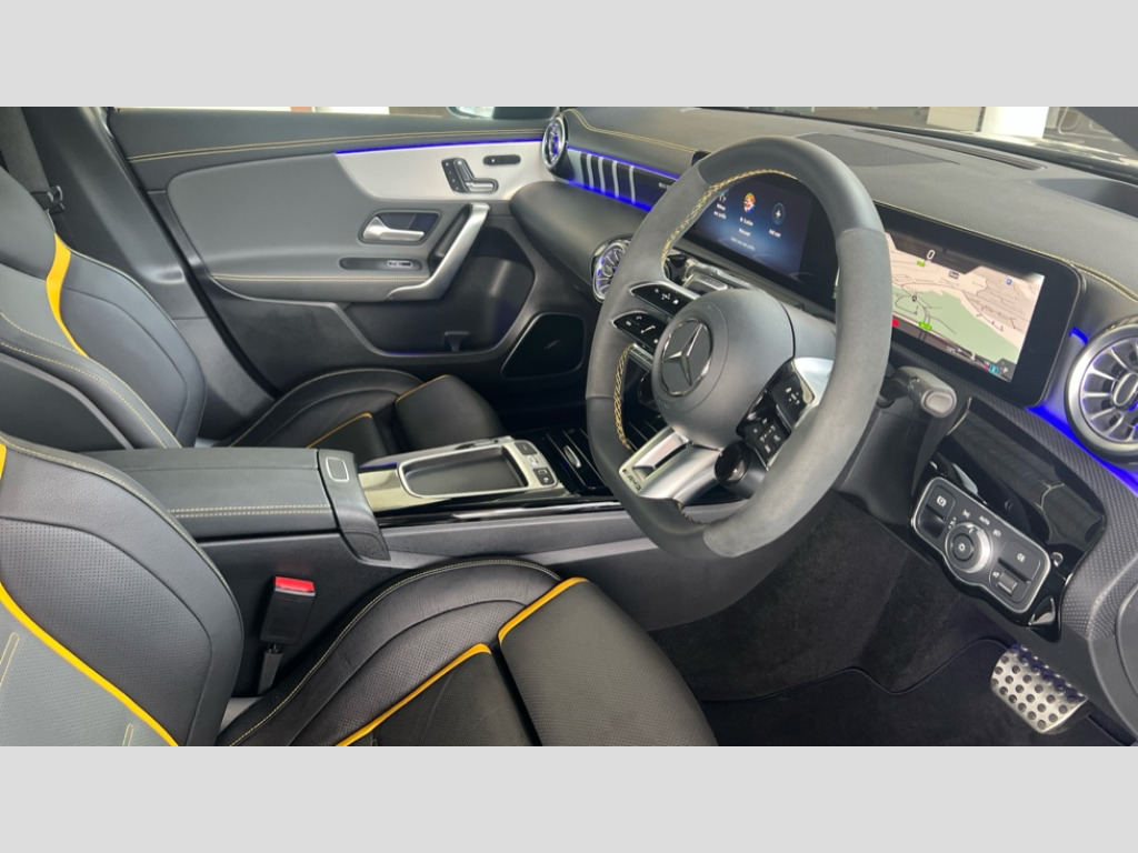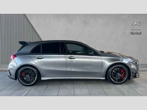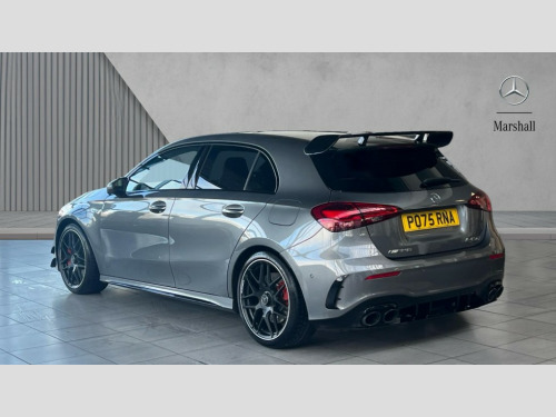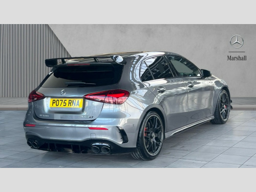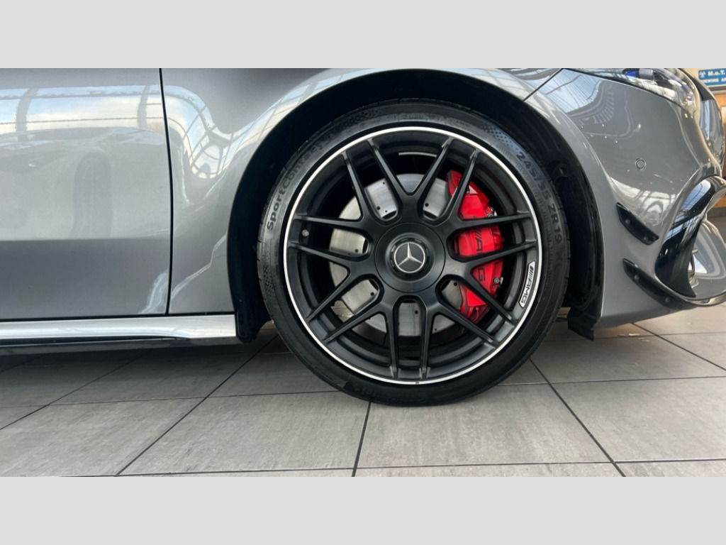 Mercedes-Benz A Class A45 S 4Matic+ Plus 5dr Auto 10.25 inch touchscreen central media display with AMG specific, AMG start up logo, visualisation of the AMG drive programs, vehicle and engine data, 10.25" Digital instrument cluster display screen, AMG DYNAMIC SELECT with drive modes(Slippery, Comfort, Sport, Sport+, Individual and Race) incl drift mode via steering wheel shift paddles+Race Start, AMG menu with sporty additional information - Gear indicator with yellow M symbol manual mode, Warm Up menu and Set Up menu, AMG speed sensitive steering with two sets of steering characteristics, Attention assist, Brake pad wear indicator warning light, Car wash mode, Direct steering, Dual bluetooth interfaces, ECO start/stop function, Engine start/stop button, Fluid level warning indicator for fuel, oil, coolant and washer fluid, Fluorescent jacket for driver, Hard-disk navigation, Head up Display, Hey Mercedes Voice activation, Lamp failure indicator, MBUX augmented reality for navigation, Mercedes me connect including emergency call system, accident recovery, breakdown and maintenance management, Mercedes me remote services, Outside temperature gauge, Owners manual in English, Pre-installation of private car share, Remote boot closing, Service indicator (ASSYST), Smartphone integration with Apple CarPlay and Android auto, Tailgate, Traffic sign assist, Trip computer in multifunction display with current consumption indicator, Wireless charging, AMG performance 4MATIC+ with torque control, AMG suspension including AMG specific axles and sporty spring/damper setup, Suspension with adaptive damping system, Burmester surround sound system (590W) with Dolby atmos, speakers - 1 center+4 doors+2 in C pillars, tweeter, subwoofer, DSP amp, burmester lettering, DAB Digital radio, MBUX multimedia system, 4 Electric Front and Rear windows, Adaptive brake lights, AMG A45 S bodystyling -rear apron, four vertical fins, side sill panels, roof spoiler lip, specific front apron, diffuser look and S label on boot lid, AMG real performance exhaust sound system, AMG specific radiator grille in high gloss chrome with AMG lettering, Beltline strips in High gloss Black, Body colour bumpers, Body colour door handles with chrome inserts, Body colour side skirt, Electric adjustable and heated door mirrors with integrated LED side indicators, Headlamp assist automatic headlamp activation, Heated glass rear windscreen + timer control, LED daytime running lights, LED High level third brake light, LED tail lamp, Multibeam LED headlamps with adaptive highbeam assist and cornering function, Panoramic sliding sunroof, Privacy glass, Radio aerial, Rain sensing windscreen wipers with two sensitivity settings, Rear fog lights, Rear side wing doors, Rear windscreen wiper, Surround lighting with logo projection, Two round twin tailpipe trim elements each measuring 90 mm in diameter and AMG lettering plus ribbing on the inside of the pipe, Valve control dependent on drive program, Wider wheel arches for AMG wheels, Window line trim strip in black, 3 seat bench in 2nd row, 3 Spoke flattened lower section sporty design AMG Performance steering wheel in nappa leather/microcut microfibre, 40:20:40 split folding rear seats, Air conditioning - Two zone thermotronic luxury automatic climate control with display, AMG brushed stainless steel sports pedals with rubber studs, AMG centre console finished with trim in silver chrome, AMG floor mats, AMG performance seats, AMG sporty centre console with raised front section and integral control switched for manual transmission mode, AMG steering wheel buttons, Automatic child seat recognition sensor, Black air vents with surround in silver chrome, Black roof lining, Electrically adjustable front memory seats including lumbar support and backrest inclination, Front centre armrest with stowage, Front seat head restraints, Height/reach adjustable steering column, Illuminated AMG front door sills with changeable cover, Interior lighting - 64 colour Ambient lighting, Interior mirror with reading lamps in black and frameless, Rear armrest with 2 cupholders, Rear head restraints, Seat occupancy sensor for front passenger seat, Silver coloured aluminium gear shift paddles on steering wheel, Single front passenger seat, Stowage compartment in centre console with retractable cover, Sunvisors with illuminated vanity mirrors, Twin front cupholders, Aerodynamic pack - A Class, AMG Driver's pack - A Class, AMG night pack - A Class, AMG performance high-end seat pack - A Class, Light and sight package - A Class, Mirror package - A Class, Multi-contour seat pack - A Class, Parking pack with 360 degree camera - A Class, Seat comfort pack - A Class, USB pack plus - A Class, Winter pack - A Class, 3 rear 3 point seatbelts, 3 stage electronic stability programme, ABS with Brake Assist, Active bonnet, Adaptive brake assist with hold function and hill start assist, AMG high performance brake system with red painted brake callipers and black AMG lettering at the front, ventilated and perforated brake discs, Black seatbelts, Bonnet with power domes, Childproof locks manually operated for rear doors and electrically operated for rear power windows, Crash responsive emergency lighting, Driver and passenger head and side airbags, Drivers knee airbag, Dual stage driver/passenger airbags, Electronic parking brake, ESP curve dynamic assist, ESP with ASR, Exit warning, Front and rear seatbelt reminder, ISOFIX and top tether child seat fixing points in two outer rear seats, Tyre pressure monitoring system, Warning triangle and first aid kit, Window airbags, Alarm system/interior protection/immobiliser, Guard 360 degree vehicle protection, Keyless entry lock/unlock, Keyless Go, Remote central locking and crash sensor with emergency opening function, Aluminium AMG design black/silver interior trim, 19" AMG cross spoke forged wheels painted in matt black with high sheen rim flange, Summer tyres, Tirefit sealant kit, Wheel arches
