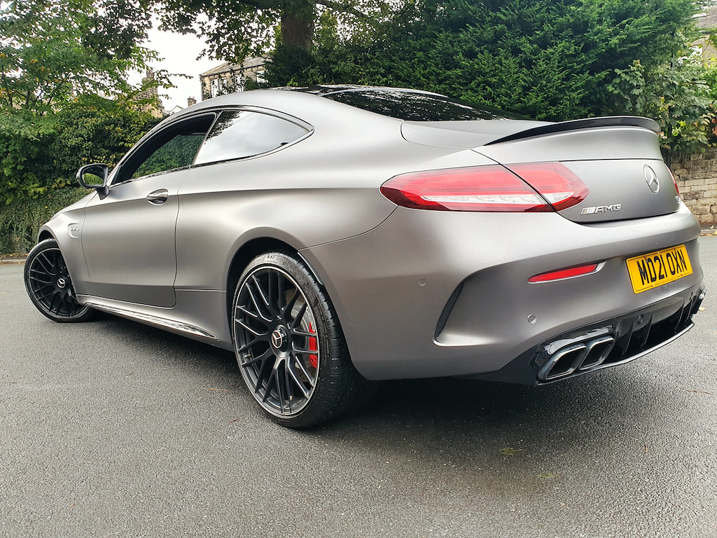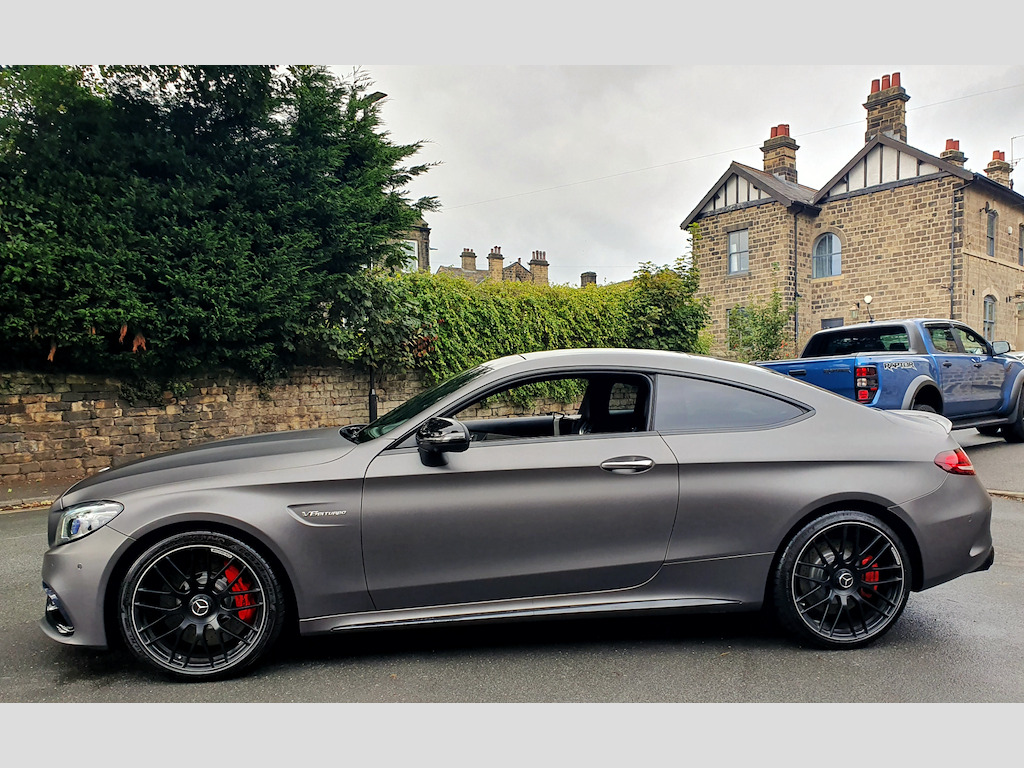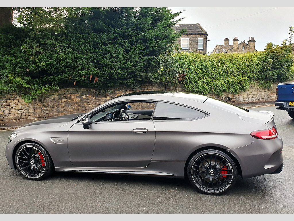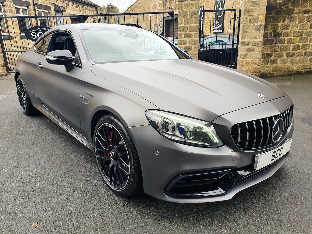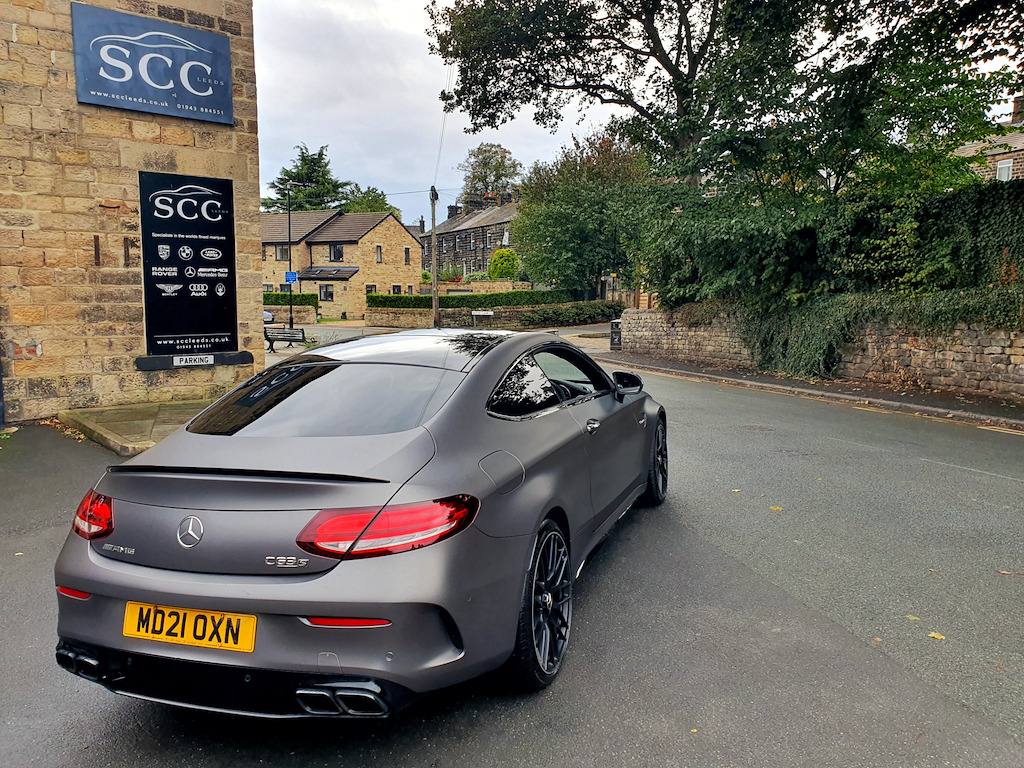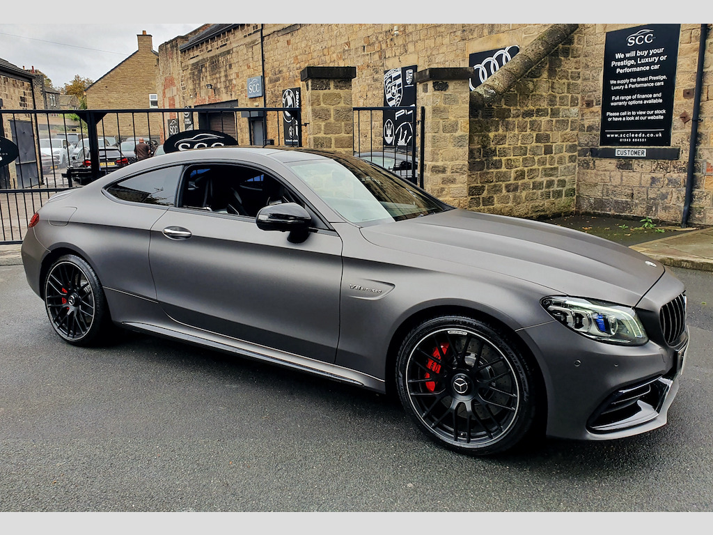 1 owner and full (3) Mercedes Benz main dealer services. Last service (4th) was a Mercedes specialist who also carried out front and rear brake disc and pad change and a couple of tyres in August - £2400 that you do not have to spend! MOT August 2026. 2021 Mercedes-Benz C-Class Coupe – Breathtaking Performance and Luxury Experience the pinnacle of performance and sophistication with this stunning 2021 Mercedes-Benz C-Class Coupe, finished in the striking Selenite Grey Magno (wrap) Obsidion Black underneath. This example benefits from Premium Plus specification and the AMG Night Package, giving it an even more exclusive and commanding presence on the road. The Premium Plus package enhances luxury, technology, and convenience, including a panoramic electric glass sunroof, KEYLESS-GO comfort access, Burmester® Surround Sound System, 360° camera, Active Parking Assist, Multibeam LED headlights with adaptive highbeam assist, and traffic sign assist. These features combine to deliver unmatched comfort, safety, and ease of use, making every journey effortless and enjoyable. Powered by a 4.0L V8 engine producing 503 BHP and paired with a 9-speed automatic transmission, this coupe rockets from 0-62 mph in just 3.9 seconds, delivering spine-tingling acceleration and a driving experience that few cars can match. The AMG-tuned exhaust produces a truly exhilarating soundtrack, with deep, throaty growls at low revs and an aggressive roar when you push the car hard — every drive is an aural and visceral thrill. Handling is equally impressive, with the AMG Electronic Rear Axle Differential Lock enhancing traction and stability through corners, while Active Parking Assist including PARKTRONIC ensures effortless manoeuvring in urban environments. Inside, the ARTICO Leather dashboard with contrast stitching combines elegance and sportiness, while the Automatic Seat-Belt Presenter adds a touch of convenience and sophistication. The panoramic sunroof further enhances cabin ambience, creating an airy, luxurious environment. Additional highlights include MULTIBEAM LED headlights for exceptional night-time visibility and a DAB Digital Radio Tuner, delivering crystal-clear audio to make every journey as enjoyable as it is thrilling. With its perfect blend of jaw-dropping performance, intoxicating exhaust note, cutting-edge technology, and striking design, this Mercedes-Benz C-Class Coupe is a true driver’s car and a standout example of AMG craftsmanship. Don’t miss your chance to own this extraordinary coupe. Contact SCC Leeds on 01943 884551 to arrange a viewing or test drive and experience its breathtaking performance for yourself. 12.3in Digital Instrument Cluster Display,19in Front-20in Rear Alloy Wheels - AMG Forged Cross-Spoke Design Painted Matt Black,360 Degree Camera,ABS - Anti-Lock Braking System,AMG Bonnet with Powerdomes,AMG Boot Lid Spoiler in Black,AMG Boot Logo in Central Screen,AMG Drivers Package,AMG Dynamic Select with a Choice of Driving Modes - Comfort-Sport-Sport Plus-Individual-Race,AMG Electronic Rear Axle Differential Lock,AMG Emblem in Front Head Restraints,AMG Front Apron with A-Wing in High Gloss Black,AMG High-Performance Brake System,AMG Night Package,AMG Performance Exhaust System,AMG Performance Seats,AMG Rear Apron with 4 Diffuser Fins,AMG Ride Control Sports Suspension,AMG Side Sill Panels,AMG Track Pace,ARTICO Leather Dashboard with Contrast Stitching,ATTENTION Assist,Active Bonnet - Pedestrian Safety Measure which Detects an Impact and Raises Bonnet,Active Parking Assist including PARKTRONIC,Adaptive Brake Lamps,Ambient Lighting,Anti Theft Protection Package,Automatic Seat-Belt Presenter for Driver and Front Passenger,Brake Calipers - Red with AMG Lettering,Braking - Adaptive Brake Assist with HOLD Function and Hill Start Assist,Burmester Surround Sound System,COMAND Online System,Central Locking with Interior Switch - Automatic Locking and Crash Sensor with Emergency Opening Function,Collision Prevention Assist Plus,DAB Digital Radio Tuner,Door Mirrors - Electrically Adjustable and Heated,Driving Assistance Package,Dual-Stage Airbags - Driver and Front Passenger - Sidebags in Front Seats - Driver Kneebag - Pelvis Bag and Windowbags for Driver - Front Passenger and Rear Passengers,ESP - Electronic Stability Programme,Electric Parking Brake,Electric Windows 2 - One-Touch Opening and Closing including Obstruction Sensors,Electronic Key - Chrome Surround,First Aid Kit and Warning Triangle,Flared AMG Wings with V8 BITURBO Lettering in the Front,Floor Mats - with Black Leather Edging - Red Piping - AMG Logo,Front Centre Armrest with Stowage Compartment,Front Door Sill Panels with AMG Lettering,Full LED Tail Lights,Gearshift Paddle on Steering Wheel,Head-Up Display,Heated Front Seats,High-Resolution 10.25in Multimedia Colour Display,ISOFIX Child Seat Attachment Points with Top Tether in Rear,Illuminated Glove Compartment,Interior Lighting Package,KEYLESS-GO Comfort Package,MULTIBEAM LED Headlights,Memory Package,Mercedes Me Connect - Standard Services,Mercedes Me Connect - Vehicle Set-Up and Vehicle Monitoring,Mercedes-AMG C63 S Badging at the Rear,Mirror Package,Outside Temperature Display,Panoramic Electric Glass Sunroof,Pre-Wiring for SD Navigation System,Privacy Glass,Race Start Function,Radiator Grille - AMG-Specific Radiator Grille in High-Gloss Chrome with AMG Lettering,Radio Aerial Integrated into Rear Window,Rain Sensing Windscreen Wipers,Remote Boot Release,Reversing Camera,SPEEDTRONIC Cruise Control and Variable Speed Limiter,Seat Belts - Crystal Grey,Seats - Rear Split Folding 40-20-40,Service Indicator ASSYST,Speakers with FrontBass,Sports Pedals in Brushed Stainless Steel with Rubber Studs,Status Display for Rear Seat Belts in Instrument Cluster,Steering - AMG 3 Stage Speed-Sensitive Sports Steering,Steering Wheel - AMG Performance Steering Wheel in Nappa Leather-DINAMICA Microfibre,Steering Wheel - Multi-Function with Audio and Onboard Settings Control,Stowa