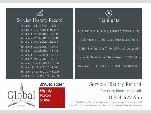 Buy with confidence from an Award Winning Independent Mercedes-Benz Specialist! We are delighted to offer our Factory Ordered Mercedes C Class C180 "Elegance" Automatic 1.8 Petrol finished in "Metallic Palladium Silver" and fitted with a contrasting Alpaca Grey Leather interior with matching door cards. This is the C Class you should be buying - Mega Low Mileage and in Superb Condition! This One Former Doctor Owned vehicle is a "Facelift Model" and is supplied with its Original Manuals, Incredible Full Mercedes-Benz and Specialist Service History Record, MOT until December 2026, HPI Clearance Certificate, Two Keys and a Full and current V5 Logbook. The Service History is one of the finest we have seen, having had 13 Services performed, 11 Mercedes-Benz visits and a further two carried by Specialist Garages. The vehicle has been Serviced at 17,380 miles and is ready to drive away today! The Specification; Alpaca Grey Leather (Electric Operated), Ash Wood Interior Trim, Audio 20 Media System with Becker Preparation Navigation, CD Player, Radio, Auxiliary / USB Inputs, Bluetooth Telephone and Audio Streaming. Parking Guidance (Acoustic / Visual and Front / Rear Sensors), LED Daytime Running Lamps, Cruise Control, Leather Multi Function Steering Wheel and Gear Shifter, Elegance Alloy Wheels (Unmarked), Rain Sensor Wipers, Interior / Exterior Automatically Dimming Mirrors, Power Fold Electric Mirrors, Electric Windows, Cruise Control, Tyre Pres Airbags - Rear Sidebags, Alabandine Grey, Becker Map Pilot Navigation System, Cavansite Blue, Cuprite Brown, Diamond White, Heated Windscreen Washer System, Iridium Silver, Leather - Almond Beige, Leather - Alpaca Grey, Leather - Black, Magnetite Black, Obsidian Black, Palladium Silver, Pearl Beige, Telephone Pre-Wiring with Hands-Free Fac, Trim - Dark Brown Burr Walnut Wood