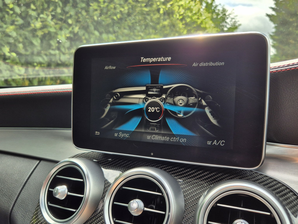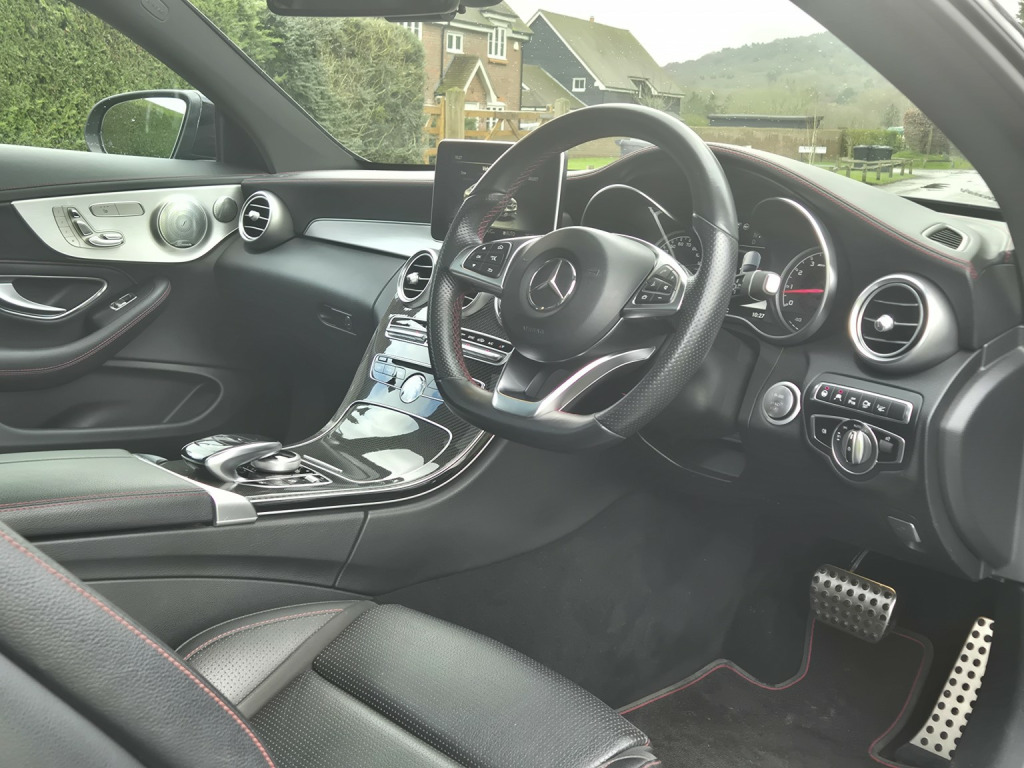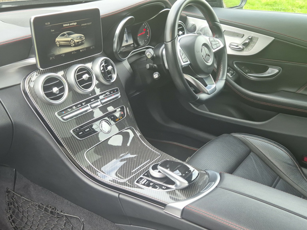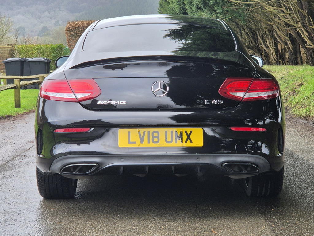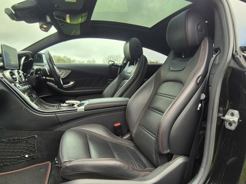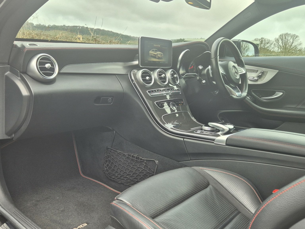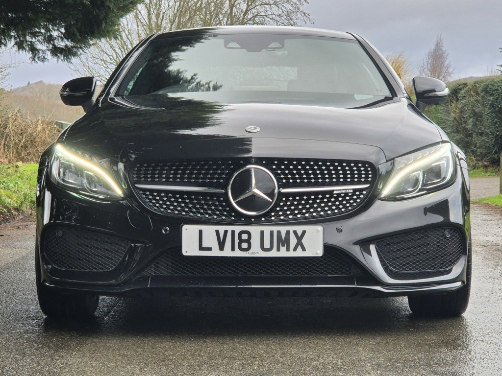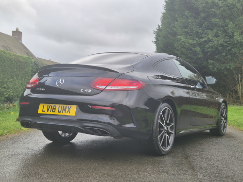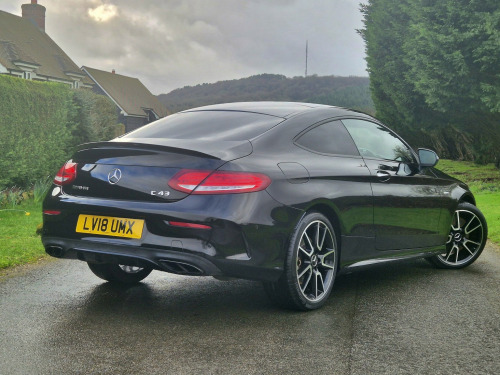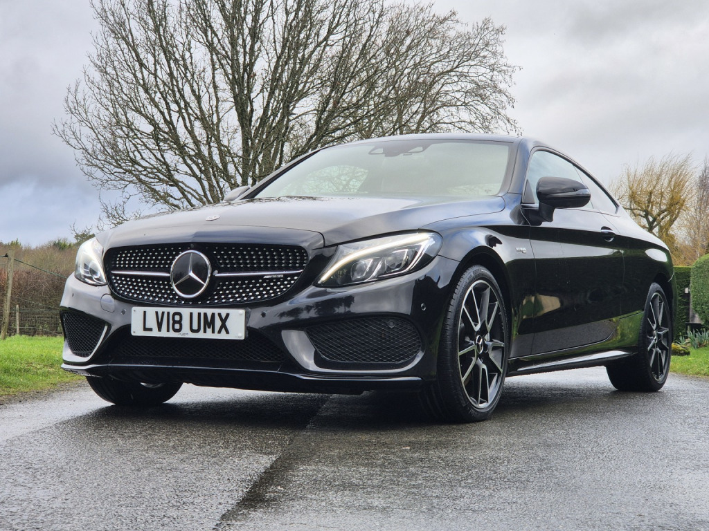 2018 Mercedes-Benz C43 AMG Coupé Premium Plus, finished in Obsidian Black metallic with black leather sports seats featuring red stitching, covering 51,000 miles. An extremely high-specification example presented in fabulous condition throughout. , Building on the already impressive top-of-the-range Premium Plus specification, this car is further enhanced with wireless Apple Car Play, the Driver Assistance Package, including adaptive cruise control, steering assist, self-parking, lane departure warning, blind spot monitoring, and head-up display as well as a switchable factory sports exhaust. , Additional factory upgrades include carbon fibre interior package, Night Package, 360° surround camera system, LED Intelligent Light System, and unmarked 19 bi-colour AMG alloy wheels. , Premium Plus specification highlights include Burmester surround sound system, KEYLESS-GO (keyless entry and start), panoramic glass sunroof, electrically adjustable front seats with memory for driver and passenger, heated front seats, switchable ambient lighting, AMG Performance exhaust, COMAND satellite navigation, Bluetooth phone and audio streaming, automatic headlights and wipers, power-folding door mirrors, privacy glass, and powered boot lid. , Supplied with full service history, 2 keys, and MOT through to February 2027.
