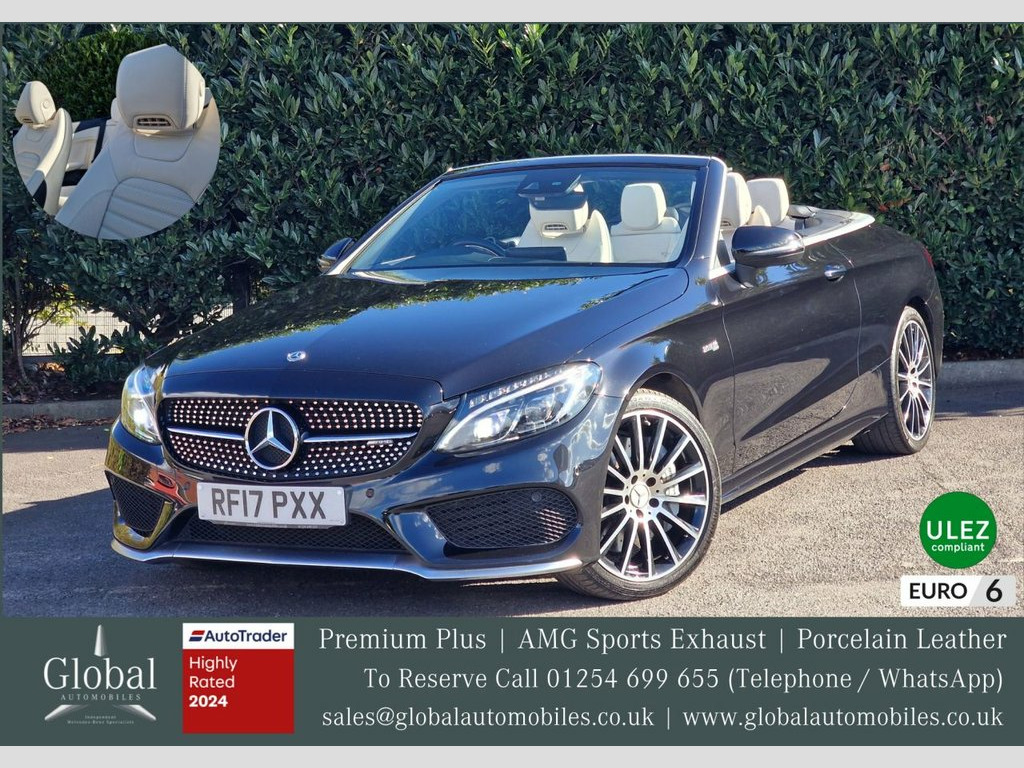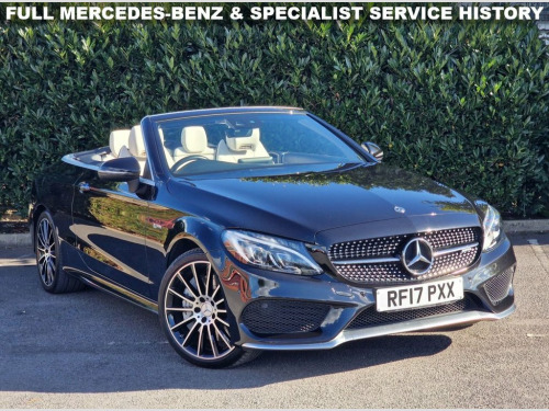 Buy with confidence from an Award Winning Independent Mercedes-Benz Specialist! We are delighted to offer our beautiful Mercedes C43 AMG 4Matic "Premium Plus" Cabriolet Automatic 3.0 V6 Turbo Petrol finished in the highly popular "Metallic Obsidian Black" and fitted with an unmarked Porcelain Natural Leather Sport interior (Memory Electric / Heated) with matching door cards. This is the C43 you should be buying, competitively priced and with a beautiful colour combination. Originally supplied as an ex Demonstrator by Mercedes-Benz of Newbury, this Mercedes has the all important "Premium Plus Package" which is full of factory fit extras. This Mature Gentleman Owned vehicle is supplied with its Original Manuals, Full Mercedes-Benz and Specialist Service History Record, Two Keys, MOT until September 2026, HPI Clearance Certificate and a Full and current V5 Logbook. The Specification; AMG Ride Control, Sports Exhaust System, AMG Exterior / AMG Interior Package, Keyless GO / Keyless Start, 9 Speed Automatic Transmission, AMG Alloy Wheels, Heated Leather, Electric Memory Seat Package, Ambient Interior Illumination Mood LED Lighting, LED Illuminated Sill Plates, Intelligent Lighting Multibeam Dynamic LED Headlamps with Adaptive HighBeam Assist plus and Signature LED Daytime Running Lamps, Leather Clad Dashboard, COMAND Media Interface with Post Code Entry Navigation, DAB Satellite Digital Radio, CD Player, USB/Auxiliary Inputs, Bluetooth Audio St 19in Alloy Wheels - AMG 5-Twin-Spoke Des, Headlamps - LED Intelligent Light System, Leather - Porcelain, Obsidian Black