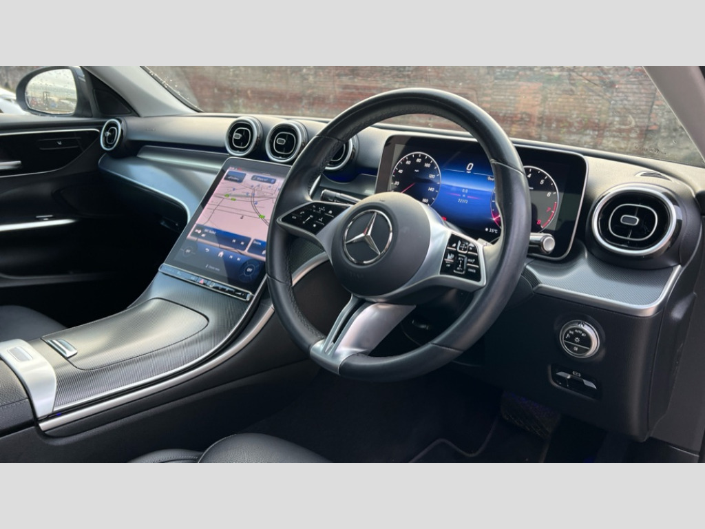 Mercedes-Benz C Class C200 Sport 4dr 9G-Tronic 11.9" high resolution multimedia colour display, 12.3" digital instrument cluster display, Active blind spot assist, Active brake assist plus, Active lane keeping assist, Attention assist, Cruise control with speedtronic variable speed limiter, Direct steer speed sensitive steering, DYNAMIC SELECT with a choice of driving modes (ECO, Comfort, Sport, Sport+ and Individual), E-call, Extended MBUX functions, Finger print sensor, Fluorescent jacket for driver, MBUX navigation premium, MBUX voice control activated by keywords "Hey Mercedes", Mercedes connect me, Mercedes me remote services, Outside temperature gauge, Pre-installation for digital key transfer, Remote boot release, Service indicator (ASSYST), Smartphone integration, Status display for rear seat belts in instrument cluster, 66l fuel tank with increased capacity, 9G TRONIC 9 speed automatic transmission, Agility control comfort suspension with selective damping system and lowered by 15mm, Petrol Particulate Filter, DAB Digital radio, MBUX multimedia system, Adaptive brake lights, Adaptive high beam assist, B-pillar trim in glossy black, Body coloured bumpers, Body coloured door mirrors, Chrome beltline trim, Daytime running lights, Dynamic design front bumper with chrome trims and air intakes in black, Electric windows with one touch opening/closing and obstruction sensors, Electrically adjustable and heated door mirrors, Green tinted glass, LED high performance headlamps, LED Indicators, LED tail lights, LED third brake light, Non visible exhaust pipes, Powerdomes on bonnet, Radiator grille with integrated star and single louvre in matt iridium silver with chrome trim, Radio aerial integrated into rear window, Rain sensor with automatic windscreen wiper activation, Rear boot, Rear bumper in vehicle colour with chrome wing in centre, Rear side wing doors, Side skirts in vehicle colour, Side windows surround in polished aluminium, 3 spoke leather multi function steering wheel with silver chrome trim and perforated leather in grip area, 40:20:40 split folding rear bench seat, Audio and onboard settings control on multifunction steering wheel, Auto Mercedes-Benz child seat recognition sensor, Black air vents with silver chrome elements, Black floor mats, Black roof liner, Door trim elements high gloss black with silver chrome surroundings and switches, Double cupholder in centre console, Folding rear seat backrest, Front and rear head restraints, Front centre armrest with storage compartment, Front door sills with Mercedes Benz lettering, Gearshift paddles on steering wheel, Heated front seats, Illuminated glove compartment stowage, Leather upholstery, Manually height and reach adjustable steering column, Overhead control unit in high gloss black, Rear top tether child seat ISOFIX attachment, Single front passenger seat, Sunvisors with illuminated vanity mirrors, THERMATIC 2 zone automatic climate control, Interior lighting package - C Class, Mirror pack - C Class, Parking package with reversing camera - C Class, Seat comfort pack - C Class, Stowage space pack - C Class, USB package - C Class, 3 rear 3 point seatbelts, Active bonnet pedestrian safety measure which detects an impact and raises bonnet, Adaptive brake system with HOLD function and brake drying in the wet, Anti-lock braking system (ABS), Black seat belts, Child proof door locks, Drivers knee airbag, Drivers pelvis airbag, Dual stage driver/passenger airbags, Electric parking brake, Electronic Stability Programme (ESP), Front centre airbag between driver and front passenger seats, Front side airbags, Rear passenger airbag, Rear seatbelt warning indicator, Tyre pressure monitoring system, Warning triangle and first aid kit, Window airbags, Central locking with interior switch, automatic locking and crash sensor with emergency opening function, Chrome surround in electric key, URBAN GUARD vehicle protection (Thatcham Category 1) consisting of break-in, anti-theft alarm system (ATA),interior monitoring and tow-away protection, Centre console trim in silver grey diamond pattern, Dashboard in black with contrast stitching, 17" 5 spoke design alloy wheels painted in black with high sheen finish, Summer tyres, TIREFIT with tyre inflation compressor