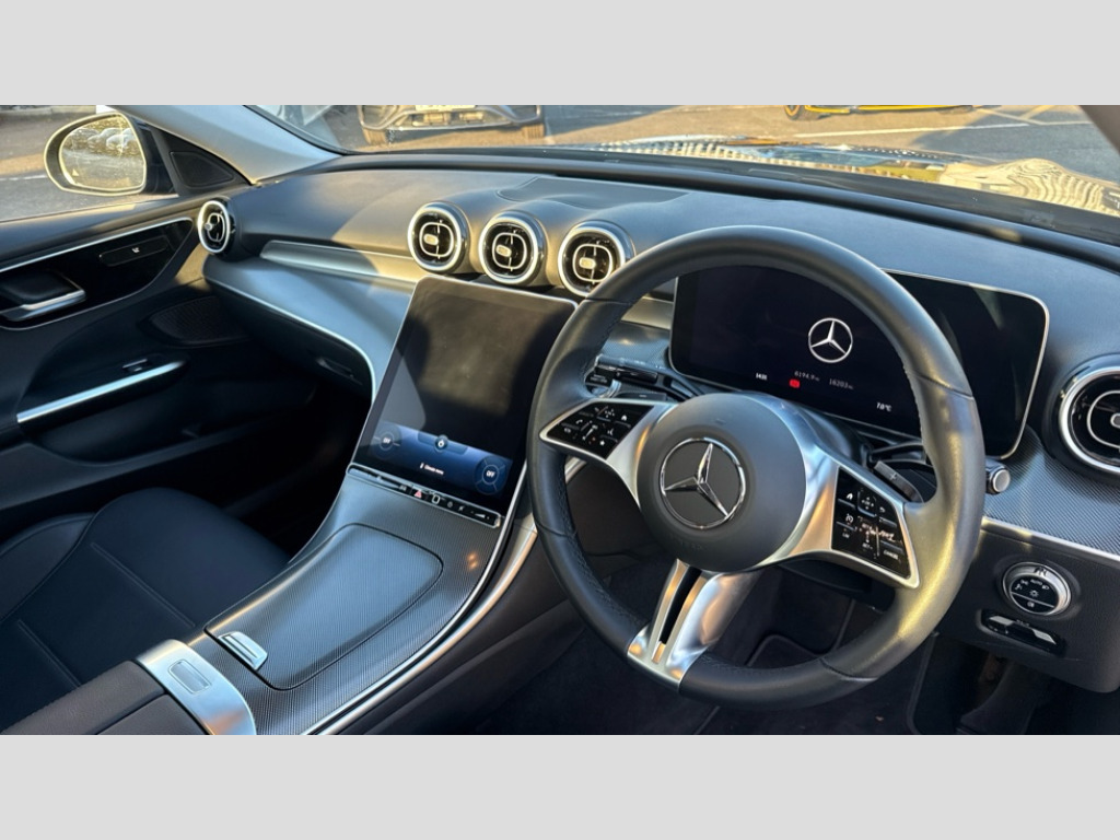 Mercedes-Benz C Class C200 Sport 4dr 9G-Tronic 11.9" high resolution multimedia colour display, 12.3" digital instrument cluster display, Active blind spot assist, Active brake assist plus, Active lane keeping assist, Attention assist, Cruise control with speedtronic variable speed limiter, Direct steer speed sensitive steering, DYNAMIC SELECT with a choice of driving modes (ECO, Comfort, Sport, Sport+ and Individual), E-call, Extended MBUX functions, Finger print sensor, Fluorescent jacket for driver, MBUX navigation premium, MBUX voice control activated by keywords "Hey Mercedes", Mercedes connect me, Mercedes me remote services, Outside temperature gauge, Pre-installation for digital key transfer, Remote boot release, Service indicator (ASSYST), Smartphone integration, Status display for rear seat belts in instrument cluster, Wireless charging system for mobile devices, 66l fuel tank with increased capacity, 9G TRONIC 9 speed automatic transmission, Agility control suspension with selective damping system and lowered by 15mm, Petrol Particulate Filter, DAB Digital radio, MBUX multimedia system, Steering wheel mounted audio controls, Adaptive brake lights, Adaptive high beam assist, B-pillar trim in glossy black, Body coloured bumpers, Body coloured door mirrors, Chrome beltline trim, Daytime running lights, Dynamic design front bumper with chrome trims and air intakes in black, Electric windows with one touch opening/closing and obstruction sensors, Electrically adjustable and heated door mirrors, Green tinted glass, LED high performance headlamps, LED Indicators, LED tail lights, LED third brake light, Non visible exhaust pipes, Powerdomes on bonnet, Radiator grille with integrated star and single louvre in matt iridium silver with chrome trim, Radio aerial integrated into rear window, Rain sensor with automatic windscreen wiper activation, Rear boot, Rear bumper in vehicle colour with chrome wing in centre, Rear side wing doors, Side skirts in vehicle colour, Side windows surround in polished aluminium, 3 spoke leather multi function steering wheel with silver chrome trim and perforated leather in grip area, Auto Mercedes-Benz child seat recognition sensor, Black air vents with silver chrome elements, Black floor mats, Black roof liner, Door trim elements high gloss black with silver chrome surroundings and switches, Double cupholder in centre console, Folding rear seat backrest, Front and rear head restraints, Front centre armrest with storage compartment, Front door sills with Mercedes Benz lettering, Gearshift paddles on steering wheel, Heated front seats, Illuminated glove compartment stowage, Leather upholstery, Manually height and reach adjustable steering column, Overhead control unit in high gloss black, Rear top tether child seat ISOFIX attachment, Single front passenger seat, Sunvisors with illuminated vanity mirrors, THERMATIC 2 zone automatic climate control, Interior lighting package - C Class, Mirror pack - C Class, Parking package with reversing camera - C Class, Seat comfort pack - C Class, Stowage space pack - C Class, USB package - C Class, 3 rear 3 point seatbelts, Active bonnet pedestrian safety measure which detects an impact and raises bonnet, Adaptive brake system with HOLD function and brake drying in the wet, Anti-lock braking system (ABS), Black seat belts, Child proof door locks, Drivers knee airbag, Drivers pelvis airbag, Dual stage driver/passenger airbags, Electric parking brake, Electronic Stability Programme (ESP), Front centre airbag between driver and front passenger seats, Front side airbags, Rear passenger airbag, Rear seatbelt warning indicator, Tyre pressure monitoring system, Warning triangle and first aid kit, Window airbags, Central locking with interior switch, automatic locking and crash sensor with emergency opening function, Chrome surround in electric key, URBAN GUARD vehicle protection (Thatcham Category 1) consisting of break-in, anti-theft alarm system (ATA),interior monitoring and tow-away protection, Centre console trim in silver grey diamond pattern, Dashboard in black with contrast stitching, 17" 5 spoke design alloy wheels painted in black with high sheen finish, Summer tyres, TIREFIT with tyre inflation compressor