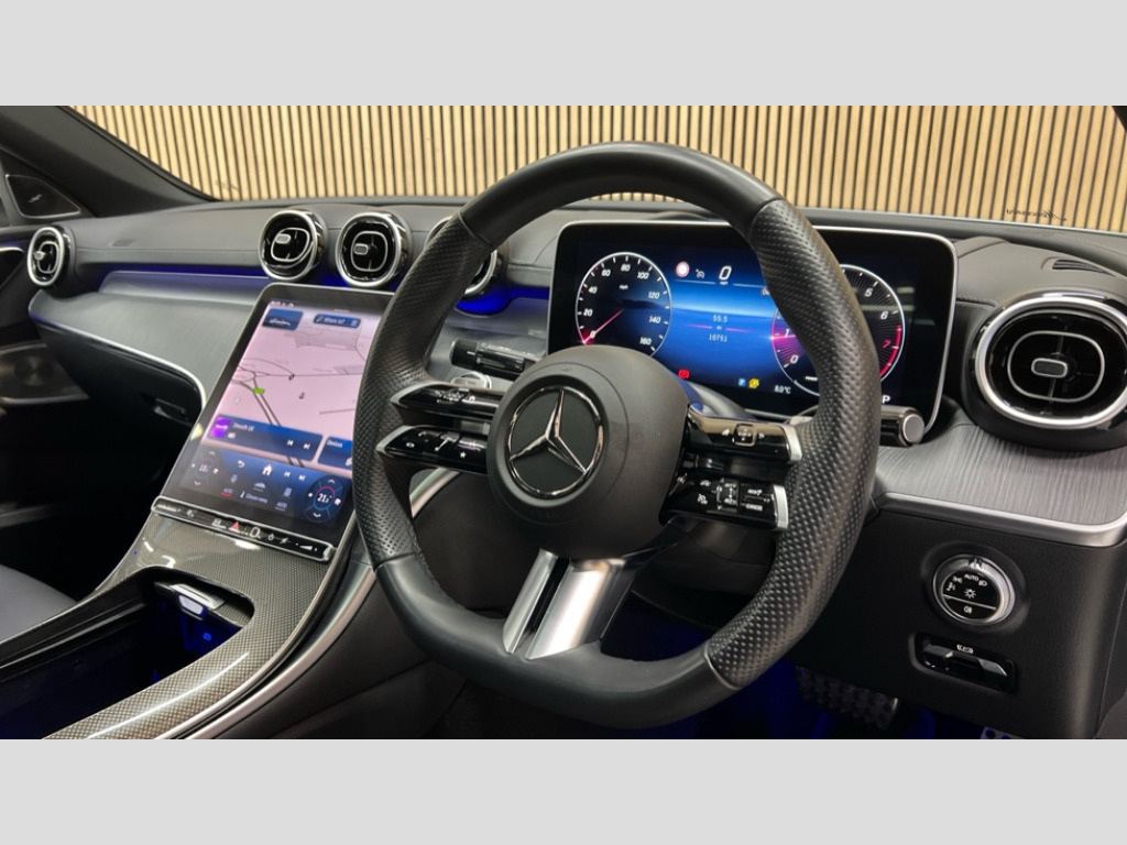 Mercedes-Benz C Class C300 AMG Line Premium Plus 4dr 9G-Tronic 11.9" high resolution multimedia colour display, 12.3" digital instrument cluster display, Active parking assist with PARKTRONIC, Attention assist, DYNAMIC SELECT with a choice of driving modes (Comfort, ECO, Sport, Sport+, Individual), E-call, Extended MBUX functions, Finger print sensor, Fluorescent jacket for driver, Hard disc navigation, Head up Display, MBUX navigation premium, Mercedes me remote services, Outside temperature gauge, Service indicator (ASSYST), Smartphone integration, Sports direct steer speed sensitive steering, Status display for rear seat belts in instrument cluster, Traffic sign assist, Wireless charging system for mobile devices, 9G TRONIC 9 speed automatic transmission, Petrol Particulate Filter, Sport suspension, Burmester 3D surround sound system, DAB Digital radio, MBUX multimedia system, Adaptive brake lights, Adaptive high beam assist plus, AMG body styling front apron, rear apron and side skirts, AMG Line exterior, Body coloured bumpers, Body coloured door mirrors, Digital light LED headlamps, Electric panoramic glass sunroof, Electric windows with one touch opening/closing and obstruction sensors, Electrically adjustable and heated door mirrors, Heat insulating dark tinted glass, LED daytime running lights, LED Indicators, LED tail lights, LED third brake light, Noise acoustic glass, Radiator diamond grille with integrated Mercedes Benz star and louvre silver with chrome pins, Rain sensor with automatic windscreen wiper activation, Rear boot, Rear side wing doors, Two visible exhaust pipes integrated into rear bumper, 3 seat bench in 2nd row, 40:20:40 split folding rear bench seat, Ambient lighting premium, Ambient lighting with projection of brand logo, AMG floor mats, AMG line interior, Artico man-made leather upholstery, Auto Mercedes-Benz child seat recognition sensor, Black roof liner, Boot lid convenience closing feature, Comfort seats, Double cupholder in centre console, Electrically height/reach adjustable steering column, Folding rear seat backrest, Front and rear head restraints, Gearshift paddles on steering wheel, Illuminated door sills with Mercedes Benz lettering, Illuminated glove compartment stowage, Multifunction sports steering wheel in nappa leather, Rear top tether child seat ISOFIX attachment, Single front passenger seat, Sunvisors with illuminated vanity mirrors, THERMATIC 2 zone automatic climate control, AIR BALANCE Package - C Class, Energizing package plus - C Class, Interior light package - C Class, Keyless go comfort package - C Class, Memory package - C Class, Mirror package - C Class, Parking package with 360 degree camera - C Class, Stowage space pack - C Class, USB package plus - C Class, 3 rear 3 point seatbelts, Active bonnet pedestrian safety measure which detects an impact and raises bonnet, Adaptive brake system with HOLD function and brake drying in the wet, Anti-lock braking system (ABS), Black seat belts, Brake calipers with Mercedes-Benz lettering + perforated front brake discs, Child proof door locks, Drivers knee airbag, Drivers pelvis airbag, Dual stage driver/passenger airbags, Electric parking brake, Electronic Stability Programme (ESP), Front centre airbag between driver and front passenger seats, Front side airbags, Tyre pressure monitoring system, Warning triangle and first aid kit, Window airbags for driver, front passenger and rear passenger, Antitheft alarm system, Interior monitoring system and Increased antitheft protection, Central locking with interior switch, automatic locking and crash sensor with emergency opening function, Chrome surround in electric key, Urban guard vehicle protection plus, Black open pore aluminium lines wood trim with centre console in metal structure finish, Dashboard, instrument panel and beltlines in ARTICO man made leather in nappa look, 19" AMG multi spoke light alloy wheels painted black with high sheen finish, TIREFIT with tyre inflation compressor