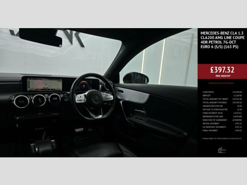 2020 Mercedes-Benz CLA – Premium Coupe with Luxury & Technology  The 2020 Mercedes-Benz CLA blends sleek coupe styling with cutting-edge technology and refined comfort. Powered by Mercedes' advanced engineering, it delivers a sporty yet comfortable drive, supported by features like cruise control, speed limiter, four-wheel drive, and paddle shift gear change for a truly engaging experience. Step inside and enjoy the luxury black leather interior, heated sports seats, multifunction leather steering wheel, and advanced driver information system. Convenience comes as standard with keyless entry, front and rear electric windows, power sockets front and rear, and dual-zone air conditioning. Stay connected and entertained with Apple CarPlay, Android Auto, satellite navigation, Bluetooth hands-free, and premium in-car entertainment with CD/radio. Parking is effortless thanks to front & rear parking sensors, intelligent parking assist, and reversing camera. Safety is a top priority, with multiple airbags, ABS brakes, electronic stability programme, traction control, ISOFIX child seat points, tyre pressure monitoring, and rain-sensing wipers. On the outside, the CLA features alloy wheels, body-coloured bumpers, LED lighting, and power-folding heated mirrors for a premium road presence. With its main dealer service history, striking design, and advanced features, this 2020 CLA is the perfect combination of style, comfort, and technology. Speed Limiter, Cruise Control, Apple CarPlay // Android Auto, ABS Brakes, Air Bag Driver, Air Bag Passenger, Air Bag Side - Curtain, Air Bag Side - Driver/Passenger, Air Bag Side - Front & Rear Curtain, Air Bag Side -Front Side & Front Cur, Alarm, Central Door Locking - Key, Central Door Locking - Remote, Central Locking, Centre Rear Seat Belt, Child Locks, Computer - Driver Information System, Drivers Information System, Electronic Brake Force Distribution, Electronic Stability Programme, External Temperature Display, Four Wheel Drive, Front and Rear Parking Sensors, Front Fog Lights, Front Head Restraints, Head Air Bags - Front, Head Air Bags - Front/Rear, Heated Rear Screen, Intel