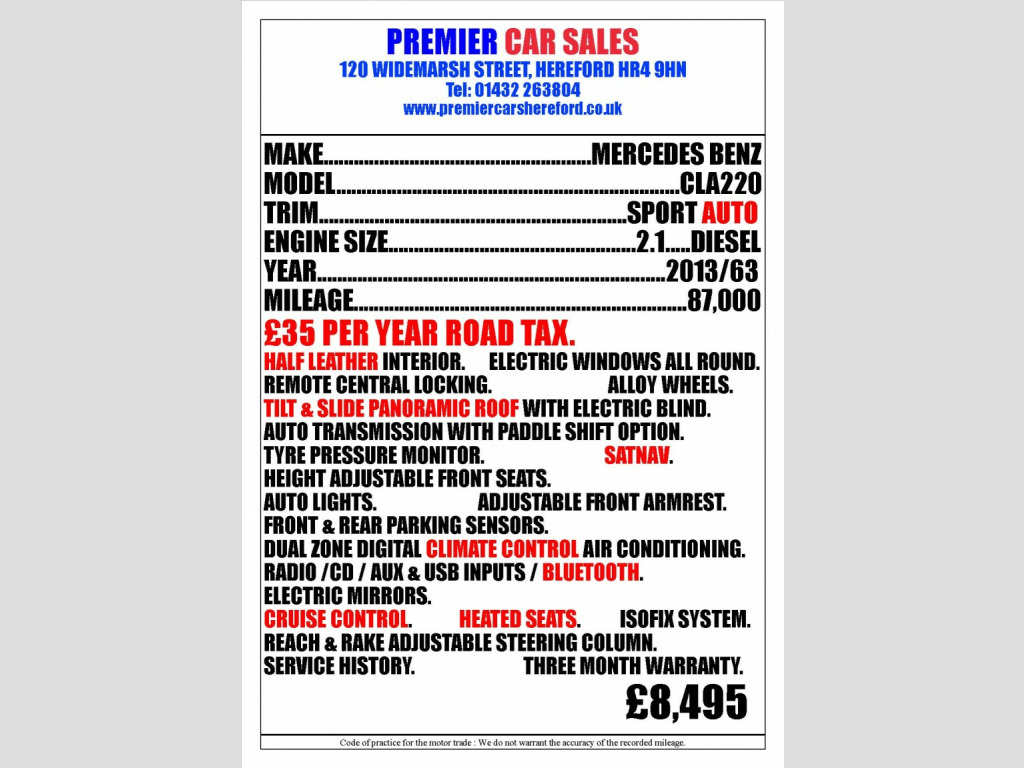A well maintained and nicely specified example of this automatic saloon Mercedes, and only £35 per year to tax!, Stylish looking car with frameless windows and some stand-out features make this a little above the norm. Solid Service History with nine records. Remote Central Locking with two keys present. Alloy Wheels. Front & Rear Parking Sensors. Half Leather Interior. ISOFIX System. Height Adjustment to both front seats. Electric Windows all round. Electric Mirrors. Auto Lights. Dual Zone Digital Climate Control Air Conditioning. Radio/CD with AUX & USB Inputs + Bluetooth Connection. Heated Seats. Illuminated Kick Plates. Auto Transmission with manual paddle shift option. Cruise Control with speed limiter option. SATNAV. ESP Traction Control. Tyre Pressure Monitor. Reach & Rake Adjustable SteerinG Column. Adjustable Front Armrest. Full Panoramic Roof with tilt and slide front section and electrically operated blind. We are at 120 Widemarsh Street, Hereford, HR4 9HN. Our website with full details is : www.premiercarshereford.co.uk, All of our vehicles are supplied with a three month warranty and long MOT. Card payments are welcomed and part exchanges are gladly considered. Low rate finance arranged, subject to status. Please call us on 01432263804 or 07831564655 for more information.