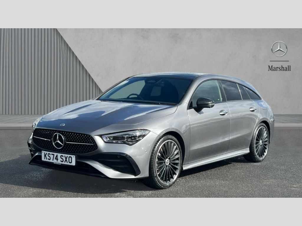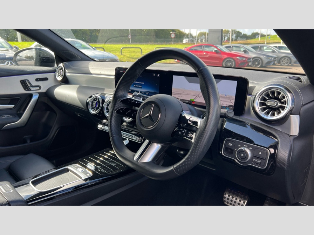 Mercedes-Benz CLA Class CLA 200 AMG Line Premium Plus 5dr Tip Auto 10.25 inch Instrument display with digital cockpit, 10.25 inch touchscreen central media display, Active lane keeping assist, Attention assist - Monitors steering behaviour and long journey fatigue, Bluetooth connection, Car wash mode, Cruise control with limiter, Direct steer system, DYNAMIC SELECT with a choice of driving modes (ECO, Comfort, Sport and Individual), ECO start/stop function, Fingerprint sensor, Fluid level warning indicator for fuel, oil, coolant and washer fluid, Hard-disk navigation, Head up Display, Hey Mercedes Voice activation, Lamp failure indicator, MBUX augmented reality for navigation, Mercedes me connect including emergency call system, accident recovery, breakdown and maintenance management, Mercedes me remote services, Outside temperature gauge, Owners manual in English, Pre-installation of private car share, Radio aerial integrated into front and rear windshields, Service indicator (ASSYST), Smartphone integration with Apple CarPlay and Android auto, Tailgate, Traffic sign assist, Trip computer in multifunction display with current consumption indicator, Wireless charging in the front centre console, Comfort suspension with ride height lowering, Rear axle multi-link, Burmester lettering on the speakers, Burmester surround sound system (710W) with dolby atmos, speakers - 1 central, 1 woofer, 1 tweeter, 1 subwoofer with 60W, 2 in C pillar, DAB digital radio tuner, MBUX multimedia system, Pre installation for Mercedes Benz Link, Adaptive brake lights, AMG body styling with AMG front apron and rear apron and visible exhaust tailpipe in chrome trim elements, Body colour door handles, Electric panoramic sunroof with automatic tilt and convenience closing fuinctions, rain sensor auto closing and electronic roller sunblind, Electric windows, Electrically adjustable and heated door mirrors with integrated LED indicators, Exhaust system with 2 Visible tailpipe trim elements and rear apron with trim in chrome, Hand free access, Headlamp assist automatic headlamp activation, Heated glass rear windscreen + timer control, High level LED third brake light, Integrated LED daytime running lights, Interior mirror with black reading lamps and frameless, LED tail lamp, Multibeam LED headlamps with adaptive highbeam assist plus, Privacy glass with dark tinting on rear side windows and rear window, Radiator grille with Mercedes-Benz pattern in chrome and central Mercedes star, single louvre in high-gloss black with chrome inserts, Rain sensing windscreen wipers with two sensitivity settings, Rear fog lamp, Rear side wing doors, Rear wiper, Variable front intermittent wipers, 3 seat bench in 2nd row, 3 twin spoke flattened multifunction steering wheel in nappa leather - horizontal twin spoke in high gloss black, vertical twin spoke in silver chrome, 40:20:40 split folding rear seat backrests, Air conditioning - Two zone thermotronic luxury automatic climate control with display, Air vents with surround in silver chrome, Automatic child seat recognition sensor, Black roof lining, Brushed stainless steel sports pedals with rubber studs, Electrically adjustable front memory seats including 4 way lumbar support, Floor mats with stitched AMG lettering, Fluorescent jacket, Front centre armrest with stowage, Galvanished gear shift paddles in silver chrome, Illuminated front door sills with Mercedes Benz lettering and changeable cover, Interior lighting - 64 colour Ambient lighting, Luggage net on driver/front passenger seat backrest, Manually height and reach adjustable steering column, Rear armrest with two integral cup holders for drinks, Rear head restraints, Single front passenger seat, Sport seats with fixed head restraints, Stowage compartment in centre console with retractable cover, Sunvisors with illuminated vanity mirrors, Twin front cupholders, Two outer rear seat isofix and top tether child seat fixing points, Keyless go comfort pack - CLA with easy pack tailgate, Light and sight pack - CLA, Mirror pack - CLA, Night package - CLA, Parking pack with 360 degree camera - CLA, Seat comfort pack - CLA, USB package plus - CLA, Winter pack - CLA, Active bonnet pedestrain safety measure which detects an impact and raises bonnet by 65mm, Adaptive brake assist with hold function and hill start assist, Anti lock braking system (ABS) with brake assist, Black seat belts, Bonnet with power domes, Brake calipers with Mercedes-Benz lettering, Brake pad wear warning indicator, Childproof locks manually operated for rear doors and electrically operated for rear power windows, Crash responsive emergency lighting, Driver and front passenger head and sidebags, Driver and front passenger windowbags, Drivers knee airbag, Dual stage driver and front passenger airbags, Electric parking brake, Electronic stability programme with acceleration skid control, ESP curve dynamic assist, Exit warning, Front and rear seatbelt reminder, Front passenger seat occupancy sensor, Perforated front brake discs, Sports braking system, Three point rear seat belts, Tyre pressure monitoring system, Warning triangle and first aid kit, Alarm system with immobiliser and interior protection -Thatcham category 1, Guard 360 deg vehicle protection - tow away protection with visual, acoustic warning, interior monitoring, preinstallation for parking damage, Remote central locking and crash sensor with emergency opening function, Light aluminium with longitudinal grain interior trim, 19" AMG multi-spoke black painted light alloy wheels with high sheen rim finish, Summer tyres, Tirefit tyre sealant kit