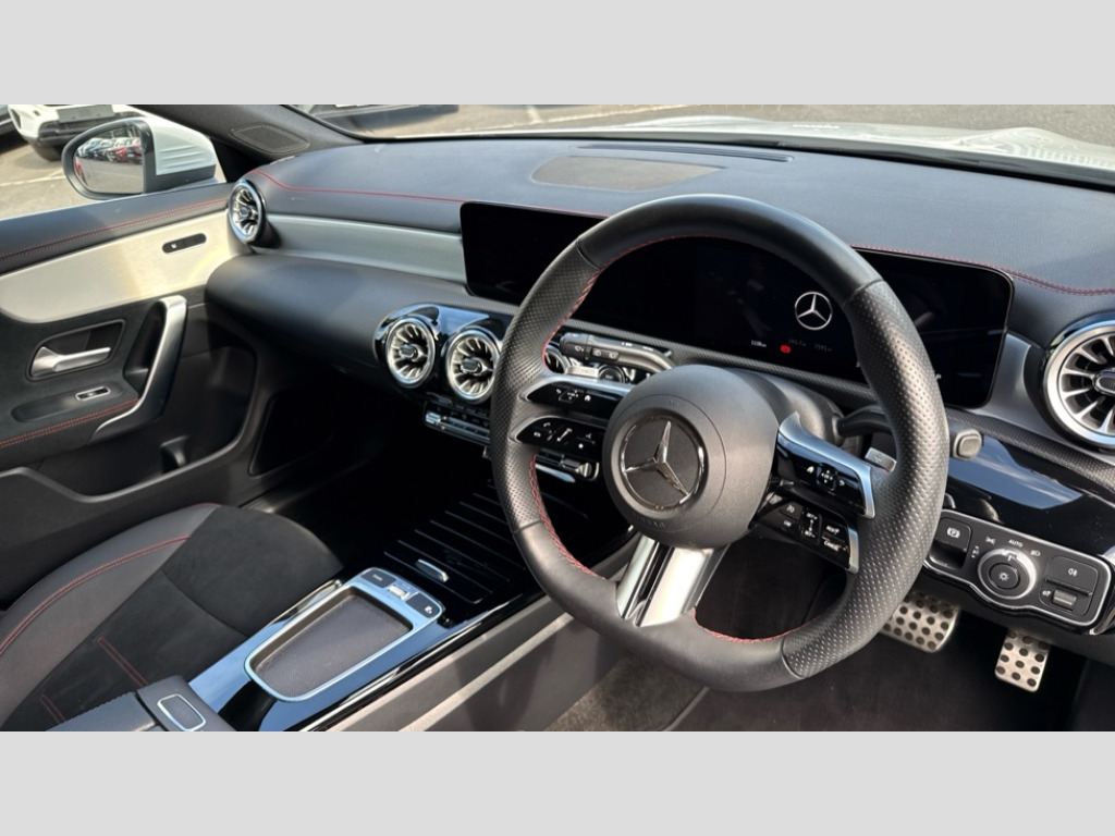 Mercedes-Benz CLA Class CLA 220d AMG Line Premium 5dr Tip Auto 10.25 inch Instrument display with digital cockpit, 10.25 inch touchscreen central media display, Active lane keeping assist, Attention assist - Monitors steering behaviour and long journey fatigue, Blind spot assist, Bluetooth connection, Car wash mode, Cruise control with limiter, Direct steer system, DYNAMIC SELECT with a choice of driving modes (ECO, Comfort, Sport and Individual), ECO start/stop function, Fluid level warning indicator for fuel, oil, coolant and washer fluid, Hard-disk navigation, Hey Mercedes Voice activation, Lamp failure indicator, MBUX augmented reality for navigation, Mercedes me connect including emergency call system, accident recovery, breakdown and maintenance management, Mercedes me remote services, Outside temperature gauge, Owners manual in English, Pre-installation of private car share, Radio aerial integrated into front and rear windshields, Service indicator (ASSYST), Smartphone integration with Apple CarPlay and Android auto, Speed limit assist, Tailgate, Trip computer in multifunction display with current consumption indicator, Wireless charging in the front centre console, Comfort suspension with ride height lowering, Rear axle multi-link, DAB digital radio tuner, MBUX multimedia system, Mercedes Benz advanced sound system (225 W) with 10 speakers, 1 central speaker, speakers on doors, a tweeter on door,one sub woofer + boost amplifier, Pre installation for Mercedes Benz Link, Adaptive brake lights, AMG body styling with AMG front apron and rear apron and visible exhaust tailpipe in chrome trim elements, Body colour door handles, Chrome beltline strips, Electric windows, Electrically adjustable and heated door mirrors with integrated LED indicators, Exhaust system with 2 Visible tailpipe trim elements and rear apron with trim in chrome, Hand free access, Headlamp assist automatic headlamp activation, Heated glass rear windscreen + timer control, High level LED third brake light, Interior mirror with black reading lamps and frameless, LED high performance headlamps with integrated LED daytime running lights and adaptive highbeam assist, LED tail lamp, Privacy glass with dark tinting on rear side windows and rear window, Radiator grille with Mercedes-Benz pattern in chrome with central Mercedes star and single louvre with chrome inserts, Rain sensing windscreen wipers with two sensitivity settings, Rear fog lamp, Rear side wing doors, Rear wiper, Variable front intermittent wipers, Window line trim strip in high gloss aluminium, 3 seat bench in 2nd row, 3 twin spoke flattened multifunction steering wheel in nappa leather - horizontal twin spoke in high gloss black, vertical twin spoke in silver chrome, 4 way lumbar support, 40:20:40 split folding rear seat backrests, Air conditioning - Two zone thermotronic luxury automatic climate control with display, Air vents with surround in silver chrome, Artico man-made leather/Microcut microfibre upholstery, Automatic child seat recognition sensor, Black roof lining, Brushed stainless steel sports pedals with rubber studs, Floor mats with stitched AMG lettering, Fluorescent jacket, Front centre armrest with stowage, Galvanished gear shift paddles in silver chrome, Heated front seats, Illuminated front door sills with Mercedes Benz lettering and changeable cover, Interior lighting - 64 colour Ambient lighting, Luggage net on driver/front passenger seat backrest, Manually height and reach adjustable steering column, Rear armrest with two integral cup holders for drinks, Rear head restraints, Single front passenger seat, Sport seats with fixed head restraints, Stowage compartment in centre console with retractable cover, Sunvisors with illuminated vanity mirrors, Twin front cupholders, Two outer rear seat isofix and top tether child seat fixing points, Keyless go comfort pack - CLA with easy pack tailgate, Light and sight pack - CLA, Mirror pack - CLA, Parking pack with reversing camera - CLA, Seat comfort pack - CLA, USB package plus - CLA, Active bonnet pedestrain safety measure which detects an impact and raises bonnet by 65mm, Active brake assist includes forward collision warning system with autonomous braking, Adaptive brake assist with hold function and hill start assist, Anti lock braking system (ABS) with brake assist, Black seat belts, Bonnet with power domes, Brake calipers with Mercedes-Benz lettering, Brake pad wear warning indicator, Childproof locks manually operated for rear doors and electrically operated for rear power windows, Crash responsive emergency lighting, Driver and front passenger head and sidebags, Driver and front passenger windowbags, Drivers knee airbag, Dual stage driver and front passenger airbags, Electric parking brake, Electronic stability programme with acceleration skid control, ESP curve dynamic assist, Exit warning, Front and rear seatbelt reminder, Front passenger seat occupancy sensor, Perforated front brake discs, Sports braking system, Three point rear seat belts, Tyre pressure monitoring system, Warning triangle and first aid kit, Alarm system with immobiliser and interior protection -Thatcham category 1, Guard 360 deg vehicle protection - tow away protection with visual, acoustic warning, interior monitoring, preinstallation for parking damage, Remote central locking and crash sensor with emergency opening function, Light aluminium with longitudinal grain interior trim, 19" AMG multi spoke light alloy wheels painted in titanium grey with high sheen finish, Summer tyres, Tirefit tyre sealant kit