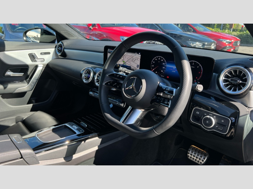 Mercedes-Benz CLA Class CLA 220d AMG Line Premium Plus 5dr Tip Auto 10.25 inch Instrument display with digital cockpit, 10.25 inch touchscreen central media display, Active lane keeping assist, Attention assist - Monitors steering behaviour and long journey fatigue, Bluetooth connection, Car wash mode, Cruise control with limiter, Direct steer system, DYNAMIC SELECT with a choice of driving modes (ECO, Comfort, Sport and Individual), ECO start/stop function, Fingerprint sensor, Fluid level warning indicator for fuel, oil, coolant and washer fluid, Hard-disk navigation, Head up Display, Hey Mercedes Voice activation, Lamp failure indicator, MBUX augmented reality for navigation, Mercedes me connect including emergency call system, accident recovery, breakdown and maintenance management, Mercedes me remote services, Outside temperature gauge, Owners manual in English, Pre-installation of private car share, Radio aerial integrated into front and rear windshields, Service indicator (ASSYST), Smartphone integration with Apple CarPlay and Android auto, Tailgate, Traffic sign assist, Trip computer in multifunction display with current consumption indicator, Wireless charging in the front centre console, Comfort suspension with ride height lowering, Rear axle multi-link, Burmester lettering on the speakers, Burmester surround sound system (710W) with dolby atmos, speakers - 1 central, 1 woofer, 1 tweeter, 1 subwoofer with 60W, 2 in C pillar, DAB digital radio tuner, MBUX multimedia system, Pre installation for Mercedes Benz Link, Adaptive brake lights, AMG body styling with AMG front apron and rear apron and visible exhaust tailpipe in chrome trim elements, Body colour door handles, Electric panoramic sunroof with automatic tilt and convenience closing fuinctions, rain sensor auto closing and electronic roller sunblind, Electric windows, Electrically adjustable and heated door mirrors with integrated LED indicators, Exhaust system with 2 Visible tailpipe trim elements and rear apron with trim in chrome, Hand free access, Headlamp assist automatic headlamp activation, Heated glass rear windscreen + timer control, High level LED third brake light, Integrated LED daytime running lights, Interior mirror with black reading lamps and frameless, LED tail lamp, Multibeam LED headlamps with adaptive highbeam assist plus, Privacy glass with dark tinting on rear side windows and rear window, Radiator grille with Mercedes-Benz pattern in chrome and central Mercedes star, single louvre in high-gloss black with chrome inserts, Rain sensing windscreen wipers with two sensitivity settings, Rear fog lamp, Rear side wing doors, Rear wiper, Variable front intermittent wipers, 3 seat bench in 2nd row, 3 twin spoke flattened multifunction steering wheel in nappa leather - horizontal twin spoke in high gloss black, vertical twin spoke in silver chrome, 40:20:40 split folding rear seat backrests, Air conditioning - Two zone thermotronic luxury automatic climate control with display, Air vents with surround in silver chrome, Automatic child seat recognition sensor, Black roof lining, Brushed stainless steel sports pedals with rubber studs, Electrically adjustable front memory seats including 4 way lumbar support, Floor mats with stitched AMG lettering, Fluorescent jacket, Front centre armrest with stowage, Galvanished gear shift paddles in silver chrome, Illuminated front door sills with Mercedes Benz lettering and changeable cover, Interior lighting - 64 colour Ambient lighting, Luggage net on driver/front passenger seat backrest, Manually height and reach adjustable steering column, Rear armrest with two integral cup holders for drinks, Rear head restraints, Single front passenger seat, Sport seats with fixed head restraints, Stowage compartment in centre console with retractable cover, Sunvisors with illuminated vanity mirrors, Twin front cupholders, Two outer rear seat isofix and top tether child seat fixing points, Keyless go comfort pack - CLA with easy pack tailgate, Light and sight pack - CLA, Mirror pack - CLA, Night package - CLA, Parking pack with 360 degree camera - CLA, Seat comfort pack - CLA, USB package plus - CLA, Winter pack - CLA, Active bonnet pedestrain safety measure which detects an impact and raises bonnet by 65mm, Adaptive brake assist with hold function and hill start assist, Anti lock braking system (ABS) with brake assist, Black seat belts, Bonnet with power domes, Brake calipers with Mercedes-Benz lettering, Brake pad wear warning indicator, Childproof locks manually operated for rear doors and electrically operated for rear power windows, Crash responsive emergency lighting, Driver and front passenger head and sidebags, Driver and front passenger windowbags, Drivers knee airbag, Dual stage driver and front passenger airbags, Electric parking brake, Electronic stability programme with acceleration skid control, ESP curve dynamic assist, Exit warning, Front and rear seatbelt reminder, Front passenger seat occupancy sensor, Perforated front brake discs, Sports braking system, Three point rear seat belts, Tyre pressure monitoring system, Warning triangle and first aid kit, Alarm system with immobiliser and interior protection -Thatcham category 1, Guard 360 deg vehicle protection - tow away protection with visual, acoustic warning, interior monitoring, preinstallation for parking damage, Remote central locking and crash sensor with emergency opening function, Light aluminium with longitudinal grain interior trim, 19" AMG multi-spoke black painted light alloy wheels with high sheen rim finish, Summer tyres, Tirefit tyre sealant kit