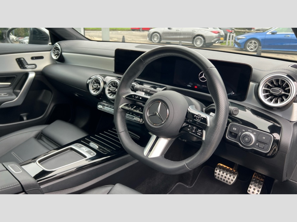 Mercedes-Benz CLA Class CLA 220d AMG Line Premium Plus 5dr Tip Auto 10.25 inch Instrument display with digital cockpit, 10.25 inch touchscreen central media display, Active lane keeping assist, Attention assist - Monitors steering behaviour and long journey fatigue, Bluetooth connection, Car wash mode, Cruise control with limiter, Direct steer system, DYNAMIC SELECT with a choice of driving modes (ECO, Comfort, Sport and Individual), ECO start/stop function, Fingerprint sensor, Fluid level warning indicator for fuel, oil, coolant and washer fluid, Hard-disk navigation, Head up Display, Hey Mercedes Voice activation, Lamp failure indicator, MBUX augmented reality for navigation, Mercedes me connect including emergency call system, accident recovery, breakdown and maintenance management, Mercedes me remote services, Outside temperature gauge, Owners manual in English, Pre-installation of private car share, Radio aerial integrated into front and rear windshields, Service indicator (ASSYST), Smartphone integration with Apple CarPlay and Android auto, Tailgate, Traffic sign assist, Trip computer in multifunction display with current consumption indicator, Wireless charging in the front centre console, Comfort suspension with ride height lowering, Rear axle multi-link, Burmester lettering on the speakers, Burmester surround sound system (710W) with dolby atmos, speakers - 1 central, 1 woofer, 1 tweeter, 1 subwoofer with 60W, 2 in C pillar, DAB digital radio tuner, MBUX multimedia system, Pre installation for Mercedes Benz Link, Adaptive brake lights, AMG body styling with AMG front apron and rear apron and visible exhaust tailpipe in chrome trim elements, Body colour door handles, Electric panoramic sunroof with automatic tilt and convenience closing fuinctions, rain sensor auto closing and electronic roller sunblind, Electric windows, Electrically adjustable and heated door mirrors with integrated LED indicators, Exhaust system with 2 Visible tailpipe trim elements and rear apron with trim in chrome, Hand free access, Headlamp assist automatic headlamp activation, Heated glass rear windscreen + timer control, High level LED third brake light, Integrated LED daytime running lights, Interior mirror with black reading lamps and frameless, LED tail lamp, Multibeam LED headlamps with adaptive highbeam assist plus, Privacy glass with dark tinting on rear side windows and rear window, Radiator grille with Mercedes-Benz pattern in chrome and central Mercedes star, single louvre in high-gloss black with chrome inserts, Rain sensing windscreen wipers with two sensitivity settings, Rear fog lamp, Rear side wing doors, Rear wiper, Variable front intermittent wipers, 3 seat bench in 2nd row, 3 twin spoke flattened multifunction steering wheel in nappa leather - horizontal twin spoke in high gloss black, vertical twin spoke in silver chrome, 40:20:40 split folding rear seat backrests, Air conditioning - Two zone thermotronic luxury automatic climate control with display, Air vents with surround in silver chrome, Automatic child seat recognition sensor, Black roof lining, Brushed stainless steel sports pedals with rubber studs, Electrically adjustable front memory seats including 4 way lumbar support, Floor mats with stitched AMG lettering, Fluorescent jacket, Front centre armrest with stowage, Galvanished gear shift paddles in silver chrome, Illuminated front door sills with Mercedes Benz lettering and changeable cover, Interior lighting - 64 colour Ambient lighting, Luggage net on driver/front passenger seat backrest, Manually height and reach adjustable steering column, Rear armrest with two integral cup holders for drinks, Rear head restraints, Single front passenger seat, Sport seats with fixed head restraints, Stowage compartment in centre console with retractable cover, Sunvisors with illuminated vanity mirrors, Twin front cupholders, Two outer rear seat isofix and top tether child seat fixing points, Keyless go comfort pack - CLA with easy pack tailgate, Light and sight pack - CLA, Mirror pack - CLA, Night package - CLA, Parking pack with 360 degree camera - CLA, Seat comfort pack - CLA, USB package plus - CLA, Winter pack - CLA, Active bonnet pedestrain safety measure which detects an impact and raises bonnet by 65mm, Adaptive brake assist with hold function and hill start assist, Anti lock braking system (ABS) with brake assist, Black seat belts, Bonnet with power domes, Brake calipers with Mercedes-Benz lettering, Brake pad wear warning indicator, Childproof locks manually operated for rear doors and electrically operated for rear power windows, Crash responsive emergency lighting, Driver and front passenger head and sidebags, Driver and front passenger windowbags, Drivers knee airbag, Dual stage driver and front passenger airbags, Electric parking brake, Electronic stability programme with acceleration skid control, ESP curve dynamic assist, Exit warning, Front and rear seatbelt reminder, Front passenger seat occupancy sensor, Perforated front brake discs, Sports braking system, Three point rear seat belts, Tyre pressure monitoring system, Warning triangle and first aid kit, Alarm system with immobiliser and interior protection -Thatcham category 1, Guard 360 deg vehicle protection - tow away protection with visual, acoustic warning, interior monitoring, preinstallation for parking damage, Remote central locking and crash sensor with emergency opening function, Light aluminium with longitudinal grain interior trim, 19" AMG multi-spoke black painted light alloy wheels with high sheen rim finish, Summer tyres, Tirefit tyre sealant kit