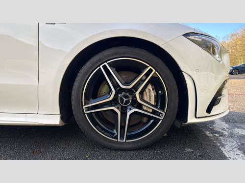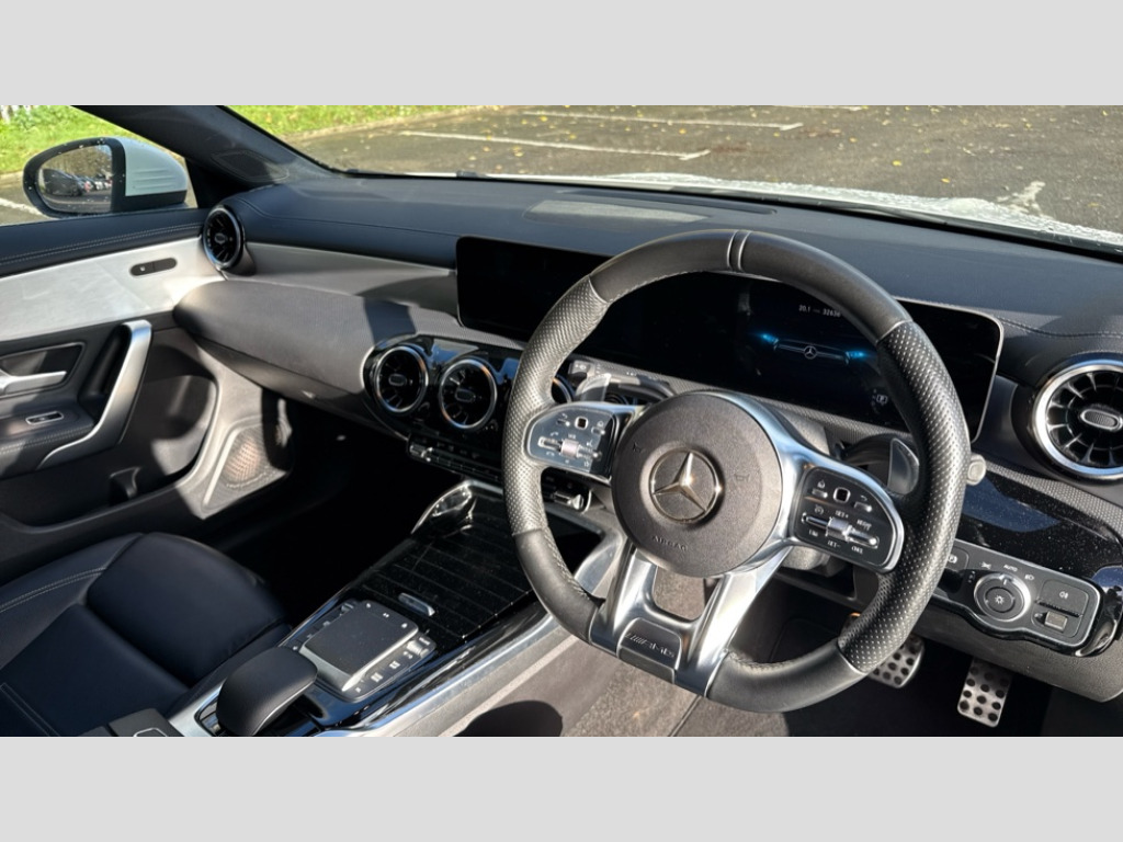 Mercedes-Benz CLA Class CLA 35 4Matic 4dr Tip Auto 10.25 inch touchscreen central media display, 7 inch Instrument display with digital cockpit, Active lane keeping assist, Attention assist - Monitors steering behaviour and long journey fatigue, Bluetooth connection, Car wash mode, Cruise control with limiter, Digital instrument cluster with three AMG display styles and AMG menu, Direct steer system with speed sensitive power steering, DYNAMIC SELECT with driving programs (Slippery, Comfort, Sport, Sport+ and Individual), ECO start/stop function, Fluid level warning indicator for fuel, oil, coolant and washer fluid, Hard-disk navigation, Hey Mercedes Voice activation, Lamp failure indicator, Mercedes me connect including emergency call system, accident recovery, breakdown and maintenance management, Outside temperature gauge, Owners manual and service booklet in English, Pre-installation for Vehicle Monitoring, Pre-installation for Vehicle Setup, Pre-installation of private car share, Preinstallation for Mercedes Benz link, Radio aerial integrated into front and rear windshields, Service indicator (ASSYST), Smartphone integration with Apple CarPlay and Android auto, Speed limit assist, Trip computer in multifunction display with current consumption indicator, Wireless charging, 7G-DCT 7 speed automatic transmission, AMG suspension, Rear axle multi-link, DAB digital radio tuner, MBUX multimedia system with DAB digital radio and touchpad including satellite navigation, Mercedes Benz sound system (100 W) with 6 speakers, USB (type C) ports (2) in stowage compartment and 1 in front of centre console, Adaptive brake lights, AMG body styling with AMG front apron and rear apron and visible exhaust tailpipe in chrome trim elements, AMG bodystyling side skirts, AMG Front apron with flics as air deflector elements on the outer air intakes, AMG radiator grille with twin blade lamella and AMG Lettering, AMG Rear apron with specific diffuser look with four vertical fins and two round chrome plated tailpipe trim elements with a diameter of 90 mm, AMG Sports exhaust system with two round tailpipes measuring 90 mm in diameter attached in rear apron, AMG lettering plus ribbing on the inside of the, Automatically controlled exhaust flap, Body colour bumpers, Body colour door handles, Chrome beltline strips, Chrome weather strip, Electric windows, Electrically adjustable and heated door mirrors with integrated LED indicators, Front splitter and trim elements on the louvres in the outer air inlets in silver chrome, Front wings with TURBO 4MATIC lettering, Headlamp assist automatic headlamp activation, Heated glass rear windscreen + timer control, High level LED third brake light, Interior mirror with black reading lamps and frameless, LED high performance headlamps with integrated LED daytime running lights, LED tail lamp, Privacy glass with dark tinting on rear side windows and rear window, Rain sensing windscreen wipers with two sensitivity settings, Rear fog lamp, Window line trim strip in chrome, 40:20:40 split folding rear seat backrests, Air conditioning - Two zone thermotronic luxury automatic climate control with display, Air vents with surround in silver chrome, AMG Performance steering wheel in nappa leather, Automatic child seat recognition sensor, Black roof lining, Brushed stainless steel sports pedals with rubber studs, Floor mats with stitched AMG lettering, Front centre armrest with stowage, Front door sills with Mercedes Benz lettering, Heated front seats, Illuminated glove compartment stowage, Luggage net on driver/front passenger seat backrest, Manually adjustable front seats, Manually height and reach adjustable steering column, Rear head restraints, Silver coloured aluminium gear shift paddles on steering wheel, Sport seats with fixed head restraints, Stowage compartment in centre console with retractable cover, Sunvisors with illuminated vanity mirrors, Touchpad on center console, Twin front cupholders, Two outer rear seat isofix and top tether child seat fixing points, Light and sight pack - CLA, Mirror pack - CLA, Parking package - CLA, Seat comfort pack - CLA, Active bonnet pedestrain safety measure which detects an impact and raises bonnet by 65mm, Active brake assist includes forward collision warning system with autonomous braking, Adaptive brake assist with hold function and hill start assist, Anti-lock braking system (ABS), Black seat belts, Bonnet with power domes, Brake pad wear warning indicator, Childproof locks manually operated for rear doors and electrically operated for rear power windows, Crash responsive emergency lighting, Driver and front passenger head and sidebags, Driver and front passenger windowbags, Drivers knee airbag, Dual stage driver and front passenger airbags, Electric parking brake, Electronic stability programme with acceleration skid control, ESP curve dynamic assist, Front and rear seatbelt reminder, Front brake calipers with AMG lettering, Front passenger seat occupancy sensor, Perforated front brake discs, Three point rear seat belts, Tyre pressure monitoring system, Warning triangle and first aid kit, Keyless Go starting function, Remote central locking and crash sensor with emergency opening function, Urban guard vehicle protection system with immobiliser and interior protection, Light aluminium with longitudinal grain interior trim, 18" 5 twin spoke bi-colour alloy wheels, Summer tyres, Tirefit tyre sealant kit, Wheel arches wider for AMG wheels