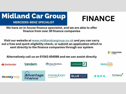 Visit our website to carry out a free and quick finance eligibility check at www.midlandcargroup.co.uk.  We are an AA approved dealer, and registered Mercedes specialist. All of our cars are provided with a 6 month AA warranty with the option to upgrade to 12 months for £199, and 12 months breakdown cover from the AA. Test drives and any inspections are welcome, or if you prefer we are happy to carry out video viewings and arrange delivery. We offer finance from a panel of over 30 companies catering for a wide range of customer profiles and can help with any requirements that you may have. Please visit our website at www.midlandcargroup.co.uk to view all of our stock of up to 75 cars from £4,000 to £40,000 and even apply for finance directly through the website.