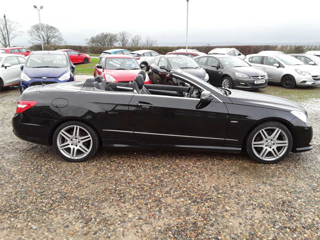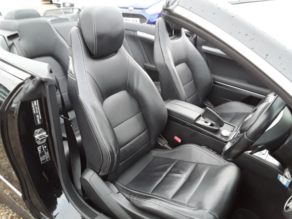 SAPPHIRE BLACK METALLIC WITH BLACK LEATHER SPORTS SEATS. MERCEDES BENZ E250 SPORT 2.2 CDI BLUE EFFICIENCY AUTOMATIC COUPE CONVERTIBLE. WOW WHAT A CAR!!! SUPERB CONDITION INSIDE AND OUT. FULL SERVICE HISTORY, RIGHT UP TO 84,000.LOW MILEAGE OF 85,000 ONLY.GREAT LOOKING CONVERTIBLE. ROOF IN EXCELLENT CONDITION. COMES WITH 12 MONTHS M.O.T.AND A FRESH WINTER SERVICE. 2 KEYS.REALLY NICE TO DRIVE.GREAT SPEC:- SATELLITE NAVIGATION, FULL LEATHER SPORTS SEATS, PARKING SENSORS, ELECTRIC SEATS AND LUMBER SUPPORT,ELECTRIC ROOF,ELECTRIC FOLDING MIRRORS, CRUISE CONTROL, BLUETOOTH, HEATED SEATS. 1ST TO SEE WILL BUY.