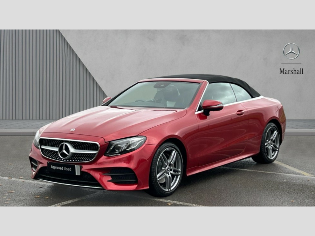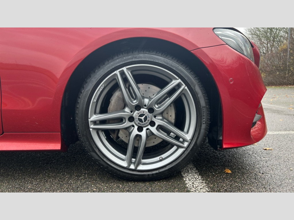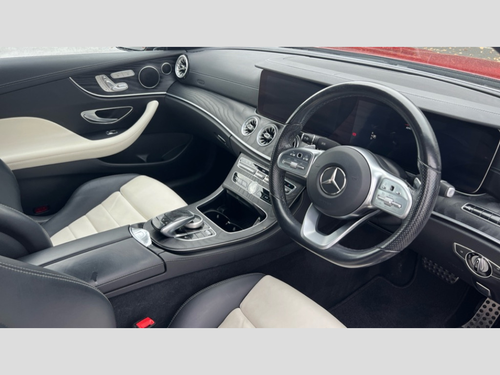 Mercedes-Benz E Class E220d AMG Line 2dr 9G-Tronic Active parking assist including front and rear parking sensors, Analogue clock, Attention assist, Automatic boot separator, Blind spot assist, Bluetooth interface for hands free telephone, Brake wear warning display, Cockpit display 12.3" widescreen digital instrument cluster, Collision prevention assist plus, Direct steer speed sensitive steering, Direct steering, DYNAMIC SELECT with a choice of driving modes (ECO, Comfort, Sport, Sport+ and Individual), ECO start/stop function, Engine start/stop button, High resolution 12.3" multimedia colour display, Mercedes connect me, Multi function trip computer, Outside temperature display, Remote boot release, Reversing camera, SD card based satellite navigation system, Service indicator (ASSYST), Status display for rear seat belts in instrument cluster, Touchpad with control wheel, 66 litre fuel tank, 8.5 litre AdBlue tank, Agility control sports suspension with selective damping system, Diesel particulate filter, Incorrect fuelling protection, 2 USB ports in centre console, Audio 20 with USB, touchpad and control wheel with Media Interface with Bluetooth interface and hands-free function, DAB Digital radio, Acoustic soft-top with enhanced climate and noise comfort, Adaptive brake lights, AIRCAP wind deflector and draught stop, AMG bodystyling front and rear aprons, side skirts, AMG boot lid spoiler in body colour, AMG front, rear apron and side skirts, Body colour door handles, Body coloured bumpers, Electric windows with one touch opening/closing and obstruction sensors, Exterior mirrors heated and electronically adjustable, Illuminated front door sill panels with Mercedes-Benz lettering, LED high performance headlamps with integrated LED daytime running lights, Magic Vision Control heated windscreen wiper system, Rain sensing windscreen wipers, Rear LED lights, Top surround of side windows in polished aluminium, Visible twin pipe exhaust system integrated into bumper, Waistline in polished aluminium, 3-spoke flat bottom multifunction AMG steering wheel with Touch Control buttons, trimmed in black nappa leather, 4 way adjustable front head restraints and 2 way rear head restraints, 50/50 split folding rear seat, Airscarf - neck level heating, Artico man-made leather upper dashboard and beltlines with contrast stitching, Automatic child seat recognition sensor, Automatic two zone climate control, Bag hook in luggage compartment, Belt feeder driver and front passenger seat belt automatically positioned within easier reach, Black roof lining, Central stowage compartment with 12 V socket in centre console, Centre armrest and door handle illumination, Chrome door pins, Easy entry seats, Floor mats with AMG lettering, Front and rear door pockets, Front centre armrest with stowage compartment, Front footwell lights, Glasses compartment in overhead control panel, Glove compartment - lockable, air conditioned and illuminated, Heated front seats, Interior lighting - 64 colour Ambient lighting, Interior rear light/integral reading lights, Isofix rear child seat fastenings, Multi contour front sports seats, Multi function steering wheel, Partial electric front seats/backrest/height adjust, Rear centre armrest with 2 cupholders + storage, Seat occupancy sensor for front passenger seat, Sports pedals in brushed stainless steel with black rubber studs, Steering column manually adjustable for height and reach, Steering wheel gearshift paddles, Steering wheel touch control buttons for audio and onboard settings, Storage net in luggage compartment, Sunvisors with illuminated vanity mirrors, Twin front cupholders, Mirror pack - E Class, Seat comfort pack - E Class, Stowage pack - E Class, Active bonnet, Active brake assist, Adaptive brake system, Adaptive driver and front passenger airbags, Anti-lock braking system (ABS), Crash sensor (auto door unlocking), Drivers knee airbag, Electric parking brake, Electronic Stability Programme, Front and rear window airbags, Front seatbelt pretensioners, Front side airbags, Head airbags, Hill hold function, Perforated front brake discs with "Mercedes-Benz" lettering, Seatbelt warning, Three point rear seat belts, Tyre pressure monitoring system, Warning triangle and first aid kit, Alarm system/interior protection/immobiliser, Central locking with interior switch, automatic locking and crash sensor with emergency opening function, Chrome surround in electric key, Keyless entry go starting function, Black open pore ash wood, Open pore black ash wood centre console, Run flat tyres