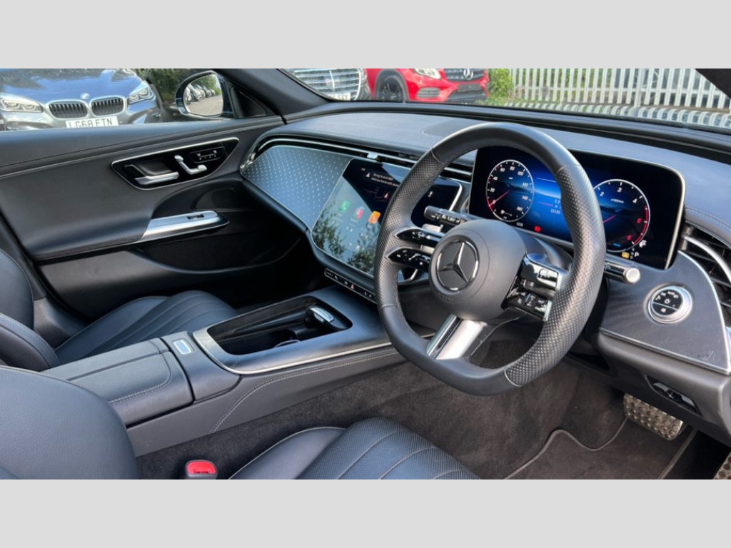 Mercedes-Benz E Class E220d AMG Line Advanced 5dr 9G-Tronic 12.3" Driver display screen, 14.4" central media display, 5G Communications module, Attention assist, Augmented reality navigation, Blind spot assist, Brake wear warning display, Direct steer speed sensitive steering, Easy-pack tailgate - Powered opening/closing automatically, ECO start/stop function, Emergency call assistance, Evasive manoeuvre support, Fluorescent jacket for driver, Hard disc navigation, Head up Display, MBUX navigation premium, MBUX voice control, Mercedes connect me, Outside temperature display, Preinstallation for live traffic, Remote Services Premium, Service indicator (ASSYST), Status display for rear seat belts in instrument cluster, Trip computer in multifunction display showing current fuel consumption, Wireless charging, Wireless smartphone integration with Apple CarPlay and Android auto, 48V Mild hybrid technology, 66 litre fuel tank, 9G TRONIC automatic transmission, Agility control suspension with selective damping and lowering, Bluetec emission control, Diesel particulate filter, Integrated starter generator Gen 2, Rear air suspension with level control, Sporty engine sound system, 2 USB ports in centre console, 2 USB ports in the rear, DAB Digital radio, Preinstallation for MBUX Entertainment Plus, 3rd brake light, Adaptive brake lights, Aerial integrated in rear window, AMG bodystyling, Auto dimming driver's door mirror, Auto dimming rear view mirror, Black radiator grille, Chrome roof rails, Digital air vent control, Electric folding door mirrors, Electric windows with one touch opening/closing and obstruction sensors, Electrically adjustable and heated door mirrors, Heat insulating privacy glass, LED daytime running lights, LED digital light with adaptive highbeam assist plus, Pre-installation for roof rail systems, Rear side wing doors, Rear wiper, Surround lighting with logo projection, 3 seat bench in 2nd row, 4 way lumbar support, Ambient lighting, AMG brushed stainless steel sports pedals with rubber studs, AMG floor mats, AMG line interior, Automatic child seat recognition sensor, Central stowage compartment with USB socket for use with Android Auto and Apple CarPlay, Comfort seats, Courtesy lights in rear grab handles with reading light functionality, Folding rear seat backrest, Front centre armrest with stowage compartment, Glove compartment - lockable, air conditioned and illuminated, Head restraints for driver and front passenger (four-way adjustability) and in rear (two-way), Heated front seats, Illuminated door sills, Multifunction sports steering wheel in nappa leather, Roof liner in black fabric, Seat occupancy sensor for front passenger seat, Single front passenger seat, Steering wheel touch control buttons for audio and onboard settings, Sunvisors with illuminated vanity mirrors, Thermotronic 4 zone climate control, Leather package - E Class, Memory package - E Class, Parking package with 360 degree camera - E Class, USB plus package - E Class, 3x3 point rear seatbelts, Active bonnet pedestrian safety measure which detects an impact and raises bonnet, Adaptive brake system with HOLD function and brake drying in the wet, Airbags - sidebag for driver and front passenger with combined thorax/pelvis bag, Anti-lock braking system (ABS), Automatic front passenger airbag deactivation, Central airbag, Childproof locks manually operated for rear doors and electrically operated for rear power windows, Driver and adaptive front passenger airbags, Electronic parking brake, Electronic Stability Programme, Hill start assist, ISOFIX child seat attachment points two outer rear seats, Knee airbags, Pedestrian protection, Pre-Safe anticipatory safety system, Tyre pressure monitoring system, Warning triangle and first aid kit, Window airbags, Alarm system with interior monitoring, Central locking with interior switch, automatic locking and crash sensor with emergency opening function, Dashcam, Digital vehicle key, Guard 360 degree vehicle protection plus, Increased anti theft protection, Keyless Go, Urban guard vehicle protection plus, Centre console trim in open pore black ash wood, Dash trim in open pore black ash backlit wood with laser cut Mercedes Benz star pattern, 19" AMG 5 twin spoke alloy wheels, Summer tyres, Tirefit
