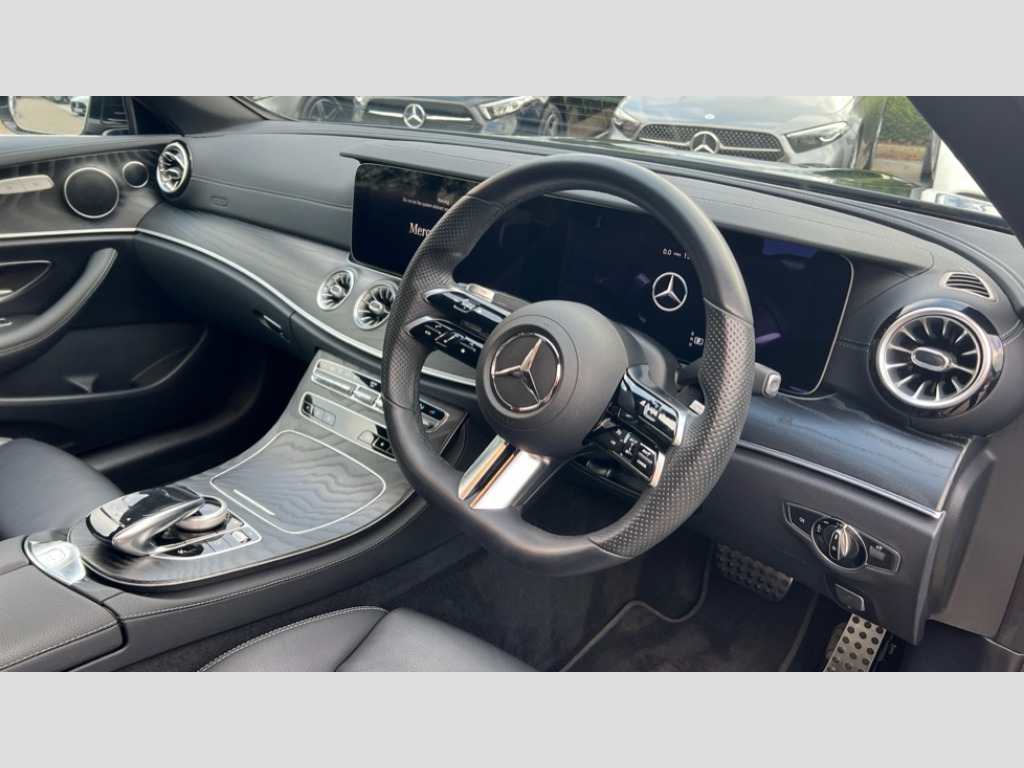 Mercedes-Benz E Class E220d AMG Line Premium 2dr 9G-Tronic 360 degree parking camera, Active parking assist including front and rear parking sensors, Analogue clock, Attention assist, Automatic boot separator, Blind spot assist, Brake wear warning display, Cockpit display 12.3" widescreen digital instrument cluster, Collision prevention assist plus, Cruise control with variable speed limiter, Direct steer speed sensitive steering, DYNAMIC SELECT with a choice of driving modes (ECO, Comfort, Sport, Sport+ and Individual), E-call, ECO start/stop function, High resolution 12.3" multimedia colour display, MBUX voice control activated by keywords "Hey Mercedes", Mercedes connect me, Outside temperature display, Pre-installation for Vehicle Monitoring, Pre-installation for Vehicle Setup, Remote boot release, Service indicator (ASSYST), Status display for rear seat belts in instrument cluster, Touchpad with controller, Traffic sign assist, Trip computer in multifunction display showing current fuel consumption, Wireless charging, 14 litre AdBlue tank, 66 litre fuel tank, 9G TRONIC 9 speed automatic transmission, Agility control sports suspension with selective damping system, Diesel particulate filter, Incorrect fuelling protection, 2 USB ports in centre console, 2 USB ports in the rear, MBUX multimedia system with DAB digital radio and touchpad including satellite navigation, Smartphone integration via Android Auto/Apple CarPlay, Media Interface, USB and Bluetooth interface and touchpad with control wheel, Acoustic soft-top with enhanced climate and noise comfort, Adaptive brake lights, Adaptive high beam assist, AIRCAP wind deflector and draught stop, AMG bodystyling front and rear aprons in polished aluminium, Body colour door handles, Body coloured bumpers, Electric windows with one touch opening/closing and obstruction sensors, Exterior mirrors heated and electronically adjustable, Illuminated front door sill panels with Mercedes-Benz lettering, LED 3rd brake light, LED daytime running lights, LED high performance headlamps, Magic Vision Control heated windscreen wiper system, Radiator grille with integral star and 2 louvres in matt iridium silver with chrome trim, Radio aerial integrated into rear window, Rain sensing windscreen wipers, Rear boot, Rear LED lights, Top surround of side windows in polished aluminium, Visible twin pipe exhaust system integrated into bumper, Waistline in polished aluminium, 2 seat bench in 2nd row, 3-spoke flat bottom multifunction AMG steering wheel with Touch Control buttons, trimmed in black nappa leather, 50/50 split folding rear seat, Airscarf - neck level heating, Artico man-made leather upper dashboard and beltlines with contrast stitching, Automatic child seat recognition sensor, Belt feeder driver and front passenger seat belt automatically positioned within easier reach, Black door pins, Black roof lining, Central stowage compartment with 12 V socket in centre console, Central stowage compartment with USB socket for use with Android Auto and Apple CarPlay, Centre armrest and door handle illumination, Centre console in black open-pore ash wood, Floor mats with AMG lettering, Front and rear door pockets, Front centre armrest with stowage compartment, Front footwell lights, Glasses compartment in overhead control panel, Glove compartment - lockable, air conditioned and illuminated, Head restraints for driver and front passenger (four-way adjustability) and in rear (two-way), Heated front seats with partial electric adjustment and electro-pneumatic four-way lumbar support, Interior lighting - 64 colour Ambient lighting, Interior rear light/integral reading lights, Isofix rear child seat fastenings, Multi contour front sports seats, Seat occupancy sensor for front passenger seat, Single front passenger seat, Sports pedals in brushed stainless steel with black rubber studs, Steering column manually adjustable for height and reach, Steering wheel gearshift paddles, Sunvisors with illuminated vanity mirrors, THERMOTRONIC automatic climate control system with 3 climate zones, Mirror pack - E Class, Seat comfort pack - E Class, Stowage pack - E Class, 2 x 3-point rear seatbelts, Active bonnet pedestrian safety measure which detects an impact and raises bonnet, Active brake assist, Adaptive brake system with HOLD function and brake drying in the wet, Adaptive driver and front passenger airbags, Airbags - sidebag for driver and front passenger with combined thorax/pelvis bag, Anti-lock braking system (ABS), Drivers knee airbag, Electric parking brake, Electronic Stability Programme, Front and rear window airbags, Head airbags, Hill hold function, Perforated front brake discs with "Mercedes-Benz" lettering, Pre-Safe anticipatory safety system, Seatbelt warning, Tyre pressure monitoring system, Warning triangle and first aid kit, Alarm system/interior protection/immobiliser, Central locking with interior switch, automatic locking and crash sensor with emergency opening function, Chrome surround in electric key, Keyless Go entry and starting function, Open-pore black ash wood trim, 19" AMG 5 twin spoke alloy wheels in tantalite grey with high sheen finish (RZI), Summer tyres, TIREFIT with tyre inflation compressor