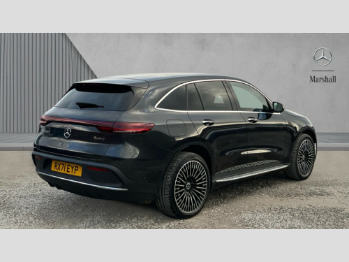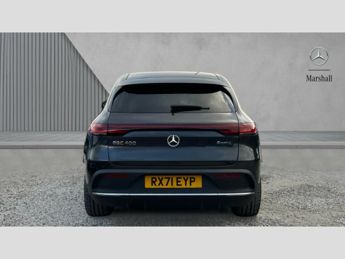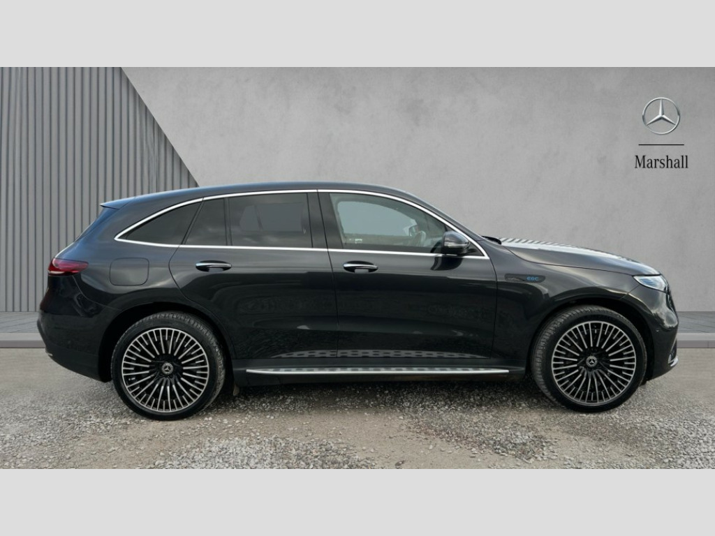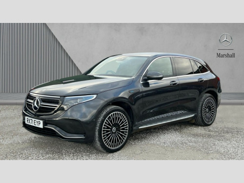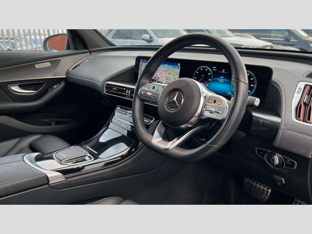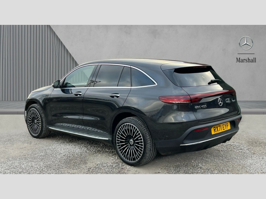 Mercedes-Benz Eqc EQC 400 300kW AMG Line Premium 80kWh 5dr Auto Acoustic ambient protection, DYNAMIC SELECT with a choice of driving modes (max range, ECO, comfort and sport), Easy-pack tailgate, Electronic Power Steering (EPS), EQ navigation services - map (range display), display charging stations, programming of charging settings and pre entry climate control, Hard-disk navigation, Mercedes Benz emergency call system, Mercedes me connect, Smartphone integration, Traffic sign assist, 11KW onboard charger, 4MATIC all wheel drive, Charging cable for wall box and public charging station - Type 2(mode 3) 5m, Charging system - AC charging system rated at 7.4kW and 110kW DC charging system, Combined charging system CCS-2 connector, Comfort suspension with self levelling rear air suspension, DAB Digital radio, MBUX multimedia system with 10.25" instrument and 10.25" media display with touchscreen, Aluminium running boards, AMG specific black panel radiator grille with twin blade design and high gloss black surround, AMG specific front apron with jet wing design, visible air intakes with chrome trim parts and high gloss black inserts and air curtains, AMG specific rear apron with visible air outlets, black diffuser insert and chrome trim elements, Badge on the wing in high gloss black with chrome stripes and blue EQC lettering, Electric sliding sunroof, Front and rear LED light band, Heat and noise insulating acoustic glass, High gloss black exterior mirror housing, Multibeam LED headlights with inner housing and high gloss black tubes/blue stripes, adaptive highbeam assist +, cornering and cross traffic functions, Privacy glass, 12V Accessory socket in the load area, 3 spoke AMG multifunction sports steering wheel in nappa leather with chrome control panels and flattened bottom section with perforated grip area, 40:20:40 split folding rear seats, AMG brushed stainless steel sports pedals with aluminium rubber studs, AMG floor mats, AMG sports seats, Black fabric roof liner, Charging socket, Dashboard in ARTICO man-made leather with metallised look finish and rose gold piping, Front and rear head restraints, Heated front seats, Interior lighting - 64 colour Ambient lighting, Leather upholstery, Air balance package - EQC, Energizing package - EQC, Interior light package - EQC, Keyless go comfort package - EQC, Mirror package with heated door mirror - EQC, Parking package with active park assist with reversing camera - EQC, Seat comfort pack - EQC, Stowage package - EQC, 3 rear seatbelts, 6 airbags - Driver, front passenger, curtain and side airbags, ABS, Radar-based recuperation, Urban guard vehicle protection, Anthracite carbon fibre look trim with high gloss centre console, 21" AMG mutli spoke alloy wheels painted black with high sheen finish, Summer tyres, Tirefit