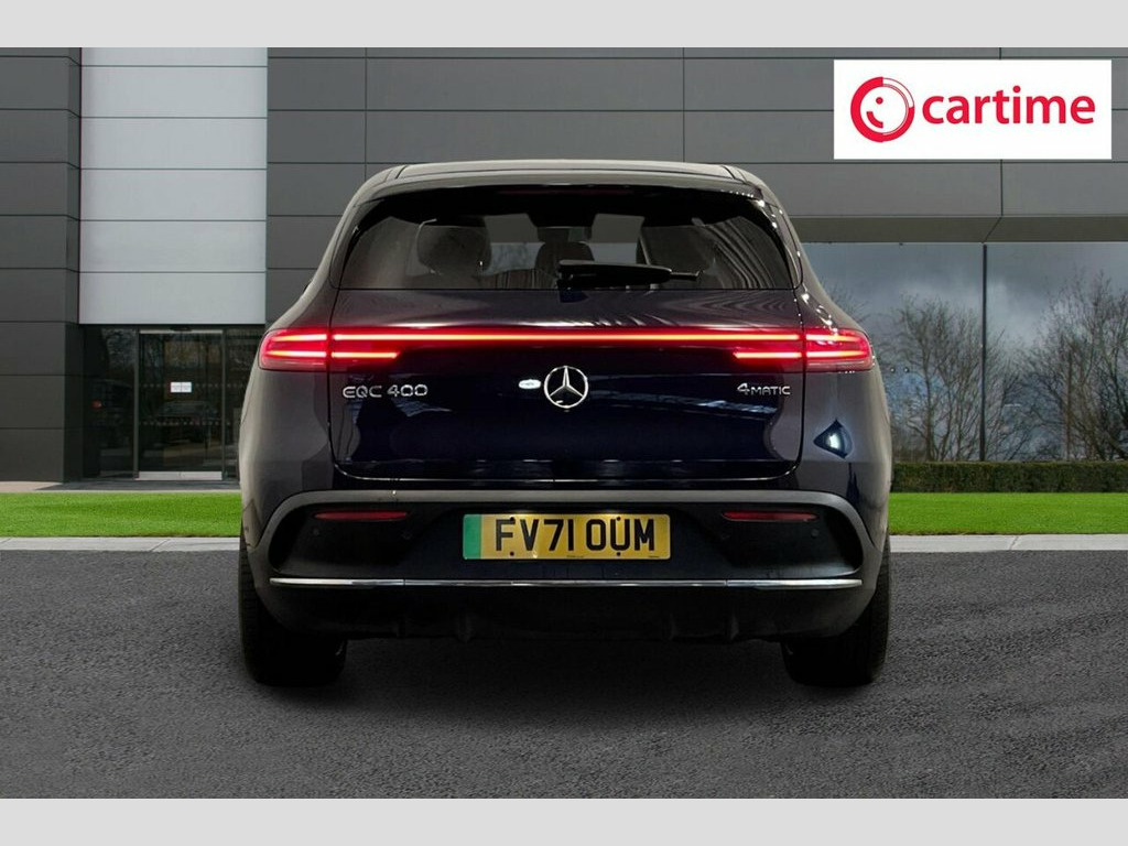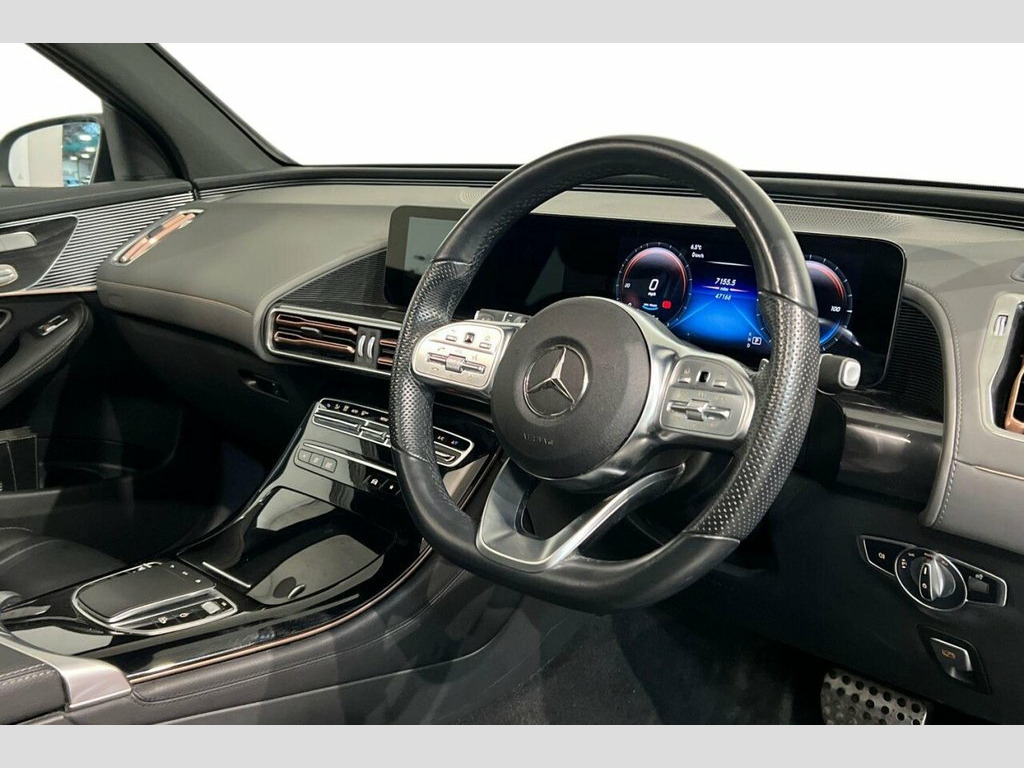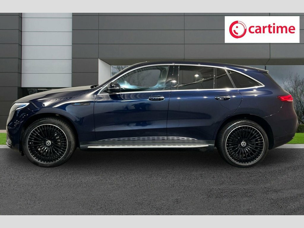 This 2021 Mercedes-Benz EQC 400 AMG Line (Premium Plus) has had only one owner and boasts a clear vehicle history check, ensuring peace of mind. As an electric four wheel drive vehicle, it offers an impressive 88 kWh battery with a maximum range of 244 miles when new. Charging is convenient, taking approximately 12 hours and 13 minutes at home with a 7kW charger, or a rapid 45 minutes from empty to 80% at a public charging station. The MOT is valid until November 2026. The EQC 400 AMG Line (Premium Plus) is equipped with a range of advanced features designed to enhance your driving experience. These include MULTIBEAM LED Headlights for superior visibility, an Electric Sliding Sunroof to brighten the cabin, and the KEYLESS-GO Comfort Package for effortless entry and starting. Safety is paramount with Blind Spot Assist and a comprehensive Parking Package featuring Parking Assist PARKTRONIC and a 360 Camera, making manoeuvring simple. The large boot space provides ample room for luggage or shopping. Performance is also a key highlight, with the EQC accelerating from 0-60mph in a swift 5.1 seconds, demonstrating its dynamic capability compared to other vehicles in its class. 110kW DC On-board Charger, 11kW On-Board Charger, 12V Socket in Load Area, 21in Alloy Wheels - AMG Multi-Spoke Desi, ABS - Anti-Lock Braking System, Active Brake Assist, Active Lane Departure Warning, Airbags - Driver and Front Passenger, Aluminium - Running Boards, Ambient Lighting, AMG Brushed Stainless Steel Sports Pedal, AMG-Specifc Rear Apron with Visible Air , AMG-Specific Black Panel Radiator Grille, AMG-Specific Front Apron in a Jet-Wing D, Badge on the Wing in High-Gloss Black wi, Blind Spot Assist, Cavansite Blue, CCS-2 Connector - Combined Charging Syst, Charging Cable for Wallbox and Public Ch, Cruise Control, Dashboard in ARTICO, Digital Radio, Door Mirrors - High Gloss Black, D