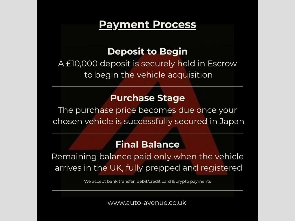 We offer a full sourcing service for the 2019-2022 Mercedes-Benz G Class G350d AMG Line Premium, securing the exact colour, interior, mileage and specification you require. Through our trusted network, we source clean, accident-free examples and manage the entire process from purchase to UK registration. All costs — overseas purchase, export, shipping, duty/VAT, UK compliance, detailing and inspection — are included in your quoted sourcing price with no hidden fees. Payment Process:, • £10,000 deposit held in Escrow to begin sourcing, • Full purchase price due once your chosen G400d is bought in Japan, • Final payment only when the car is prepped, registered and ready in the UK, • Payment available via bank transfer or Escrow, Lead Times:, • 2–3 weeks to locate and secure the desired spec, • 1–2 weeks to load for transport, • 40–50 days shipping to the UK, • ~3 weeks for DVLA registration & compliance, Total: approx. 10–14 weeks, Our Sourcing Procedure:, • Detailed spec matching (AMG Line, Premium, colour, wheels, interior), • Verified vehicles only — VIN checks, inspection reports, service history, • Secure overseas purchase & controlled logistics, • All customs, NOVA and duty/VAT handled on your behalf, • UK compliance checks & IVA where required, • Full 117-point inspection, diagnostic scan & professional detailing, • Free nationwide delivery or collection included, Warranty:, Every sourced G-Class qualifies for up to 3 years third-party warranty. Contact Auto Avenue Birmingham to begin your order and secure your 2019-2022 Mercedes-Benz G Class G350d AMG Line Premium.