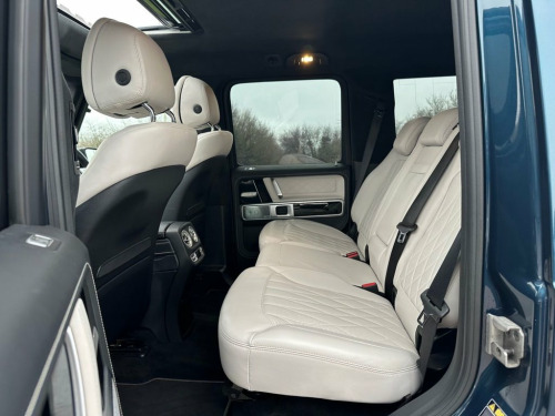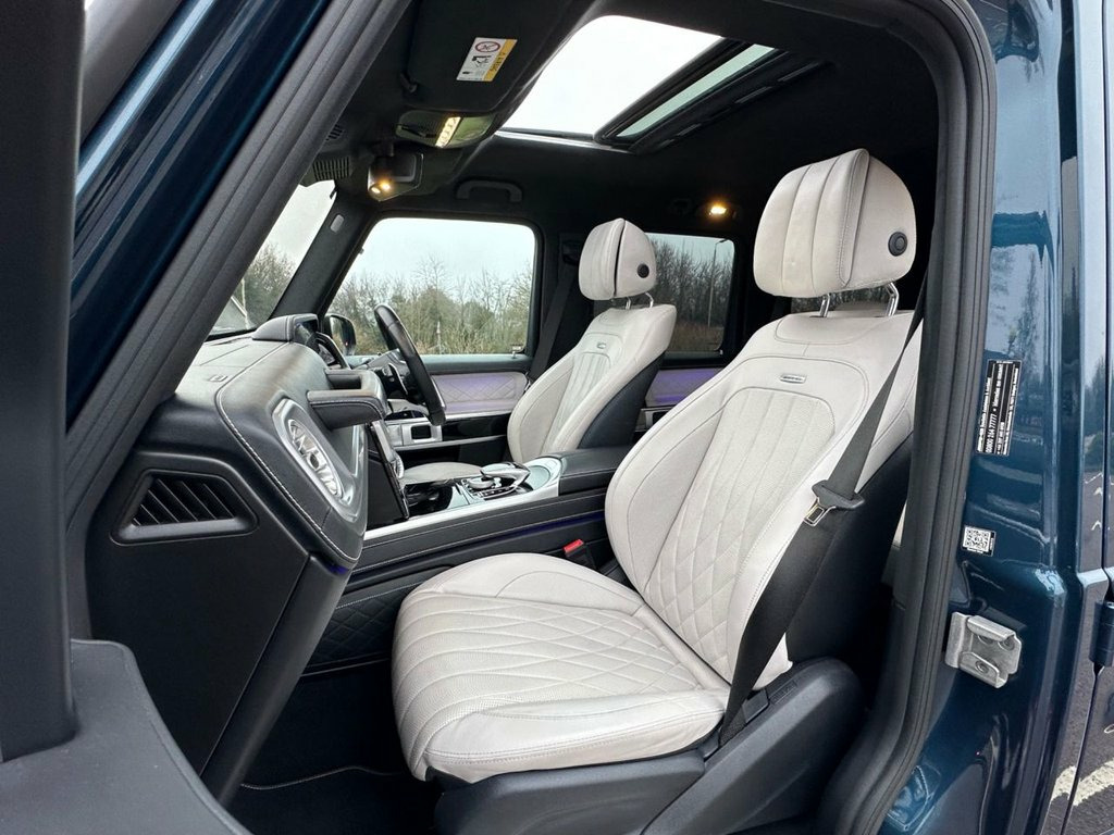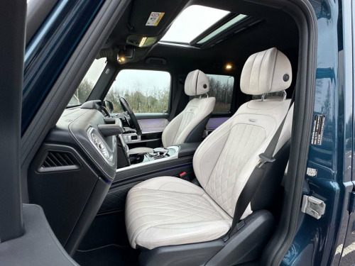 Proud to present this stunning Mercedes-Benz G63 AMG. Mercedes Dealer Warranty till June 2027, Finished in metallic 'Sea Blue' with Platinum White Nappa Leather Interior & added Black Pack. MANUFAKTUR nappa leather, Genuine mileage of 29,000 miles, 360° camera (360° viewing system, Surround View), Key features on this car include, Driving Assistance Package, Burmester 3D Surround Sound System, Electric Glass Sunroof, AMG Performance Steering Wheel, Blind Spot Monitoring, COMAND Online Satellite Navigation, Smartphone integration Carplay, Heated Steering Wheel, Ambient Lighting, Active Distance Distronic, Parking Package. Powered by a robust 4.0-litre petrol engine, this G63 V8 BiTurbo AMG delivers an impressive 577 bhp. ULEZ Compliant. Viewings Strictly by Appointment Only. Video available on advert.