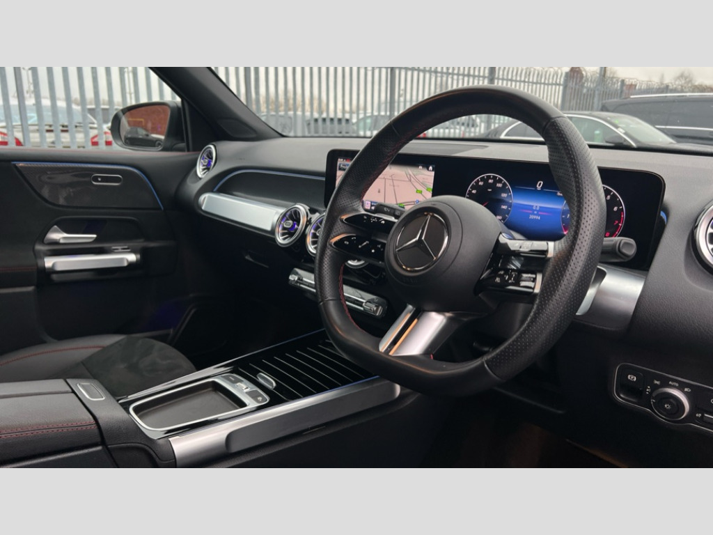Mercedes-Benz Glb GLB 200 AMG Line Executive 5dr 7G-Tronic 10.25 inch touchscreen central media display, 10.25" Digital instrument cluster display screen, Attention assist - Monitors steering behaviour and long journey fatigue, Blind spot assist, Bluetooth connection, Brake pad wear indicator warning light, Car wash mode, Direct steering, DYNAMIC SELECT with a choice of driving modes (ECO, Comfort, Sport and Individual), ECO start/stop function, Exit warning function, Fingerprint scanner, Fluid level warning indicator for fuel, oil, coolant and washer fluid, Hard disk navigation, Hey Mercedes Voice activation, Lamp failure indicator, Lane keep assist, MBUX navigation premium, Mercedes me connect including emergency call system, accident recovery, breakdown and maintenance management, Mercedes me remote services, Outside temperature gauge, Owners manual and service booklet in English, Pre-installation of private car share, Preinstallation for parking damage notification, Radio aerial integrated into front and rear windshields, Service indicator (ASSYST), Smartphone integration with Apple CarPlay and Android auto, Speed limit assist, Tailgate, Trip computer in multifunction display with current consumption indicator, Wireless charging, Comfort suspension with ride height lowering, Rear axle multi-link, DAB digital radio tuner, MBUX multimedia system, Mercedes Benz sound system (100 W) with 6 speakers, Pre installation for Mercedes Benz Link, Adaptive brake lights, Adaptive high beam assist, AMG front apron with front splitter in the colour of the vehicle with chrome trim element, AMG rear apron with visible tailpipe trim and chrome trim element, AMG specific/dual flow exhaust pipes in chrome (non-functional), Beltline trim and window line trim strip in high gloss aluminium, Black grained side sill trim with chrome inlay, Body coloured door handles, Electric adjustable and heated door mirrors with integrated LED side indicators, Front and rear electric windows, Headlamp assist automatic headlamp activation, Heat insulating dark tinted glass for rear side windows and rear window, Heated glass rear windscreen + timer control, High level LED third brake light, Interior mirror with black reading lamps and frameless, LED high performance headlamps with integrated LED daytime running lights, LED tail lamp, Polished aluminium roof rails, Radiator grille as a diamond grille with chrome pins and central Mercedes star, Rain sensor windscreen wipers with two sensitivity stages, Rear fog lamp, Rear side wing doors, Rear wiper, Single louvre in matt grey with chrome inserts and black highlights, Two visible tailpipe trim elements exhaust, Wheel arch liners in the colour of the vehicle, 3 seat bench in 2nd row, 3 twin spoke flattened multifunction steering wheel in nappa leather - horizontal twin spoke in high gloss black, vertical twin spoke in silver chrome, 4 way adjustable lumbar support, 40:20:40 split folding rear seats, Air vents with silver chrome surrounds, AMG floor mats, AMG sports pedals with brushed stainless steel surfaces and black rubber studs, Artico man-made leather/Microcut microfibre upholstery, Automatic child seat recognition sensor, Black roof lining, Fluorescent jacket, Front and rear headrests, Front centre armrest with stowage, Galvanised steering wheel gearshift paddles in silver chrome, Heated front seats, Height adjustable head restraints, Height/reach adjustable steering column, Interior lighting - 64 colour Ambient lighting, Luggage net on driver/front passenger seat backrest, Single front passenger seat, Sports seats, Stowage compartment in centre console with retractable cover and double cupholder and 12 V socket, Sun visors with illuminated vanity mirrors, THERMATIC automatic climate control, Third row of seats for two people on rear seat, Twin front cup holders, Two outer rear seat isofix and top tether child seat fixing points, Easy pack tailgate, Interior lighting with light and sight pack - GLB, KEYLESS-GO Comfort package - GLB, Mirror package - GLB, Parking Package with reversing camera - GLB, Seat comfort package - GLB, USB package plus - GLB, 3 rear 3 point seatbelts, Active bonnet pedestrain safety measure which detects an impact and raises bonnet by 65mm, Active brake assist includes forward collision warning system with autonomous braking, Adaptive brake assist with hold function and hill start assist, Airbags - kneebag for driver, Anti-lock braking system (ABS) with brake assist, Black seatbelts, Bonnet with power domes, Childproof locks manually operated for rear doors and electrically operated for rear power windows, Crash responsive emergency lighting, Curve dynamic assist, Driver and front passenger head and sidebags, Driver and front passenger windowbags, Dual stage driver and front passenger airbags, Electric parking brake, Electronic stability programme with acceleration skid control, Front and rear seatbelt reminder, Front brake callipers with Mercedes Benz lettering, Front passenger seat occupancy sensor, Perforated front brake discs, Tyre pressure monitoring system, Warning triangle and first aid kit, Guard 360 degree vehicle protection - Anti theft alarm system, tow away protection with visual, acoustic warning and alarm, Interior monitoring system, KEYLESS-GO starting function, Remote central locking and crash sensor with emergency opening function, Thatcham category 1 alarm system with immobiliser and interior protection, Carbon structure trim, 19" AMG 5 twin spoke light alloy wheels aerodynamically optimised,painted in high-gloss black and with a high-sheen finish RTG, Summer tyres, Tirefit tyre sealant kit