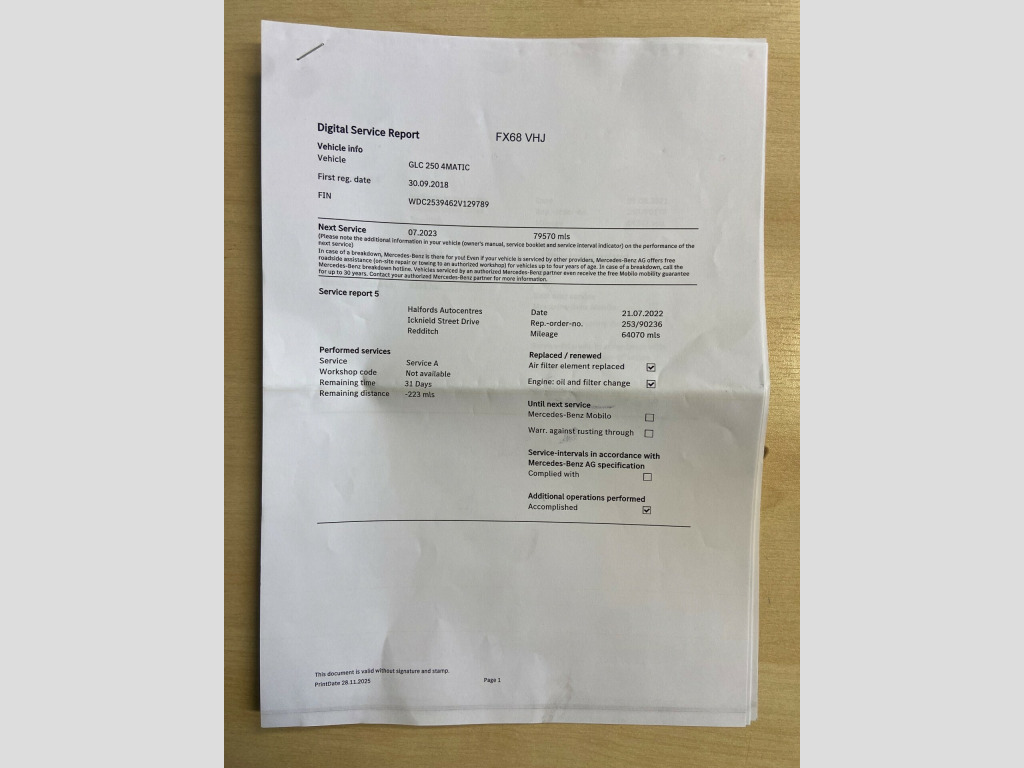 This 2018 Mercedes-Benz GLC 2.0 GLC250 AMG Line (Premium) SUV with just 83203 miles on the clock is a sleek and stylish option for those in the market for a powerful petrol vehicle. With MOT valid until 29/08/2026 and ULEZ compliant, it's ready to hit the road with its 5 seats and 5 doors offering ample space for passengers. The 19in Alloy Wheels, AMG Bodystyling, and Chrome Trim give it a sporty and elegant look, while the Electrically Adjustable and Heated Door Mirrors add convenience. This SUV boasts a G-Tronic+ 4MATIC Euro 6 (s/s) (211 ps) engine that promises a thrilling driving experience. With its impressive features and top-notch performance, this Mercedes-Benz GLC is a top choice for those seeking a sophisticated and powerful SUV.Please ask about our incredible offers on our warranties. in alloy wheels - amg 5-twin-spoke design - painted in titanium grey, amg bodystyling - front and rear apron - side skirts, brake calipers with mercedes-benz lettering, chrome trim - front - side and rear, door mirrors - electrically adjustable and heated, electric windows - 4 - with one-touch opening and closing - including obstruction sensors, mirror package, privacy glass - dark glass from b-pillar backwards, radiator grille with integrated star - two chrome-trimmed louvres, roof rails - aluminium finish, tirefit tyre-sealant kit, tinted glass all round - single-layer safety glass, visible tailpipe exhaust trim integrated into rear bumper, abs - anti-lock braking system, active bonnet - pedestrian safety measure which detects an impact and raises bonnet, adaptive brake lights, adaptive brake system with hold function and brake drying in the wet, alarm system with immobiliser and interior protection, automatic child seat recognition sensor, collision prevention assist plus, dual-stage airbags - driver and front passenger - driver kneebag and windowbags for driver - front passenger and rear passengers, electric parking brake, electronic stability programme-esp with curve dynamic assist and crosswind assist, isofix child seat attachment points with top tether in rear - two outer seats, attention assist, active parking assist including parktronic, direct-steer speed sensitive steering, dynamic select with a choice of driving modes - comfort - eco - sport - sport plus - individual, fuel tank with increased capacity - 66-litres, outside temperature display - rear seat belt status indicator, reversing camera, service indicator assyst, sports suspension tuned for improved handling and driving dynamics, tyre pressure monitoring system, audio 20 cd, dab digital radio tuner, garmin map pilot navigation system with live traffic information, high-resolution 7in multimedia colour display, instrument cluster with 5.5in tft multifunction display, mercedes connect me - standard services, mercedes me connect - remote online, pre-wiring for garmin map pilot navigation system, speakers with frontbass x5, two usb ports in centre console, easy-pack load compartment cover - removable, easy-pack powered tailgate, floor mats - amg with edging and embroidered amg lettering, front door sill panels with mercedes-benz lettering, glove compartment illuminated and lockable, instrument cluster with two tube-design round dials, interior lighting package, keyless-go starting function, premium package, rain sensing windscreen wipers, remote boot release, seat belts - black, seats - front electrically adjustable, seats - heated front, sports pedals in brushed stainless steel with rubber studs, steering column - manually adjustable for height and reach, steering column gear selector - direct select steering wheel gearshift paddles - speedtronic cruise control with variable speed limiter, steering wheel - 3-spoke multi-function amg in black leather with flattened bottom section and chrome inserts and perforated leather in grip area, stowage - dividing net for luggage compartment partitioning and occupant protection, stowage - double cup holder in centre console, stowage - front armrest, stowage package, sun visors with illuminated vanity mirrors, thermatic - automatic climate control, trim - black ash wood look, headlamp assist - automatic headlamp activation, headlamps - led high performance with integrated led daytime running lights, led tail lights