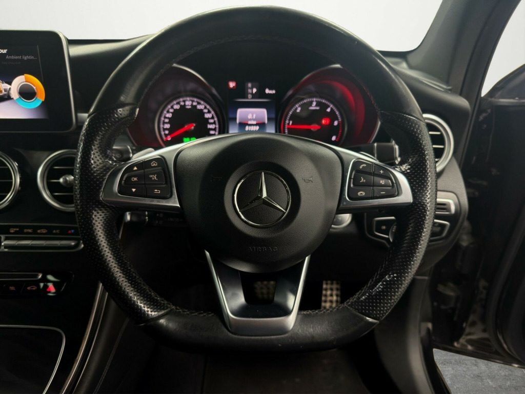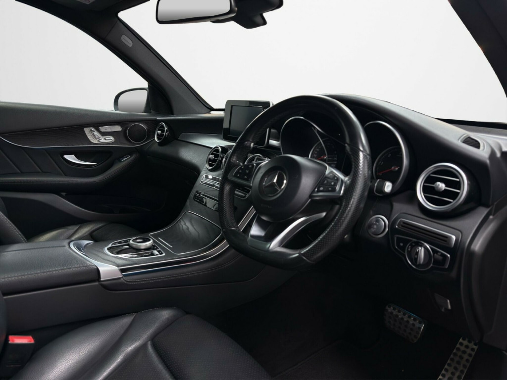 ****KP18ZHA****Boasting exceptionally low mileage for its age, this 2018 Mercedes Benz GLC220d AMG Line (Premium) presents a superb ownership proposition with a clear vehicle history check. This four wheel drive diesel SUV, powered by a 2.1 litre Euro 6 compliant engine, offers a substantial towing weight of 2500 kg. Inside, you'll find luxurious Black leather upholstery, complemented by the Premium Package which includes convenient keyless entry, an opening panoramic sunroof, and memory seats for personalised comfort. The AMG Line trim ensures a sporty aesthetic, while the LED High Performance headlamps with integrated daytime running lights, automatic headlamp activation, and a reversing camera enhance both visibility and parking ease.Experience impressive performance with a 0-62mph acceleration time of just 8.3 seconds, demonstrating its capability. This GLC also excels in efficiency, achieving a remarkable highlight fuel economy of 57 mpg, making it a more economical choice than many comparable vehicles. Furthermore, the generous boot space provides ample room for luggage or shopping, adding to its practicality. ather - black, running boards with rubber studs, 19in alloy wheels - amg 5-twin-spoke design - painted in titanium grey, abs - anti-lock braking system, amg bodystyling - front and rear apron - side skirts, attention assist, active bonnet - pedestrian safety measure which detects an impact and raises bonnet, active parking assist including parktronic, adaptive brake lights, adaptive brake system with hold function and brake drying in the wet, alarm system with immobiliser and interior protection, audio 20 cd, automatic child seat recognition sensor, chrome trim - front - side and rear, collision prevention assist plus, dab digital radio tuner, direct-steer speed sensitive steering, dual-stage airbags - driver and front passenger - driver kneebag and windowbags for driver - front passenger and rear passengers, dynamic select with a choice of driving modes - comfort - eco - sport - sport plus - individual, easy-pack load compartment cover - removable, easy-pack powered tailgate, electric parking brake, electric windows - 4 - with one-touch opening and closing - including obstruction sensors, electronic stability programme-esp with curve dynamic assist and crosswind assist, floor mats - amg with edging and embroidered amg lettering, front door sill panels with mercedes-benz lettering, garmin map pilot navigation system with live traffic information, glove compartment illuminated and lockable, headlamp assist - automatic headlamp activation, headlamps - led high performance with integrated led daytime running lights, high-resolution 7in multimedia colour display, isofix child seat attachment points with top tether in rear - two outer seats, instrument cluster with 5.5in tft multifunction display, interior lighting package, keyless-go starting function, led tail lights, mercedes connect me - standard services, mirror package, outside temperature display - rear seat belt status indicator, pre-wiring for garmin map pilot navigation system, premium package, privacy glass - dark glass from b-pillar backwards, radiator grille with integrated star - two chrome-trimmed louvres, rain sensing windscreen wipers, remote boot release, reversing camera, roof rails - aluminium finish, seats - front electrically adjustable, seats - heated front, service indicator assyst, speakers with frontbass x5, sports pedals in brushed stainless steel with rubber studs, sports suspension tuned for improved handling and driving dynamics, steering column gear selector - direct select steering wheel gearshift paddles - speedtronic cruise control with variable speed limiter, steering wheel - 3-spoke multi-function amg in black leather with flattened bottom section and chrome inserts and perforated leather in grip area, stowage - dividing net for luggage compartment partitioning and occupant protection, stowage - double cup holder in centre console, stowage package, sun visors with illuminated vanity mirrors, tirefit tyre-sealant kit, thermatic - automatic climate control, tinted glass all round - single-layer safety glass, trim - black ash wood, two usb ports in centre console, tyre pressure monitoring system, visible tailpipe exhaust trim integrated into rear bumper