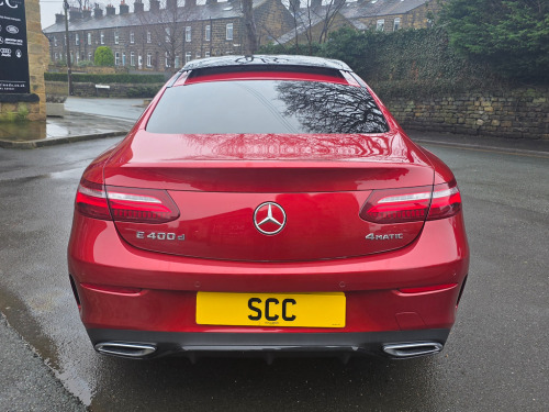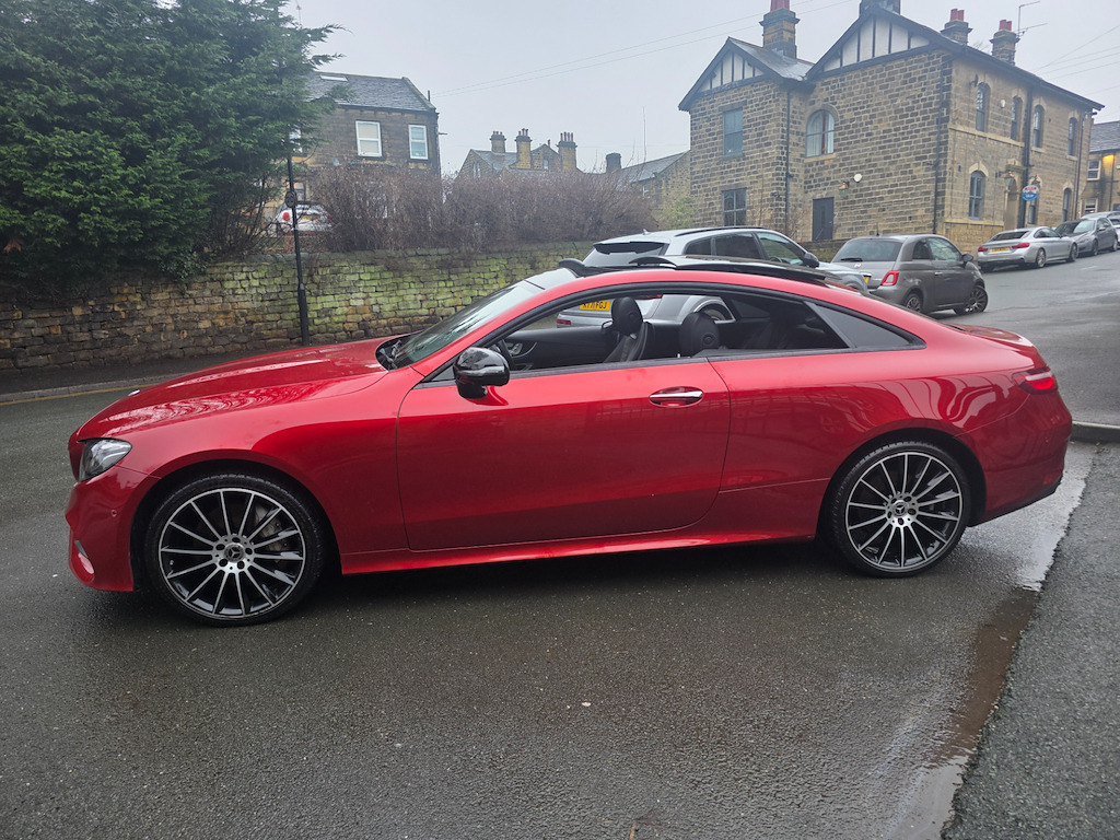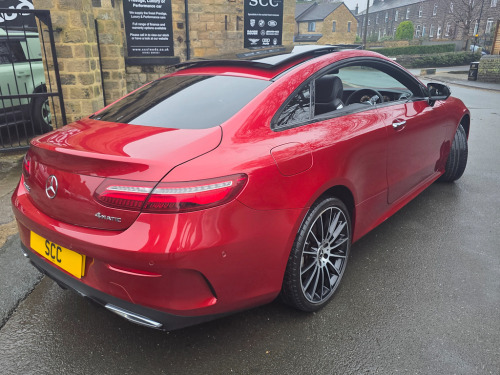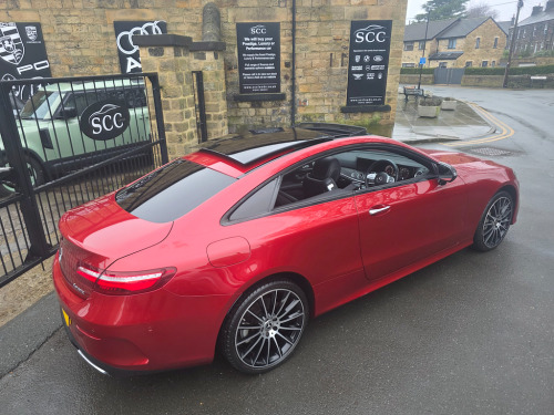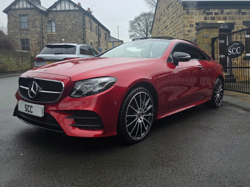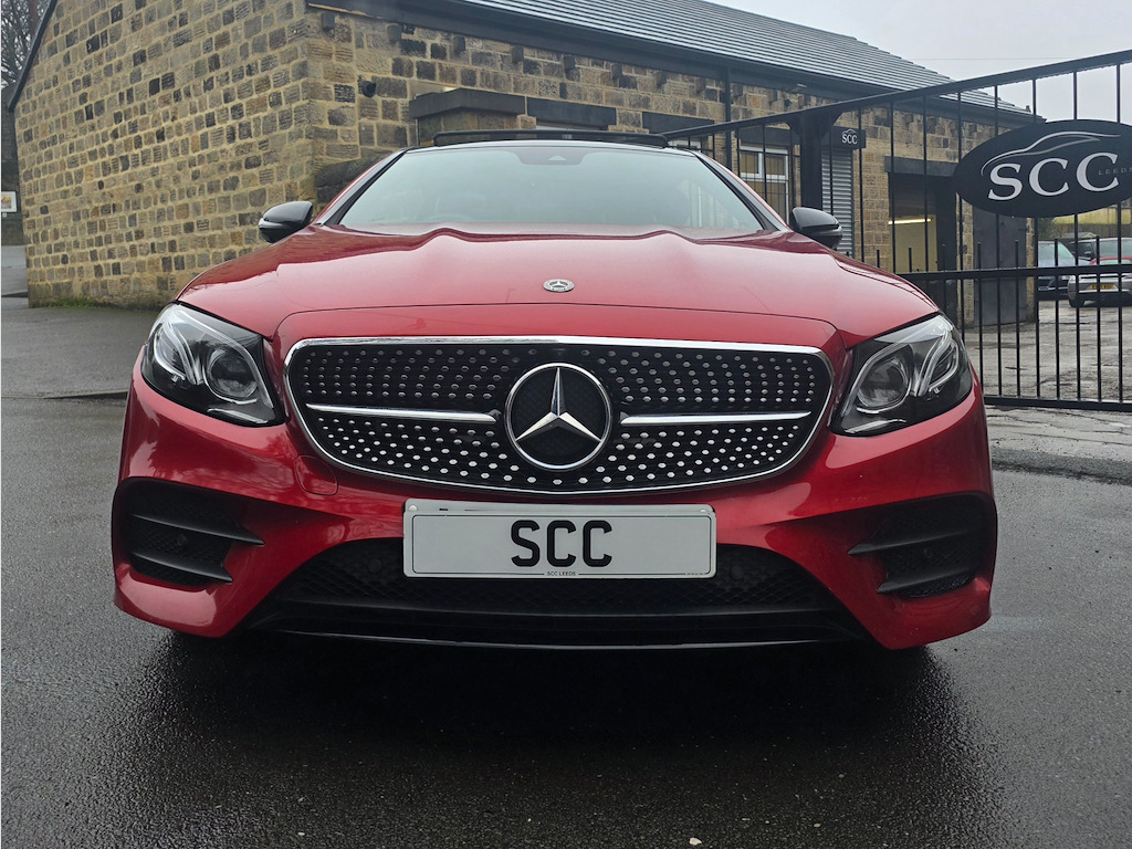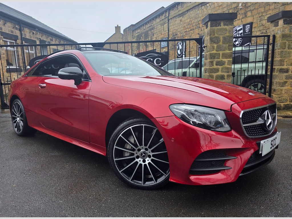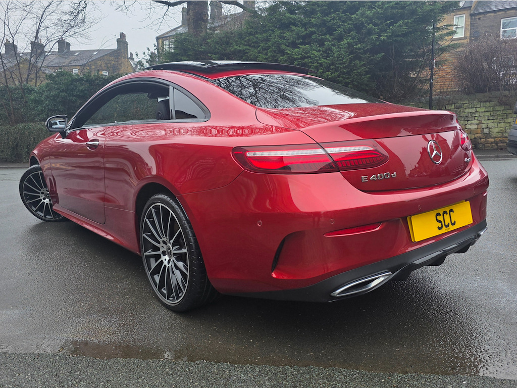 Mercedes-Benz E400 4MATIC Coupe | Premium Plus | Designo Hyacinth Red | Sporty & Refined Available now | £31,995 Turn heads in this stunning Mercedes-Benz E400 4MATIC Coupe, finished in Designo Hyacinth Red and featuring a panoramic glass roof that floods the cabin with natural light. The Premium Plus specification and Night Package add a touch of luxury and aggressive style, making this coupe as striking as it is dynamic. 20 inch multispoke wheels. Beneath the sculpted bonnet, the E400’s powerful 3.0L V6 engine delivers 335 BHP with effortless performance, while the 4MATIC all-wheel-drive system ensures confidence and grip in all conditions. The Agility Control Suspension with Selective Damping, lowered by 15mm, keeps the car planted and agile through every corner, making driving a pure pleasure. Inside, the cabin blends luxury with sportiness, featuring Artico Leather-Dinamica microfibre in Black, a leather-trimmed upper dashboard with contrast stitching, and two-zone automatic climate control for tailored comfort. For the ultimate audio experience, enjoy the brilliant Burmester Pro Surround Sound system, delivering crystal-clear music that fills the cabin with immersive sound. Safety is uncompromised with ABS, ATTENTION Assist, and a suite of intelligent Mercedes driver aids, giving you peace of mind on every journey. This E400 4MATIC Premium Plus Coupe combines eye-catching style, exhilarating performance, and high-end luxury, delivering a driving experience that truly stands out. Last serviced 24.11.2025. MOT 06.10.2026 2021, 2022 AND 2023 ALL MERCEDES Call SCC Leeds on 01943 884551 to arrange a viewing and experience this remarkable coupe for yourself. ABS - Anti-Lock Braking System,AMG Bodystyling - Front and Rear Apron - Side Skirts,AMG Boot Lid Spoiler in Body Colour,ATTENTION Assist,Active Bonnet - Pedestrian Safety Measure which Detects an Impact and Raises Bonnet,Active Brake ASSIST,Active Park Assist,Adaptive Brake Lights,Adaptive Brake System with HOLD Function and Brake Drying in the Wet,Agility Control Suspension with Selective Damping System and Lowering by 15mm,Airbag - Kneebag for Driver,Airbags - Driver and Front Passenger with Extended Adaptivity for Front Passenger Airbag,Airbags - Headbags,Airbags - Sidebag for Driver and Front Passenger - Combined Thorax-Pelvis Bag,Airbags - Windowbags,Alarm System with Immobiliser and Interior Protection,Analogue Clock in Centre Console,Audio 20 USB,Automatic Child Seat Recognition Sensor,Automatic Climate Control - Two-Zone,Belt Feeder,Blind Spot Assist,Brake Wear Warning Display,Central Locking with Interior Switch-Automatic Locking and Crash Sensor with Emergency Opening Function,Central Stowage Compartment with 12V Socket in Centre Console,Cruise Control with Variable Speed Limiter,DAB Digital Radio Tuner,Direct-Steer Speed Sensitive Steering,Door Pins in Chrome,Dynamic Select with a Choice of Driving Modes - Comfort - ECO - Sport - Sport Plus - Individual,ESP - Electronic Stability Programme,Electric Parking Brake,Electric Windows - 4 - With One-Touch Opening and Closing - including Obstruction Sensors,Electronic Key - Chrome Surround,Exhaust System - Visible Twin-Pipe Integrated into the Bumper,First Aid Kit and Warning Triangle,Floor Mats with AMG Lettering,Front Centre Armrest with Stowage Compartment,Front Door Sill Panels with Mercedes-Benz Lettering - Illuminated,Glove Compartment - Lockable - Air-Conditioned and Illuminated,Head Restraints for Driver and Front Passenger 4-Way and in Rear 2-Way Adjustability,Headlamps - LED High Performance with Integrated LED Daytime Running Lights,Heated Front Seats,High-Resolution 12.3in Multimedia Colour Display,ISOFIX Child Seat Attachment Points - Rear Seats,Incorrect Fuelling Protection,Instrument Cluster - Widescreen 12.3in Cockpit Display,Interior 64-Colour Ambient Lighting,KEYLESS-GO Starting Function,Mercedes Me Connect,Mirror Package,Outside Temperature Display,Perforated Front Brake Discs with Mercedes-Benz Lettering,Pre-Installation for Roof Rail Systems,Pre-Safe Anticipatory Safety System,Premium Plus Package,Privacy Glass,Radiator Grille with Integrated Mercedes-Benz Star - Single Louvre in Matt Iridium Silver With Chrome Trim,Rain Sensing Windscreen Wipers,Rear Lights - LED,Remote Boot Release,Reversing Camera,Run Flat Tyres,SD Card-Based Navigation System,Seat Belts - Three-Point,Seat Comfort Package - Driver and Front Passenger Seat,Seat Occupancy Sensor - Front Passenger Seat,Seats - Rear Split Folding 40-20-40,Service Indicator ASSYST,Sports Pedals in Brushed Stainless Steel with Black Rubber Studs,Status Display for Rear Seat Belts in Instrument Cluster,Steering Column - Manually Adjustable for Height and Reach,Steering Wheel - 3-Spoke AMG Multi-Function with Touch Control Buttons - Trimmed in Black Nappa Leather with Flattened Bottom Section,Steering Wheel - Gear Shift Paddles,Steering Wheel - Touch-Control Buttons for Audio and Onboard Settings,Stowage Package,Sun Visors with Illuminated Vanity Mirrors,Sunglasses Compartment in Overhead Control Panel,Top Surround of Side Windows in Polished Aluminium,Touchpad with Control Wheel,Trim - Centre Console in Black Open-Pore Ash Wood,Trim - Dashboard and Door - Black Open-Pore Ash Wood,Trim - Upper Dashboard - ARTICO Leather with Contrast Top Stitching,Trip Computer in Multi-Function Display Showing Current Fuel Consumption,Tyre Pressure Monitoring System,USB Ports in Centre Console x2,USB Ports in the Rear x2,Waistline in Polished Aluminium,Hyacinth Red,Night Package,Artico Leather-Dinamica Microfibre - Black,20in Alloy Wheels - Multi-Spoke Design - Painted in Titanium Grey with High-Sheen Finish