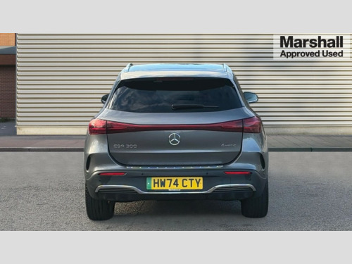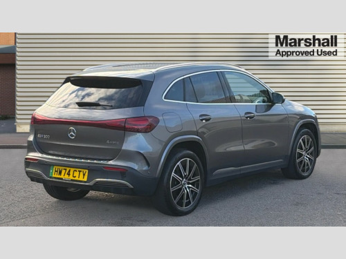 Mercedes-Benz Eqa EQA 300 4M 168kW AMG Line Executive 66.5kWh 5dr At Acoustic ambient protection, DYNAMIC SELECT with a choice of driving modes (max range, ECO, comfort and sport), Easy-pack tailgate, EQ navigation services - map (range display), display charging stations, programming of charging settings and pre entry climate control, Hard-disk navigation, Mercedes Benz emergency call system, Mercedes me connect, PAS, Service indicator, Smartphone integration with Apple CarPlay and Android auto, Trip computer, 100KW DC onboard charger, 11KW onboard charger, Charging cable for wall box and public charging station - Type 2(mode 3) 5m, Combined charging system CCS-2 connector, Comfort suspension with ride height lowering, DAB Digital radio, MBUX multimedia system with 10" Digital instrument cluster and 10" media display with touchscreen, Mercedes-Benz sound system, 3rd brake light, AMG Line bodystyling including AMG front apron with integrated air curtain and AMG rear apron with diffusor optics, Body colour bumpers, Daytime running lights, Electric front windows, Electric rear windows, Electrically adjustable door mirrors, Front and rear LED light band, Front fog lights, Grille with star pattern in chrome, Heated door mirrors, LED High performance headlamps with adaptive highbeam assist, Polished aluminium roof rails, Privacy glass - heat insulating dark tinted glass, Rain sensor windscreen wipers, Rear side wing doors, Rear wiper, Wheel arch liners in the colour of the vehicle, 3 seat bench in 2nd row, 3 spoke AMG multifunction sports flat bottom steering wheel in nappa leather with galvanised shift paddles, 40:20:40 split folding rear seats, Ambient lighting with choice of 64 colour settings, AMG brushed stainless steel sports pedals with aluminium rubber studs, AMG floor mats, AMG sports seats, Double Cupholder, Fluorescent jacket, Front and rear head restraints, Heated front seats, Illuminated door sills with EQA lettering, Reach and rake adjustable steering column, Rear armrest with storage + through load, Roof lining - Black fabric, Single front passenger seat, Stowage compartment with retractable cover, THERMATIC automatic climate control, Interior light package - EQA, Mirror package without dimming interior and drivers exterior mirrors- EQA, Parking package with reversing camera - EQA, Seat comfort pack - EQA, Stowage package - EQA, 3 rear seatbelts, 6 airbags - Driver, front passenger, curtain and side airbags, ABS, Child locks on rear doors, Electric parking brake, ESP, Front passenger airbag deactivation, Isofix child seat anchor points on outer rear seats, Knee bags, Radar-based recuperation, Guard 360 degree vehicle protection, Keyless entry, Remote central locking, Backlit star pattern trim, 19" AMG 10 spoke light alloy wheels aerodynamically optimised painted in high gloss black with high sheen finish, Summer tyres, Tirefit