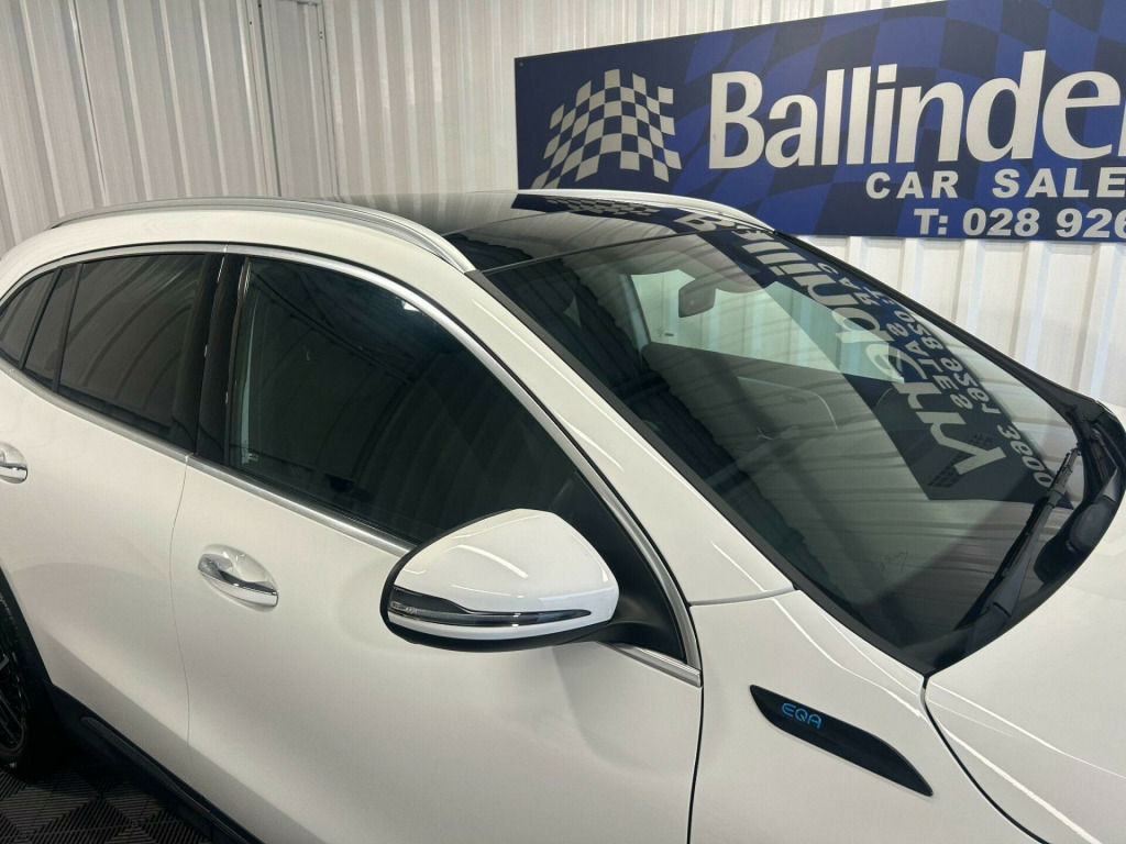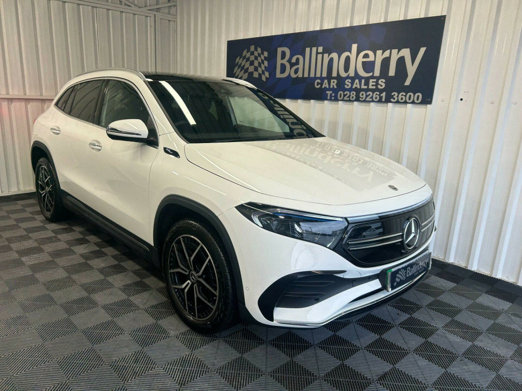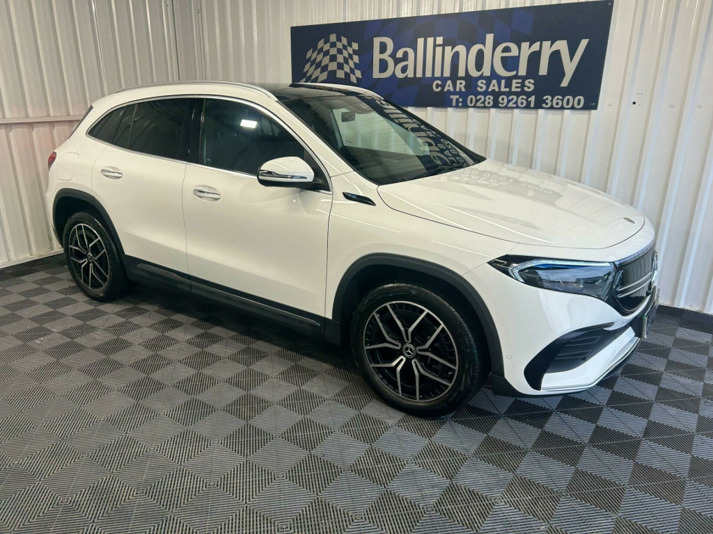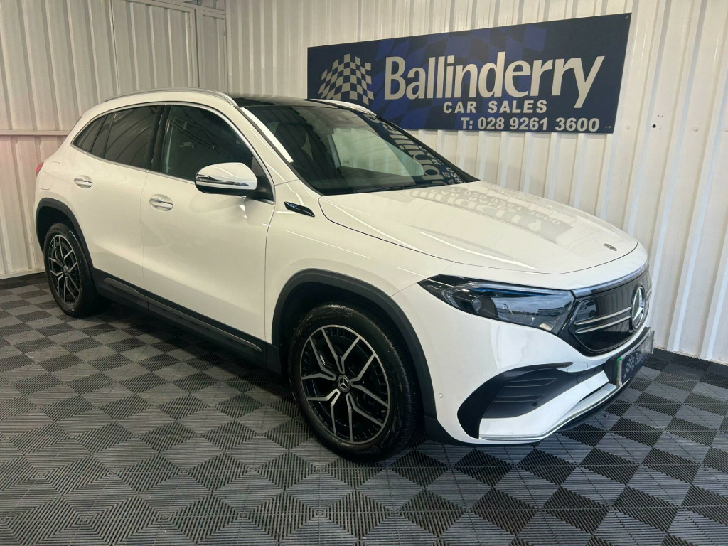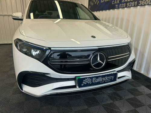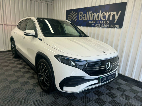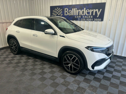 PERFECT EXAMPLE OF THIS MERCEDES EQA 300 66.5KWH AMG LINE PREMIUM AUTO IN WHITE:** VERY LOW MILES** ONE OWNER FROM NEW** FULL SERVICE HISTORYCharge Cable - Type 2Charge Cable - 3 Pin** PANORAMIC SUNROOF** 19 INCH ALLOYS** FRONT & REAR PARKING SENSORS** REVERSE CAMERA** SAT NAV** FLAT BOTTOM AMG STEERING WHEEL** HALF LEATHER SPORTS SEATS** HEATED SEATS** APPLE CAR PLAY** CRUISE CONTROLLOW RATE FINANCE DEALS (HP & PCP) AVAILABLE WITH NO DEPOSIT REQUIREDALL TRADE IN`S WELCOMETELEPHONE MARK OR STUART ON 02892 613600 OR 07802 396444. 100kW DC On-Board Charger, 10in Digital Instrument Cluster, 10in Digital Media Display, 11kW On-Board Charger, 19in Alloy Wheels - AMG Light 5-Twin Spoke, ABS - Anti-Lock Braking System, AMG Line Bodystyling, Active Brake Assist, Active Lane Keeping Assist, Active Speed Limit Assist, Airbag - Driver, Airbags - Kneebag, Airbags - Passenger, Ambient Lighting - 64 Colours, Augmented Reality Navigation, Automatically Dimming Rear View Mirror, Black Panel Radiator Grille in a Twin-Blade Design in Chrome, Blind Spot Assist with Exit Warning Function, CCS-2 Connector - Combined Charging System - Compatible with AC and DC, Charging Cable for Domestic Plug Socket - Type G - Mode 2 - 5m, Charging Cable for Wallbox and Public Charging Stations - Type 2 - Mode 3 - 5m, Comfort Suspension, Cruise Control, DAB Digital Radio, Door Sill Panels - Illuminated with EQA Lettering, Double Cupholder, Dynamic Select, EASY-PACK Electric Tailgate, EQ Navigation Services, Electric Panoramic Glass Sunroof, Electric Windows - Front, Floor Mats - AMG, Front and Rear LED Light Bands, Geofencing, Hard-Disc Navigation, Headlights - Adaptive High Beam Assist, Heat Insulating Dark Tinted Glass, Heated Front Seats, IONITY 1 Year, Interior Lighting Package, Keyless Go Comfort Package, LED High Performance Headlights, Live Traffic Information - Free for the First Three Years, MBUX Multimedia System, Mercedes Me Charge - 3 Years, Mercedes-Benz Advanced Sound System - 225W, Mercedes-Benz Emergency Call System, Mirror Package, Notification when Exceeding the Road Speed, Parked Vehicle Locator, Parking Damage and Theft Notification, Parking Package with Reversing Camera, Pedals - Aluminium with Rubber Studs, Power Steering - Electric, Programming of Auxiliary Heating - Ventilation, Rear Armrest with Through-Loading Feature, Remote Door Locking and Unlocking, Remote Retrieval of Vehicle Status, Remote Vehicle Finder, Roof Lining - Black Fabric, Roof Rails - Polished Aluminium, Seat Comfort Package, Seats - Sports, Send2Car Function, Smartphone Integration, Steering Wheel - Galvanised Shift Paddles, Steering Wheel - Sports Multifunction in Nappa Leather, Stowage Compartment with Retractable Cover, Stowage Package, Summer Tyres, Surround Lighting with Projection of Brand Logo, THERMOTRONIC - Automatic Climate Control, TIREFIT, Trim - Light Longitudinal-Grain Aluminium, URBAN GUARD Vehicle Protection, Vehicle Set-Up and Vehicle Monitoring - 3 Years, Windscreen Wipers with Rain Sensor, Wireless Charging for Mobile Devices.