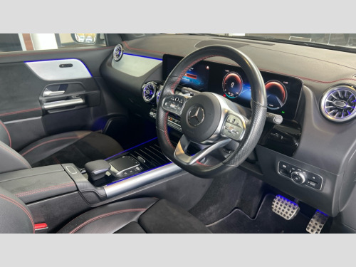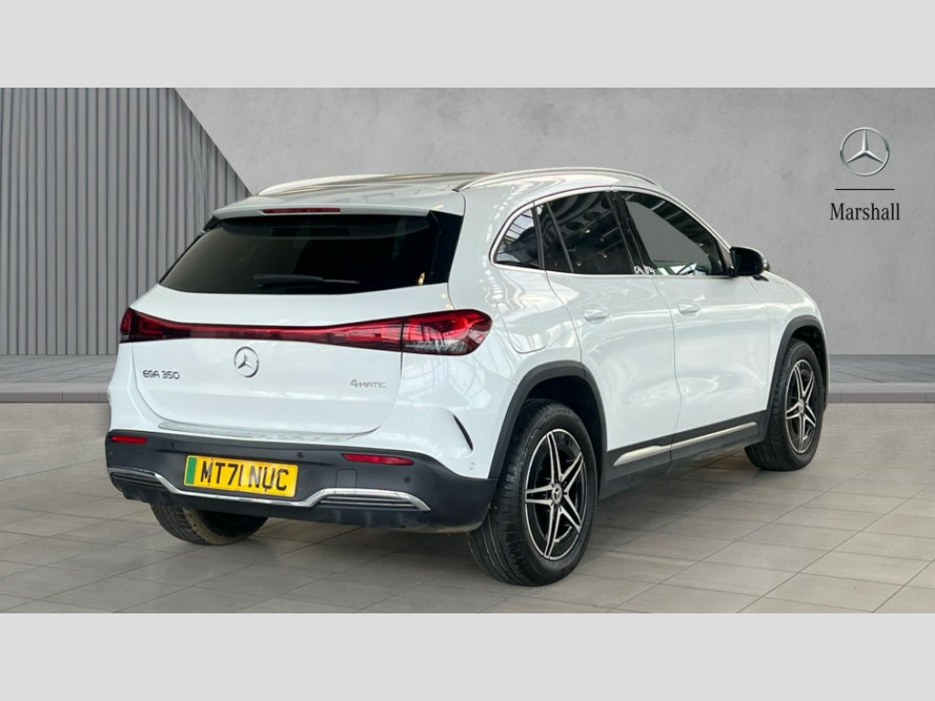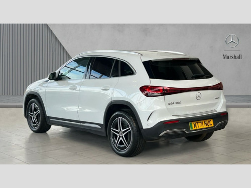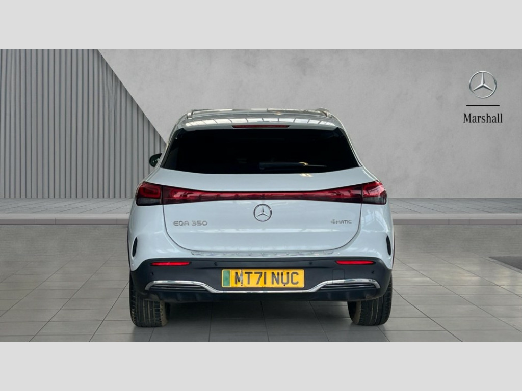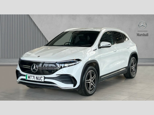 Mercedes-Benz Eqa EQA 350 4Matic 215kW AMG Line 66.5kWh 5dr Auto Acoustic ambient protection, DYNAMIC SELECT with a choice of driving modes (max range, ECO, comfort and sport), Easy-pack tailgate, EQ navigation services - map (range display), display charging stations, programming of charging settings and pre entry climate control, Hard-disk navigation, Mercedes Benz emergency call system, Mercedes me connect, Service indicator, Smartphone integration with Apple CarPlay and Android auto, Trip computer, 100KW DC onboard charger, 11KW onboard charger, Charging cable for domestic plug socket, Type G (Mode 2) 5m, Charging cable for wall box and public charging station - Type 2(mode 3) 5m, Combined charging system CCS-2 connector, Comfort suspension, DAB Digital radio, MBUX multimedia system with 10" Digital instrument cluster and 10" media display with touchscreen, Mercedes benz sound system, 3rd brake light, AMG Line bodystyling including AMG front apron with integrated air curtain and AMG rear apron with diffusor optics, Black panel radiator grille with twin blade design in chrome, Body colour bumpers, Daytime running lights, Electric front windows, Electric rear windows, Front and rear LED light band, Front fog lights, LED High performance headlamps with adaptive highbeam assist, Polished aluminium roof rails, Privacy glass - heat insulating dark tinted glass, Rain sensor windscreen wipers, Rear wing door, Rear wiper, Surround lighting with projection of brand logo, 3 seat bench in 2nd row, 3 spoke AMG multifunction sports flat bottom steering wheel in nappa leather with galvanised shift paddles, 40:20:40 split folding rear seats, Ambient lighting with choice of 64 colour settings, AMG brushed stainless steel sports pedals with aluminium rubber studs, AMG sports seats, Artico man-made leather/ Dinamica microfiber upholstery, Double Cupholder, Front and rear head restraints, Heated front seats, Illuminated door sills with EQA lettering, Reach and rake adjustable steering column, Rear armrest with storage + through load, Roof lining - Black fabric, Single front passenger seat, Stowage compartment with retractable cover, THERMOTRONIC automatic climate control, Velour floor mats with AMG lettering, Interior light package - EQA, Mirror package - EQA, Parking package with reversing camera - EQA, Seat comfort pack - EQA, Stowage package - EQA, 3 rear seatbelts, 6 airbags - Driver, front passenger, curtain and side airbags, ABS, Child locks on rear doors, ESP, Isofix child seat anchor points on outer rear seats, Knee bags, Radar-based recuperation, Remote central locking, Urban guard vehicle protection, Light longitudinal grain aluminium trim painted, 18" AMG 5 spoke light alloy wheels, Summer tyres, Tirefit