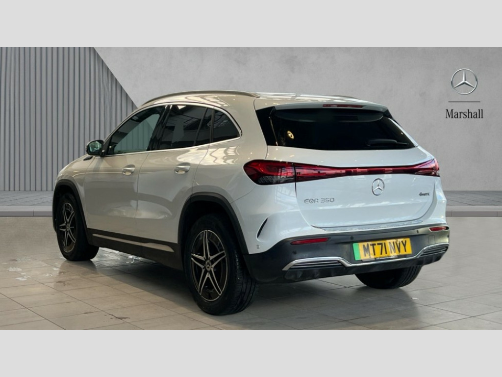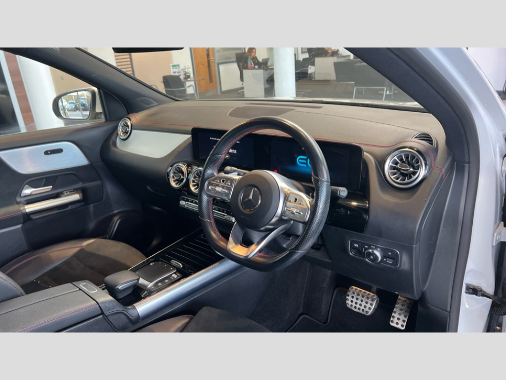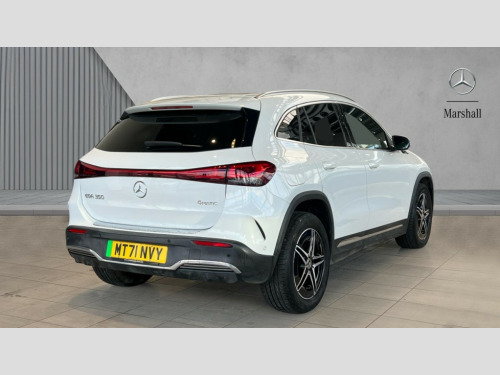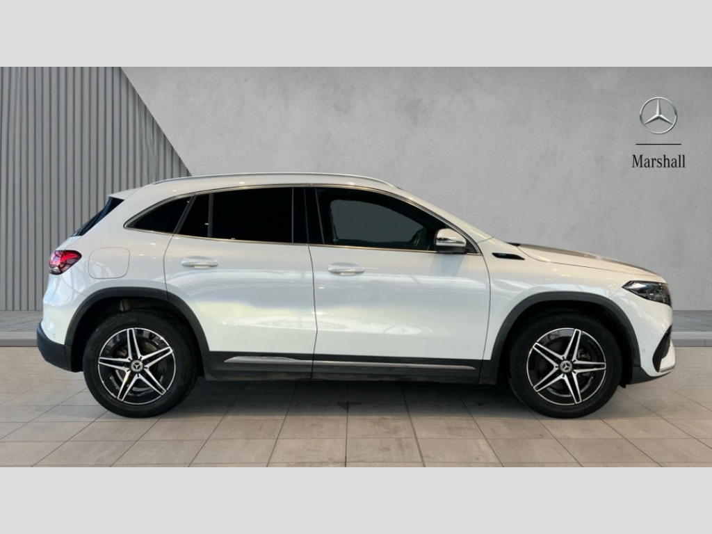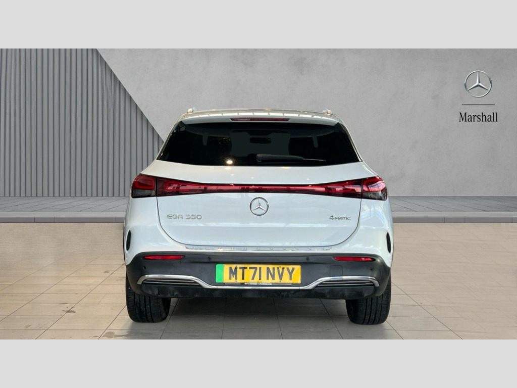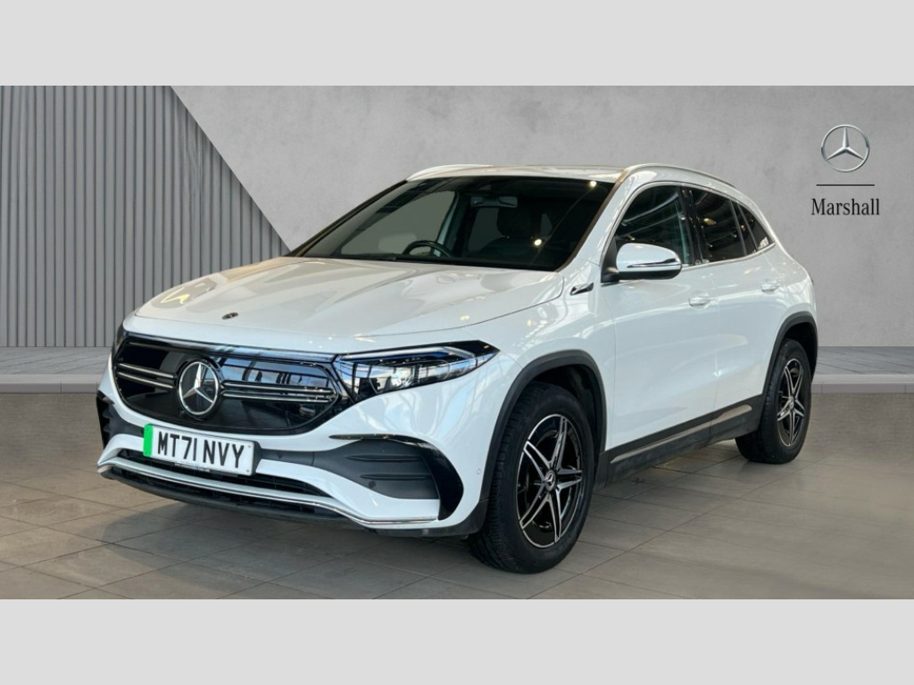 Mercedes-Benz Eqa EQA 350 4Matic 215kW AMG Line 66.5kWh 5dr Auto Acoustic ambient protection, DYNAMIC SELECT with a choice of driving modes (max range, ECO, comfort and sport), Easy-pack tailgate, EQ navigation services - map (range display), display charging stations, programming of charging settings and pre entry climate control, Hard-disk navigation, Mercedes Benz emergency call system, Mercedes me connect, Service indicator, Smartphone integration with Apple CarPlay and Android auto, Trip computer, 100KW DC onboard charger, 11KW onboard charger, Charging cable for domestic plug socket, Type G (Mode 2) 5m, Charging cable for wall box and public charging station - Type 2(mode 3) 5m, Combined charging system CCS-2 connector, Comfort suspension, DAB Digital radio, MBUX multimedia system with 10" Digital instrument cluster and 10" media display with touchscreen, Mercedes benz sound system, 3rd brake light, AMG Line bodystyling including AMG front apron with integrated air curtain and AMG rear apron with diffusor optics, Black panel radiator grille with twin blade design in chrome, Body colour bumpers, Daytime running lights, Electric front windows, Electric rear windows, Front and rear LED light band, Front fog lights, LED High performance headlamps with adaptive highbeam assist, Polished aluminium roof rails, Privacy glass - heat insulating dark tinted glass, Rain sensor windscreen wipers, Rear wing door, Rear wiper, Surround lighting with projection of brand logo, 3 seat bench in 2nd row, 3 spoke AMG multifunction sports flat bottom steering wheel in nappa leather with galvanised shift paddles, 40:20:40 split folding rear seats, Ambient lighting with choice of 64 colour settings, AMG brushed stainless steel sports pedals with aluminium rubber studs, AMG sports seats, Artico man-made leather/ Dinamica microfiber upholstery, Double Cupholder, Front and rear head restraints, Heated front seats, Illuminated door sills with EQA lettering, Reach and rake adjustable steering column, Rear armrest with storage + through load, Roof lining - Black fabric, Single front passenger seat, Stowage compartment with retractable cover, THERMOTRONIC automatic climate control, Velour floor mats with AMG lettering, Interior light package - EQA, Mirror package - EQA, Parking package with reversing camera - EQA, Seat comfort pack - EQA, Stowage package - EQA, 3 rear seatbelts, 6 airbags - Driver, front passenger, curtain and side airbags, ABS, Child locks on rear doors, ESP, Isofix child seat anchor points on outer rear seats, Knee bags, Radar-based recuperation, Remote central locking, Urban guard vehicle protection, Light longitudinal grain aluminium trim painted, 18" AMG 5 spoke light alloy wheels, Summer tyres, Tirefit