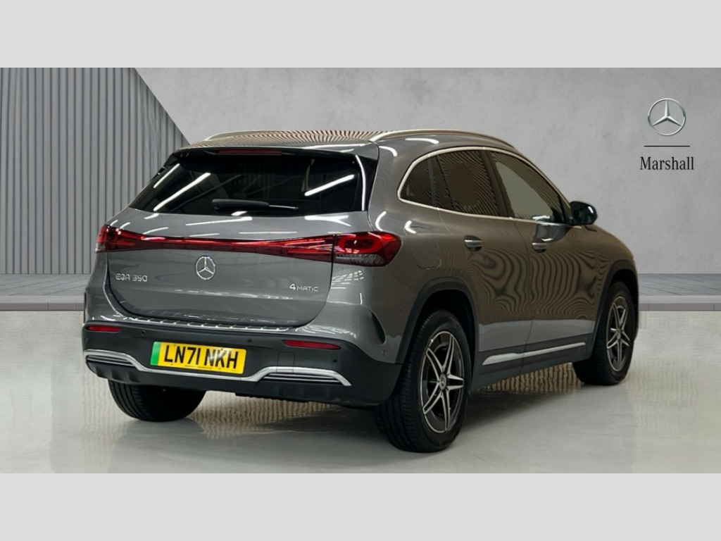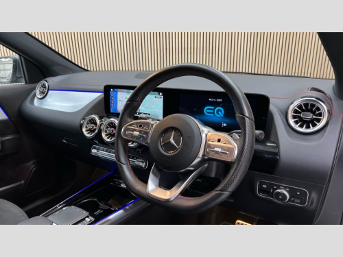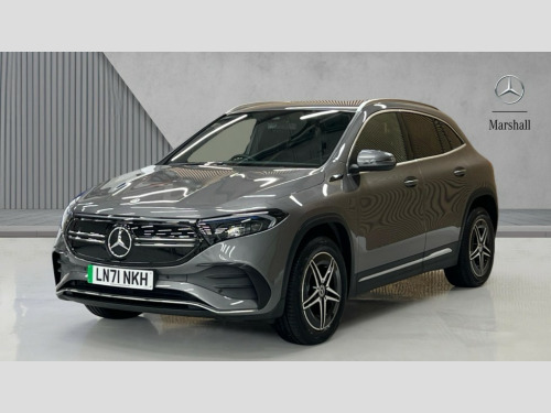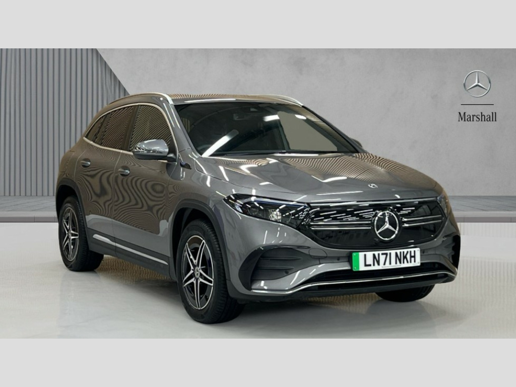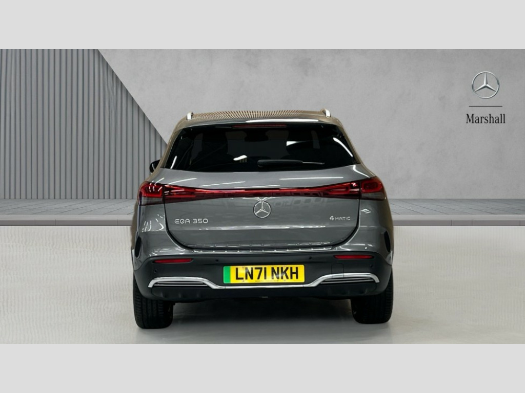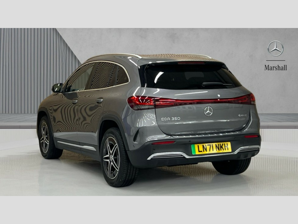 Mercedes-Benz Eqa EQA 350 4Matic 215kW AMG Line 66.5kWh 5dr Auto Acoustic ambient protection, DYNAMIC SELECT with a choice of driving modes (max range, ECO, comfort and sport), Easy-pack tailgate, EQ navigation services - map (range display), display charging stations, programming of charging settings and pre entry climate control, Hard-disk navigation, Mercedes Benz emergency call system, Mercedes me connect, Service indicator, Smartphone integration with Apple CarPlay and Android auto, Trip computer, 100KW DC onboard charger, 11KW onboard charger, Charging cable for domestic plug socket, Type G (Mode 2) 5m, Charging cable for wall box and public charging station - Type 2(mode 3) 5m, Combined charging system CCS-2 connector, Comfort suspension, DAB Digital radio, MBUX multimedia system with 10" Digital instrument cluster and 10" media display with touchscreen, Mercedes benz sound system, 3rd brake light, AMG Line bodystyling including AMG front apron with integrated air curtain and AMG rear apron with diffusor optics, Black panel radiator grille with twin blade design in chrome, Body colour bumpers, Daytime running lights, Electric front windows, Electric rear windows, Front and rear LED light band, Front fog lights, LED High performance headlamps with adaptive highbeam assist, Polished aluminium roof rails, Privacy glass - heat insulating dark tinted glass, Rain sensor windscreen wipers, Rear wing door, Rear wiper, Surround lighting with projection of brand logo, 3 seat bench in 2nd row, 3 spoke AMG multifunction sports flat bottom steering wheel in nappa leather with galvanised shift paddles, 40:20:40 split folding rear seats, Ambient lighting with choice of 64 colour settings, AMG brushed stainless steel sports pedals with aluminium rubber studs, AMG sports seats, Artico man-made leather/ Dinamica microfiber upholstery, Double Cupholder, Front and rear head restraints, Heated front seats, Illuminated door sills with EQA lettering, Reach and rake adjustable steering column, Rear armrest with storage + through load, Roof lining - Black fabric, Single front passenger seat, Stowage compartment with retractable cover, THERMOTRONIC automatic climate control, Velour floor mats with AMG lettering, Interior light package - EQA, Mirror package - EQA, Parking package with reversing camera - EQA, Seat comfort pack - EQA, Stowage package - EQA, 3 rear seatbelts, 6 airbags - Driver, front passenger, curtain and side airbags, ABS, Child locks on rear doors, ESP, Isofix child seat anchor points on outer rear seats, Knee bags, Radar-based recuperation, Remote central locking, Urban guard vehicle protection, Light longitudinal grain aluminium trim painted, 18" AMG 5 spoke light alloy wheels, Summer tyres, Tirefit