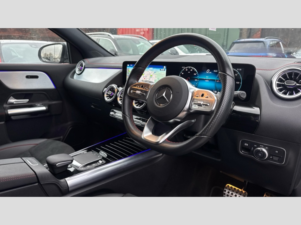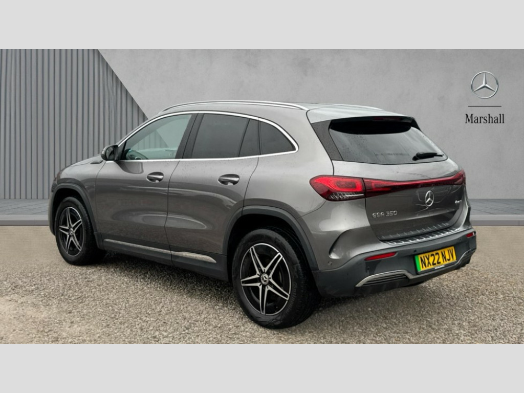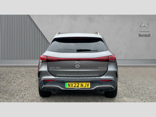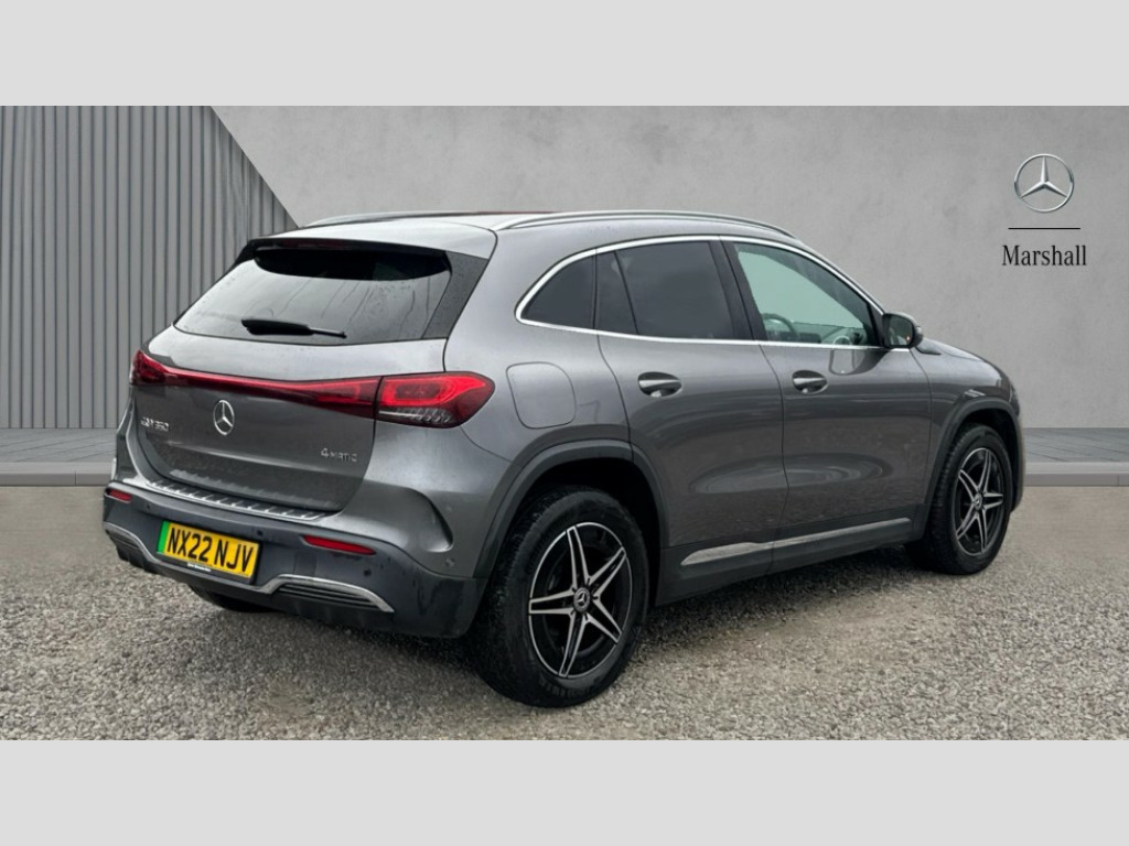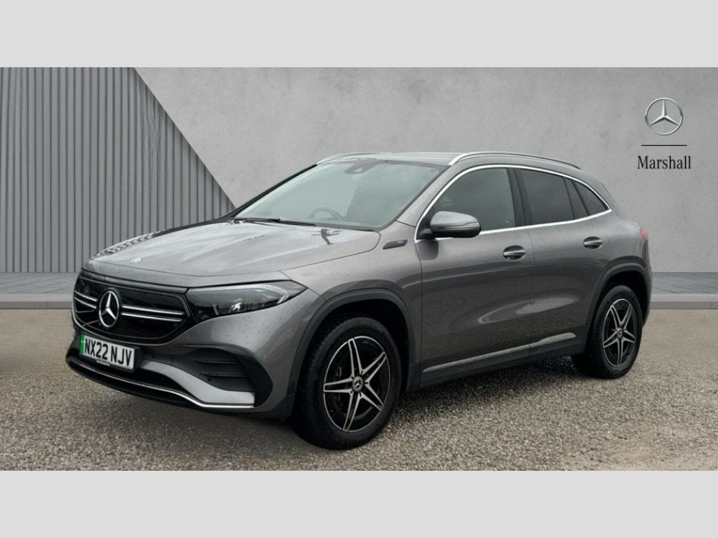Mercedes-Benz Eqa EQA 350 4Matic 215kW AMG Line 66.5kWh 5dr Auto Acoustic ambient protection, DYNAMIC SELECT with a choice of driving modes (max range, ECO, comfort and sport), Easy-pack tailgate, EQ navigation services - map (range display), display charging stations, programming of charging settings and pre entry climate control, Hard-disk navigation, Mercedes Benz emergency call system, Mercedes me connect, Service indicator, Smartphone integration with Apple CarPlay and Android auto, Trip computer, 100KW DC onboard charger, 11KW onboard charger, Charging cable for domestic plug socket, Type G (Mode 2) 5m, Charging cable for wall box and public charging station - Type 2(mode 3) 5m, Combined charging system CCS-2 connector, Comfort suspension, DAB Digital radio, MBUX multimedia system with 10" Digital instrument cluster and 10" media display with touchscreen, Mercedes benz sound system, 3rd brake light, AMG Line bodystyling including AMG front apron with integrated air curtain and AMG rear apron with diffusor optics, Black panel radiator grille with twin blade design in chrome, Body colour bumpers, Daytime running lights, Electric front windows, Electric rear windows, Front and rear LED light band, Front fog lights, LED High performance headlamps with adaptive highbeam assist, Polished aluminium roof rails, Privacy glass - heat insulating dark tinted glass, Rain sensor windscreen wipers, Rear side wing doors, Rear wing door, Rear wiper, Surround lighting with projection of brand logo, 3 seat bench in 2nd row, 3 spoke AMG multifunction sports flat bottom steering wheel in nappa leather with galvanised shift paddles, 40:20:40 split folding rear seats, Ambient lighting with choice of 64 colour settings, AMG brushed stainless steel sports pedals with aluminium rubber studs, AMG sports seats, Artico man-made leather/ Dinamica microfiber upholstery, Double Cupholder, Front and rear head restraints, Heated front seats, Illuminated door sills with EQA lettering, Reach and rake adjustable steering column, Rear armrest with storage + through load, Roof lining - Black fabric, Single front passenger seat, Stowage compartment with retractable cover, THERMOTRONIC automatic climate control, Velour floor mats with AMG lettering, Interior light package - EQA, Mirror package - EQA, Parking package with reversing camera - EQA, Seat comfort pack - EQA, Stowage package - EQA, 3 rear seatbelts, 6 airbags - Driver, front passenger, curtain and side airbags, ABS, Child locks on rear doors, ESP, Isofix child seat anchor points on outer rear seats, Knee bags, Radar-based recuperation, Remote central locking, Urban guard vehicle protection, Light longitudinal grain aluminium trim painted, 18" AMG 5 spoke light alloy wheels, Summer tyres, Tirefit