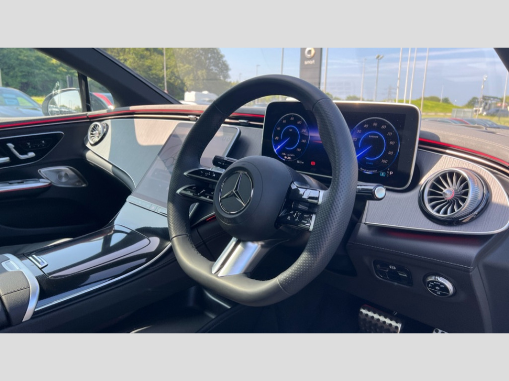 Mercedes-Benz Eqe EQE 350+ 215kW AMG Line Nt Ed Prem+ 96kWh 4dr Auto 5G Communications module, Active traffic sign assist, DYNAMIC SELECT with a choice of driving modes (ECO, Comfort, Sport and Individual), Electric charging flap, EQ navigation services - map (range display), display charging stations, programming of charging settings and pre entry climate control, Finger print scanner, Geofencing, Hard-disk navigation, Head up Display, MBUX Interior assistant, Mercedes Benz emergency call system, Mercedes me charge, Mercedes me connect, Mercedes me services, Multifunction telephony, Parked vehicle locator, PAS, Pre-installation for private car sharing, Remote parking function, Remote vehicle finder, Wireless smartphone integration, 11KW onboard charger, 170kW DC onboard charger, 96kWh battery, CCS-2 connector - DC charging with combined charging system and compatible with AC and DC, Charging cable for wall box and public charging station - Type 2(mode 3) 5m, Five recuperation levels, Burmester surround sound system with dolby atmos, DAB Digital radio, Digital TV tuner, MBUX multimedia system, ZYNC In car entertainment, AMG exterior styling, AMG front bumper in vehicle colour with A-wing in high gloss black and chrome trim, AMG performance rear boot spoiler, Body colour AMG rear apron with high-gloss black diffuser-look inserts, chrome double trim strip and flics at left/right air outlets in grained black, Daytime running lights, Digital HD LED headlight with projection functions and adaptive high beam plus, Frameless windows, Front and rear electric windows, Heated windscreen washer system, High-gloss chrome front splitter with flics and fins at the left and right air inlets in high-gloss black with chrome trim, LED High level third brake light, LED rear tail lamps with 3D helix design, Panoramic sliding sunroof with remote closing and opening including ventilation function, Privacy glass, Rear boot, Rear side wing doors, Seamless door handles, Side skirts in high-gloss black with chrome inserts, Star pattern radiator grille, Windows with remote closing and opening including ventilation function, 3 seat bench in 2nd row, Ambient lighting 64 colours with direct light lines, AMG brushed stainless steel sports pedals with aluminium rubber studs, AMG multifunction sports steering wheel in nappa leather, AMG sports seats, Heat pump, HEPA air filter, Illuminated door sills with Mercedes Benz lettering, Infrared quality sensor, Roof lining - Black fabric, Single front passenger seat, Split folding rear seats, Storage compartment under center console, THERMOTRONIC automatic climate control, Acoustic comfort pack - EQE, Air balance pack - EQE, Air quality pack - EQE, AMG interior design pack - EQE Edition Midnight, Driving assistance plus pack - EQE, Easy pack tailgate, Energizing pack plus - EQE, Interior light pack - EQE, Keyless go pack - EQE, Memory pack when chosen with headup display - EQE, Mirror pack - EQE, Night pack in black chrome - EQE, Parking pack - EQE, Refinement pack - EQE, USB package - EQE, ABS, Driver airbag, ESP, Front passenger airbag, Front passenger airbag deactivation, Front seatbelt pretensioners, Front seatbelt reminder, Rear door child safety locks, Seatbelt load limiter, Three point rear seat belts, Dashcam, Guard 360 degree vehicle protection plus, Remote door locking and unlocking, Speedfencing, Valet protect, Vehicle tracking, Dashboard and belt lines in space grey ARTICO man-made leather with NEOTEX grain and red topstitching, 21" AMG multi spoke gloss black light alloy wheels, Summer tyres, Tirefit