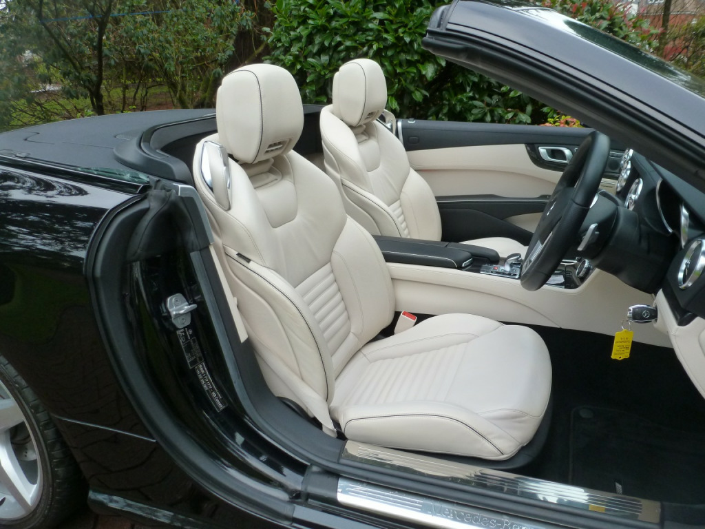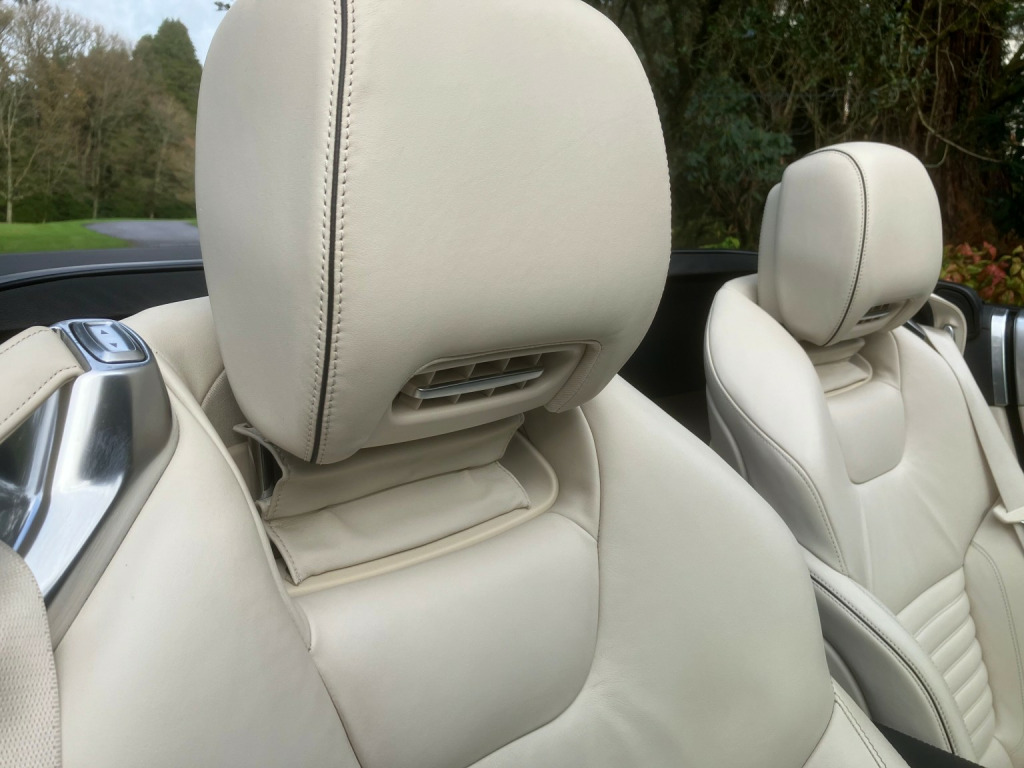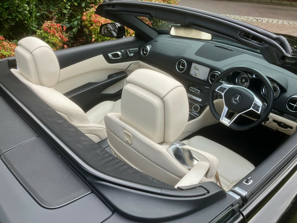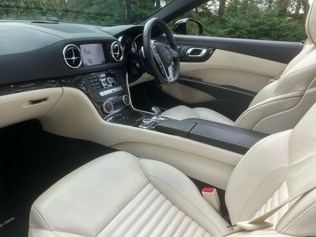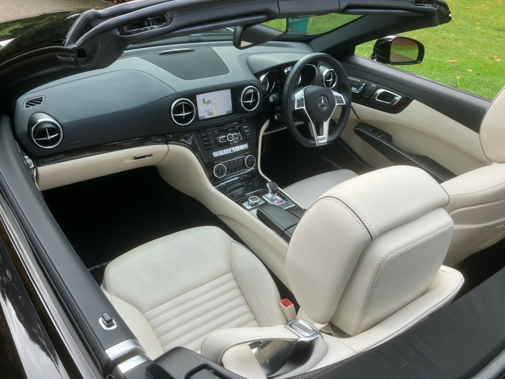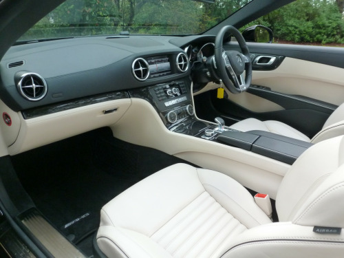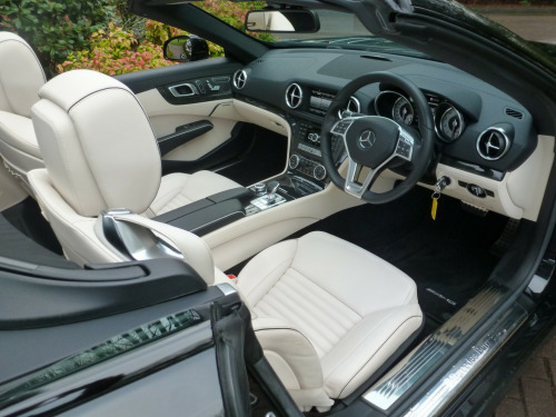 Obsidian Black metallic with Beige Nappa leather and Black Ash Wood trim. Only 27000 mls with full Mercedes main dealer service history!, Fantastic specification includes £9700 options:, AMG Sports package,19in AMG Diamond cut alloys,Harmon Kardon Logic Surround sound system,Active Park Assist including Parktronic,Panoramic Glass roof,Air Scarf neck heating,DAB Radio,Door closing Aid,Reversing Camera,Ambient lighting,Centre console cup holder,AMG 3 spoke s/wheel,Comand Sat Nav,Electric folding mirrors,Auto Climate control,Media Interface,Heated electric memory seats,Adaptive High Beam Assist and Intelligent Light system. A beautiful low mileage and very high spec SL that cost over £80k when new!!