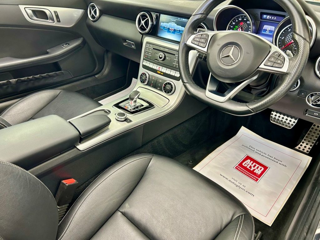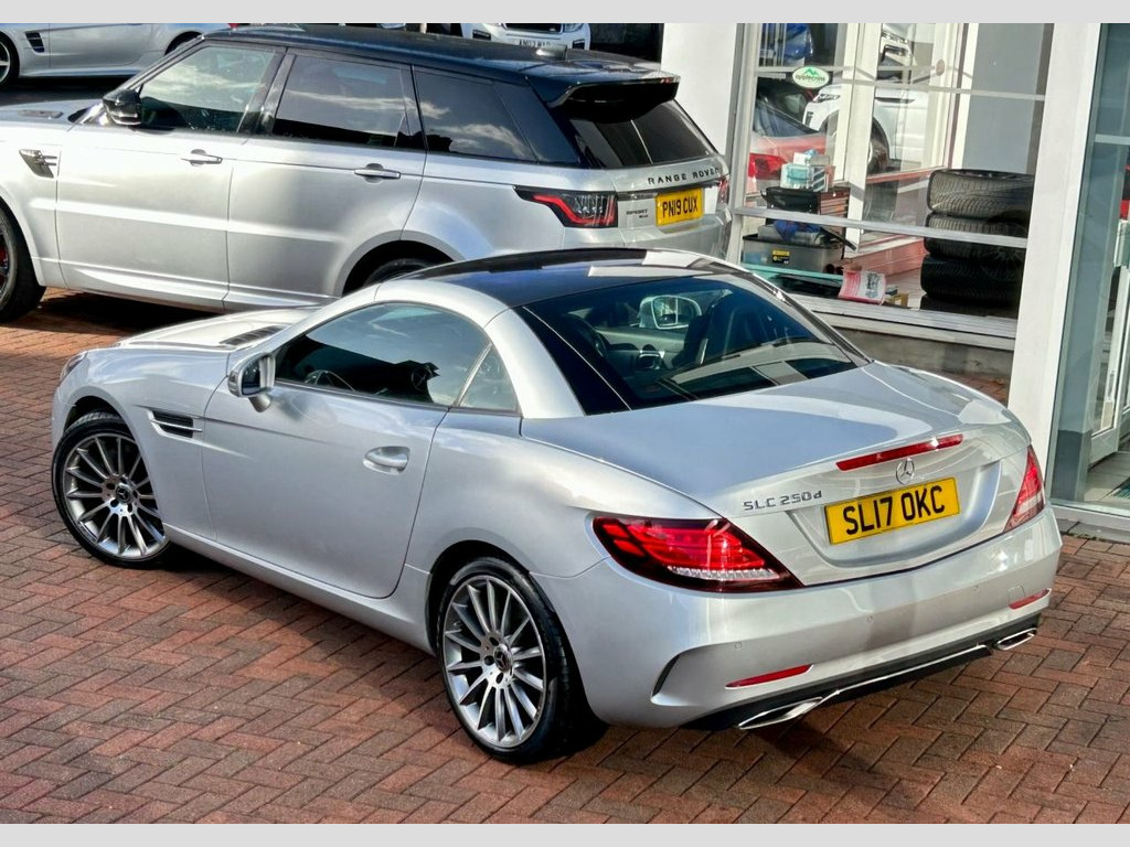 A Great Spec SLC 250d with AMG Line Trim level. Our Mercedes is presented in Iridium Silver with Black Leather Upholstery and 18 Inch Multi-spoke Alloy Wheels. Specification is Fabulous and includes a Panoramic Glass Roof, Bluetooth and Media Connectivity, 3 Stage Seat Heating, Mercedes Air Scarf, Cruise Control, Air Conditioning, Electric and Heated Mirrors, Front and Rear Parking Sensors and Switchable drive modes via Mercedes 'Dynamic Select' system. A great fun car, with loads of interior and luggage space and impressive miles per gallon for those longer trips away! Supplied with original handbook pack, 2 keys and service confirmation at 1617m, 3188m, 5551m, 12841m, 24525m, 38284m and 43414 miles AIRSCARF - Neck Level Heating System, Heated Front Seats, Iridium Silver, Leather - Black, Panoramic Glass Sunroof - Tinted